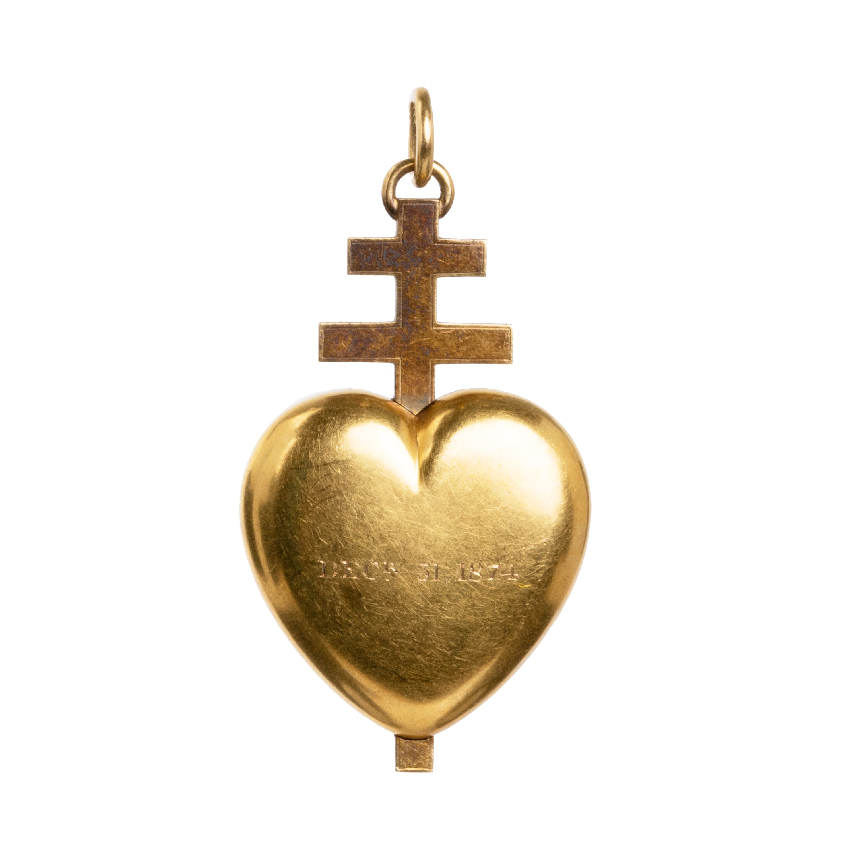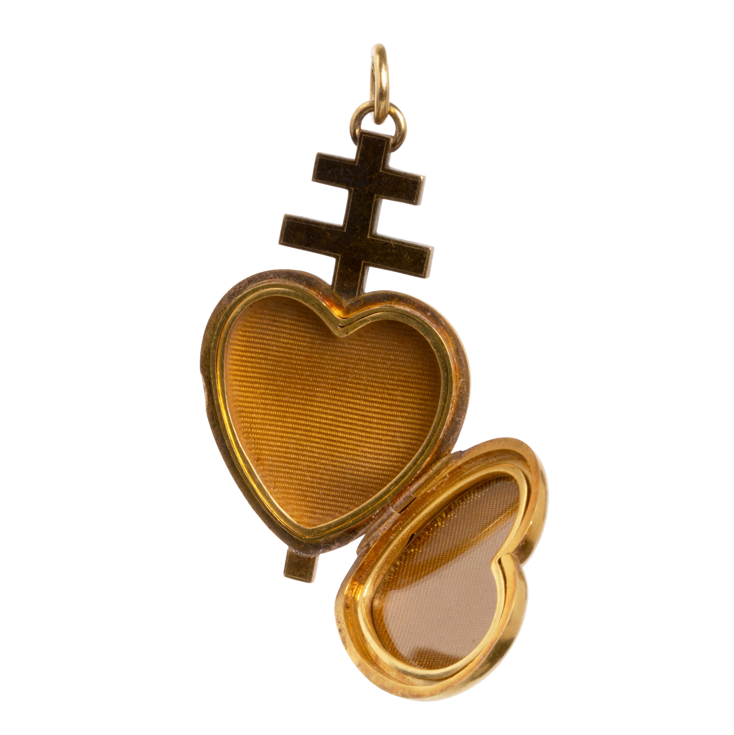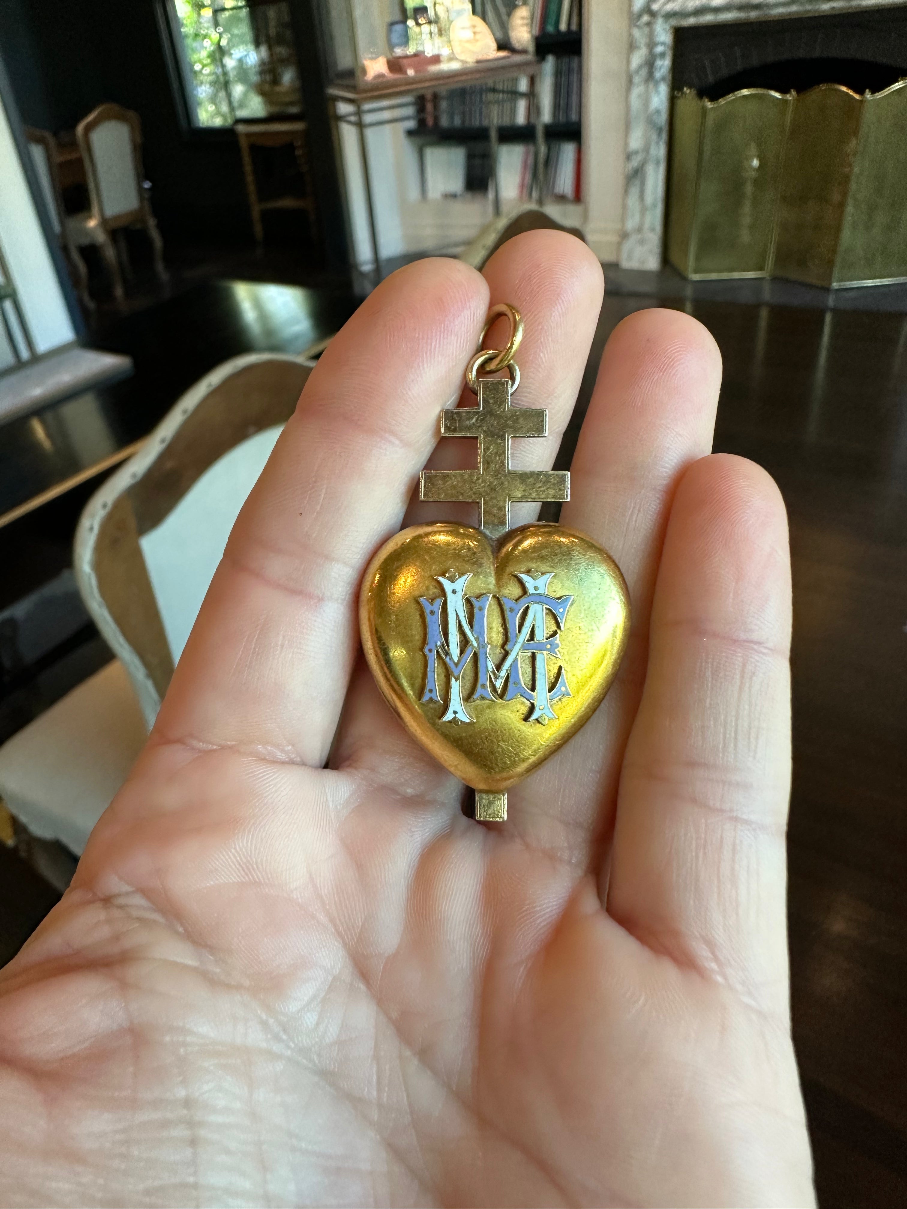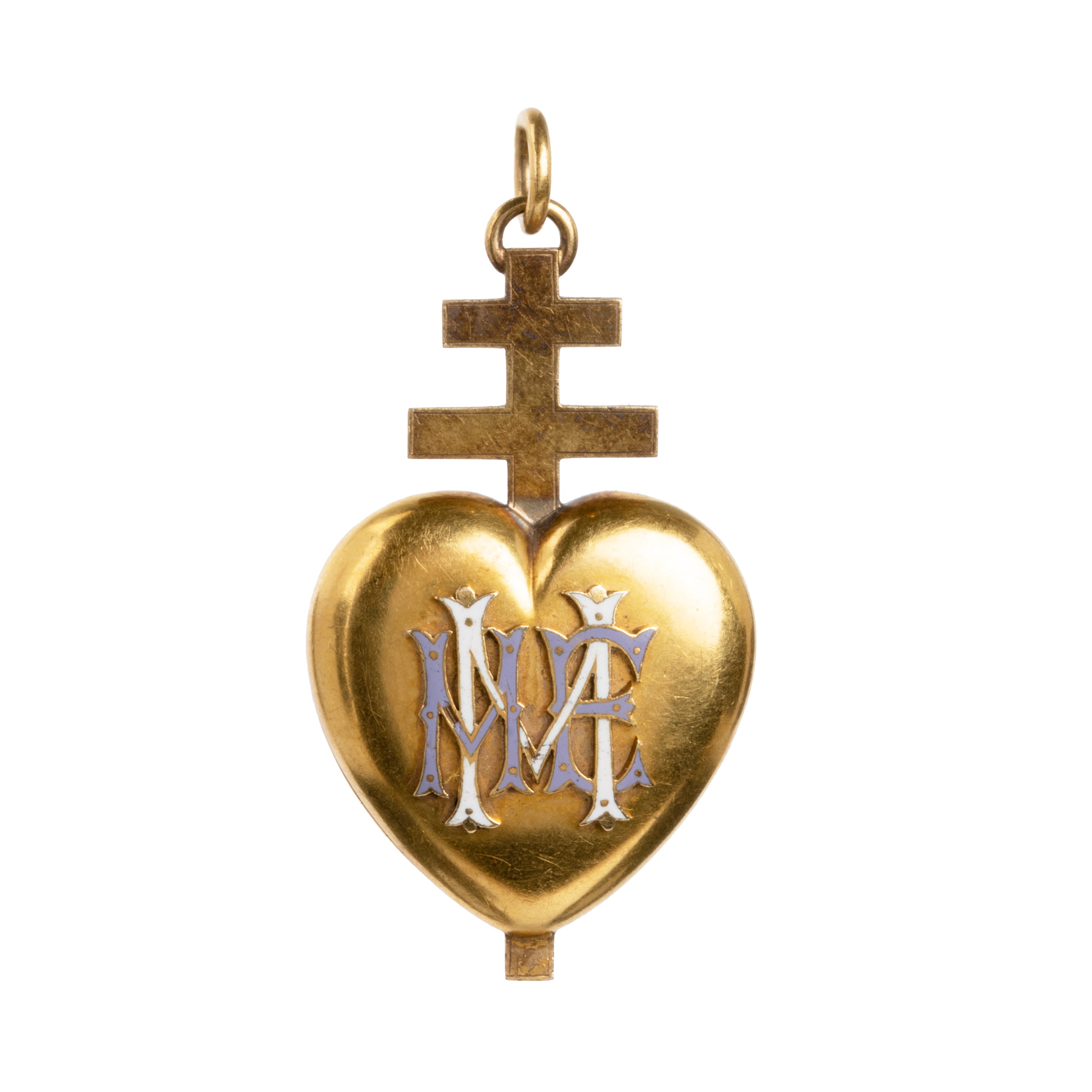 An unusual form heart locket with a two-barred cross in 18k gold with blue and white enamel monogram, MME or MEM. Often referred to as a Cross of Lorraine. Continental European in origin. Circa 1870.