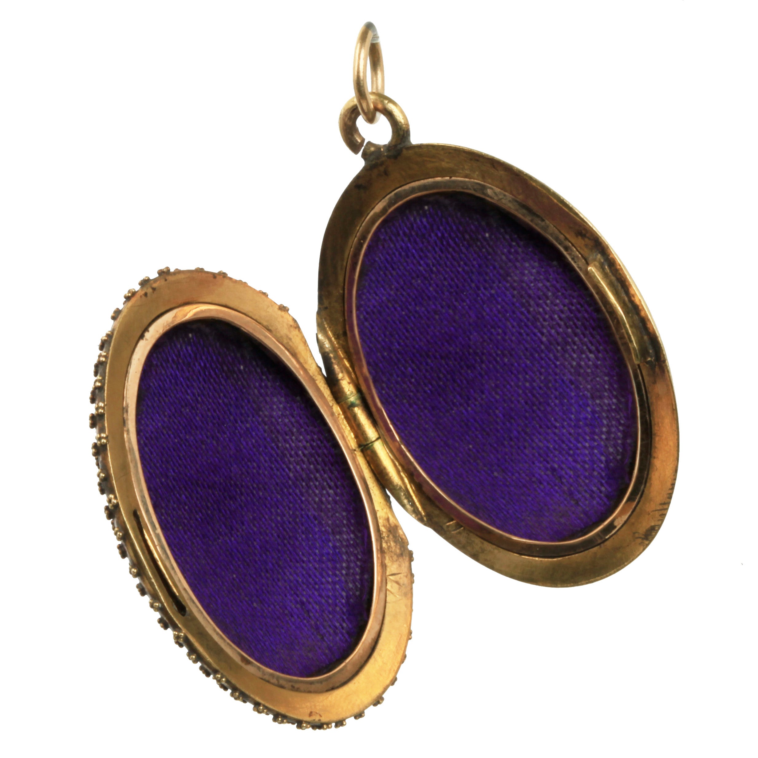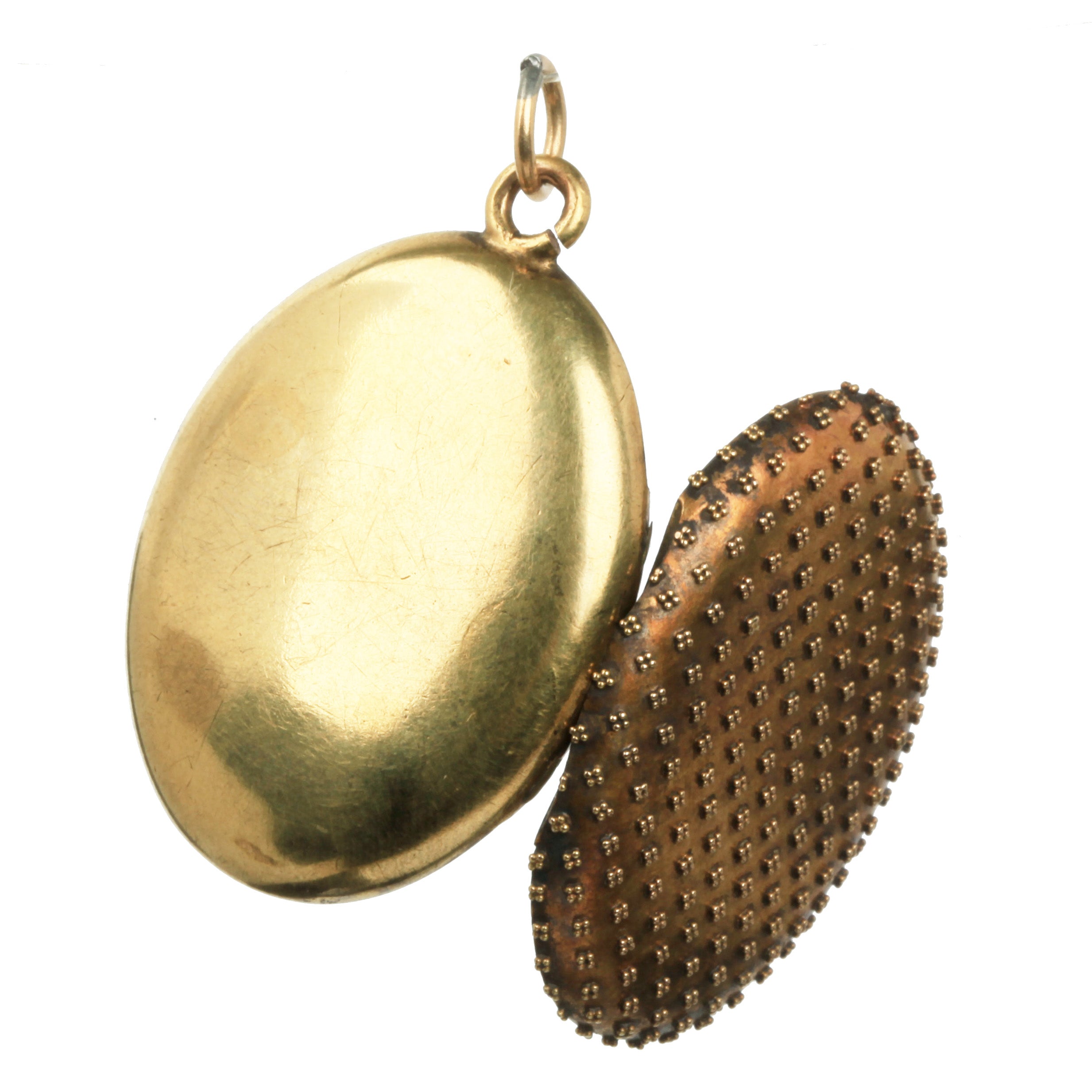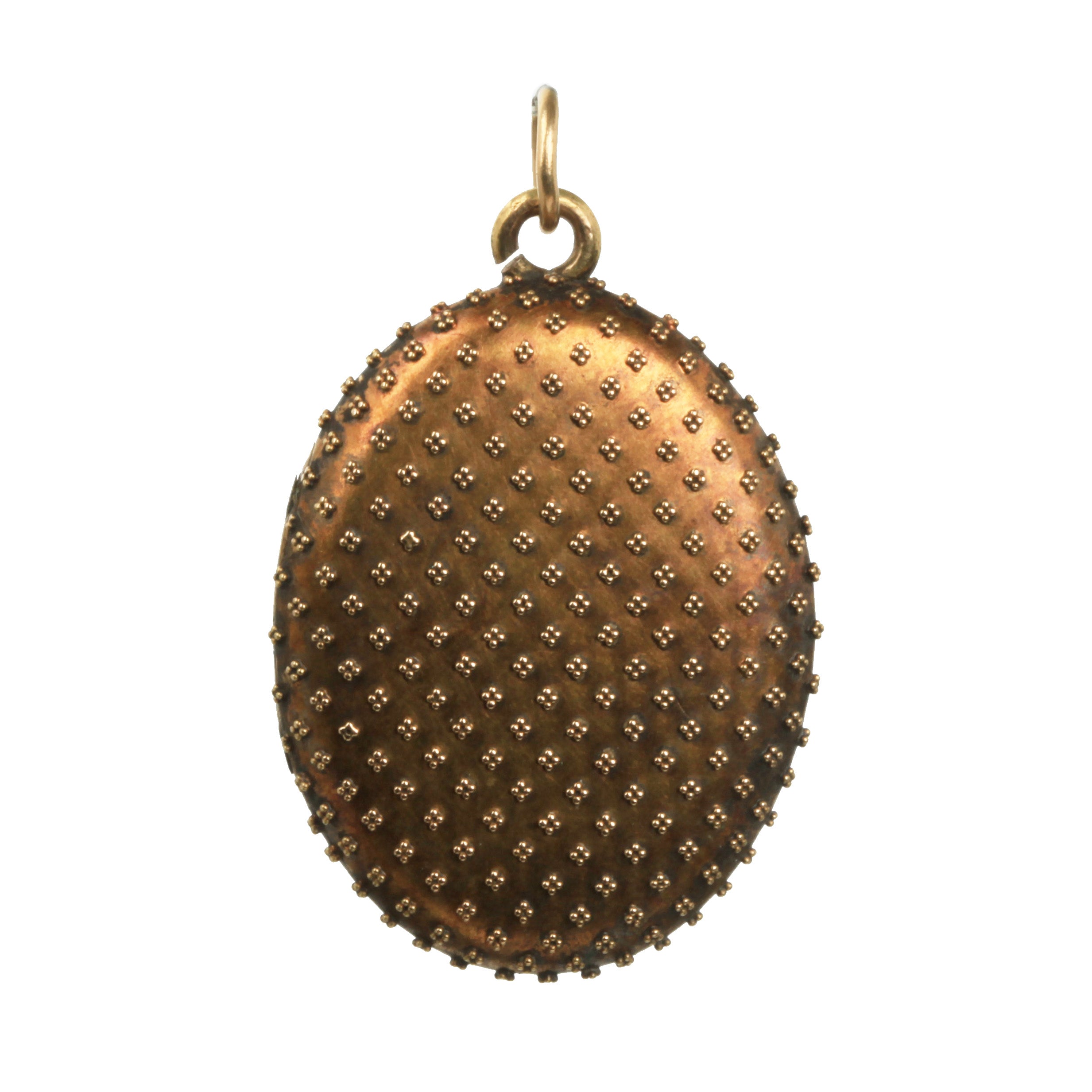 Victorian Locket with granulated detail, in 15k gold. Original frames intact but missing the original glass. The locket has a lovely dark patina, which highlights the texture and detail. English in origin, Circa 1870.