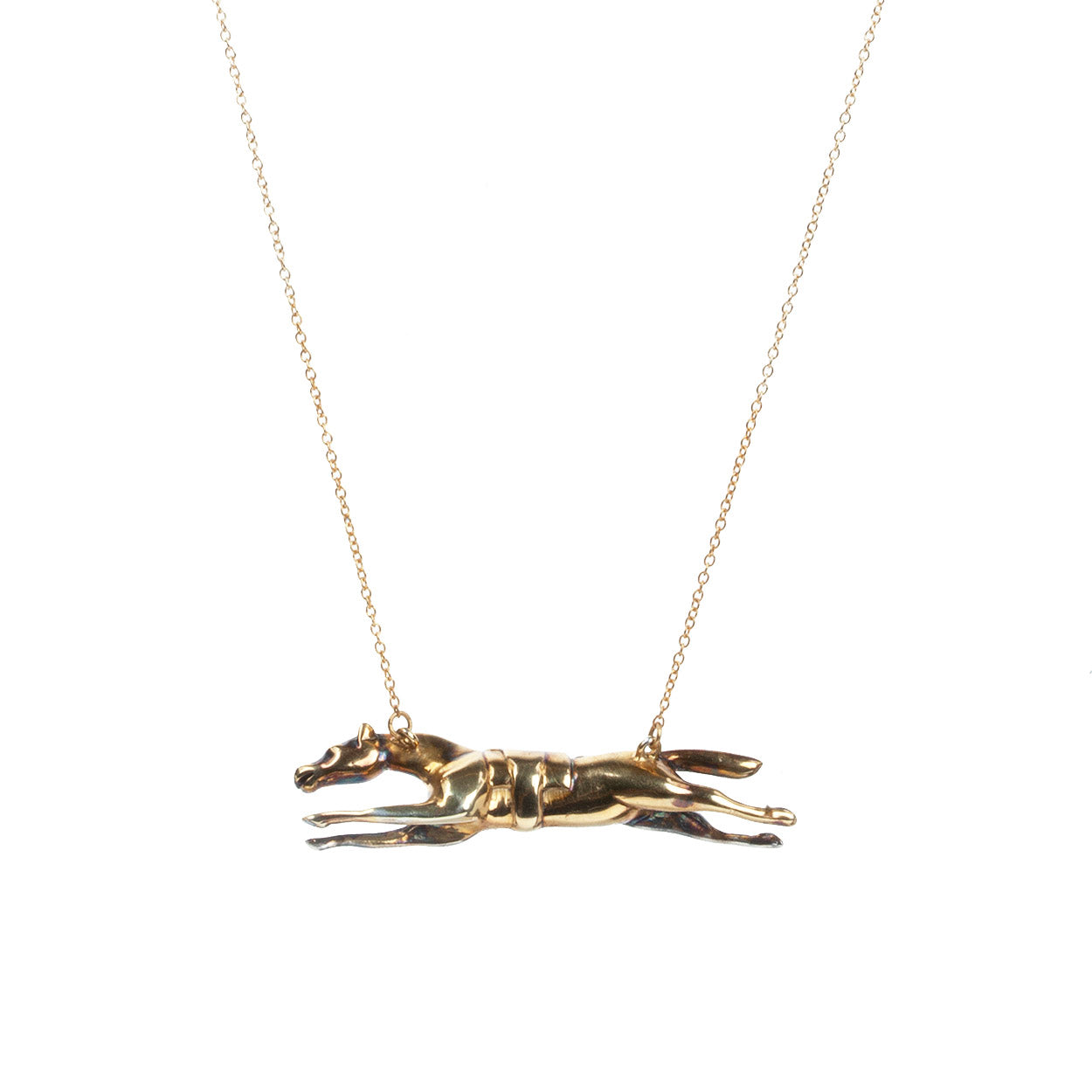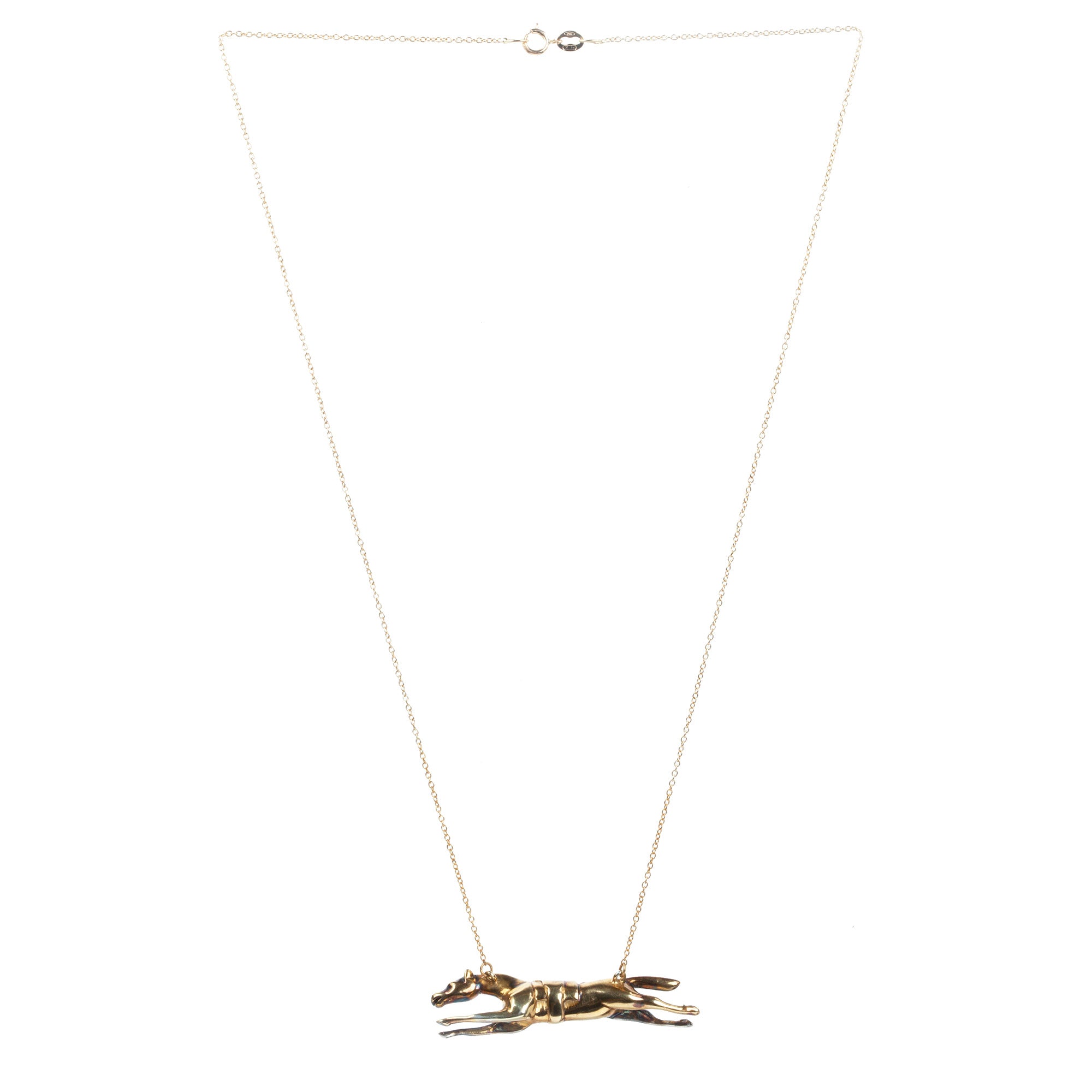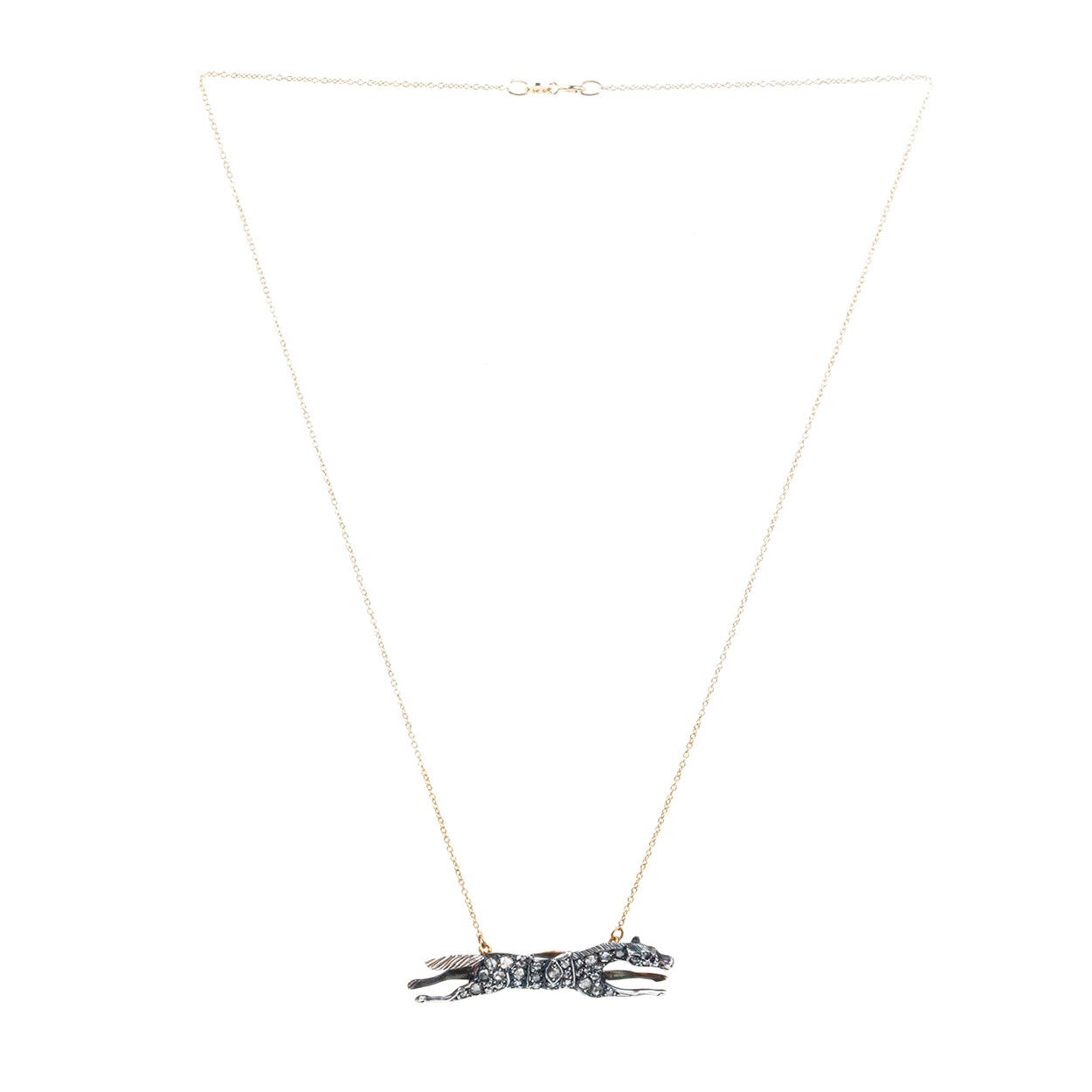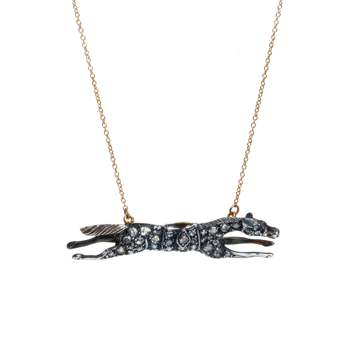 19th Century rose cut diamond jumping horse pendant, in silver topped gold. The pendant is hanging on a modern gold chain. This would have been originally a brooch or part of a larger piece of jewelry and later converted into a necklace. English in origin. Circa 1900.