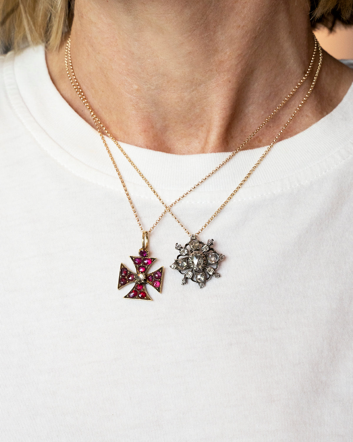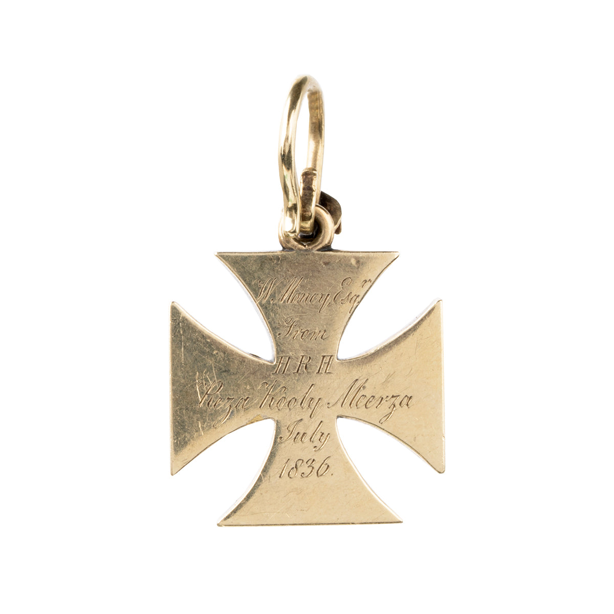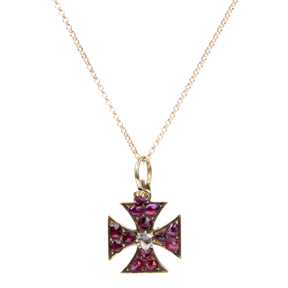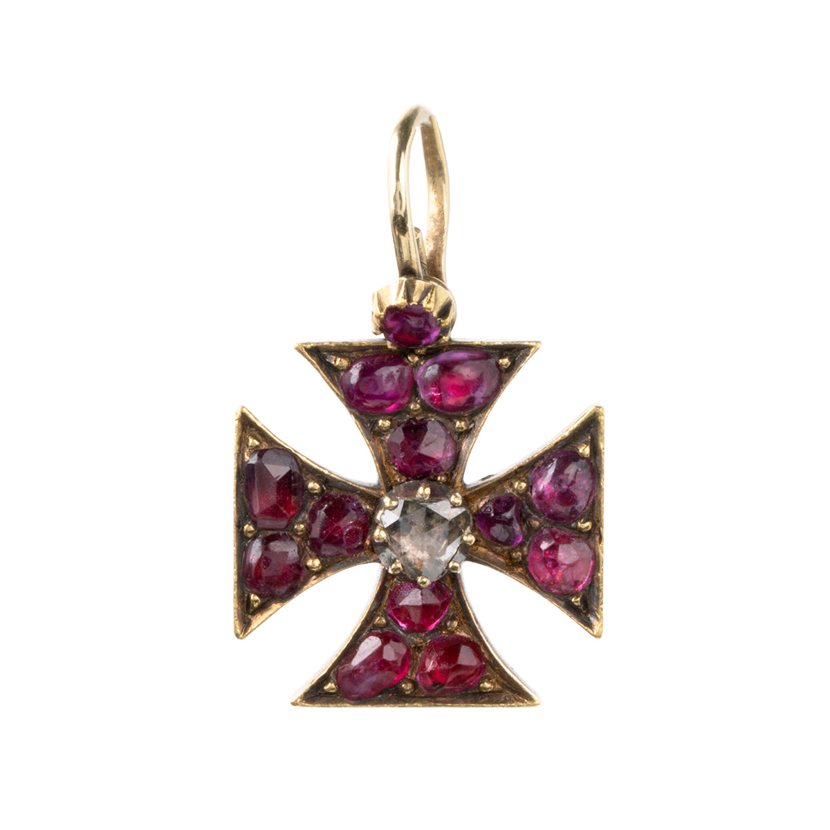 19th Century Maltese cross pendant with mixed cut rubies and a central rose cut diamond, set in gold. Hand engraved details on the back. English in origin. 1836.