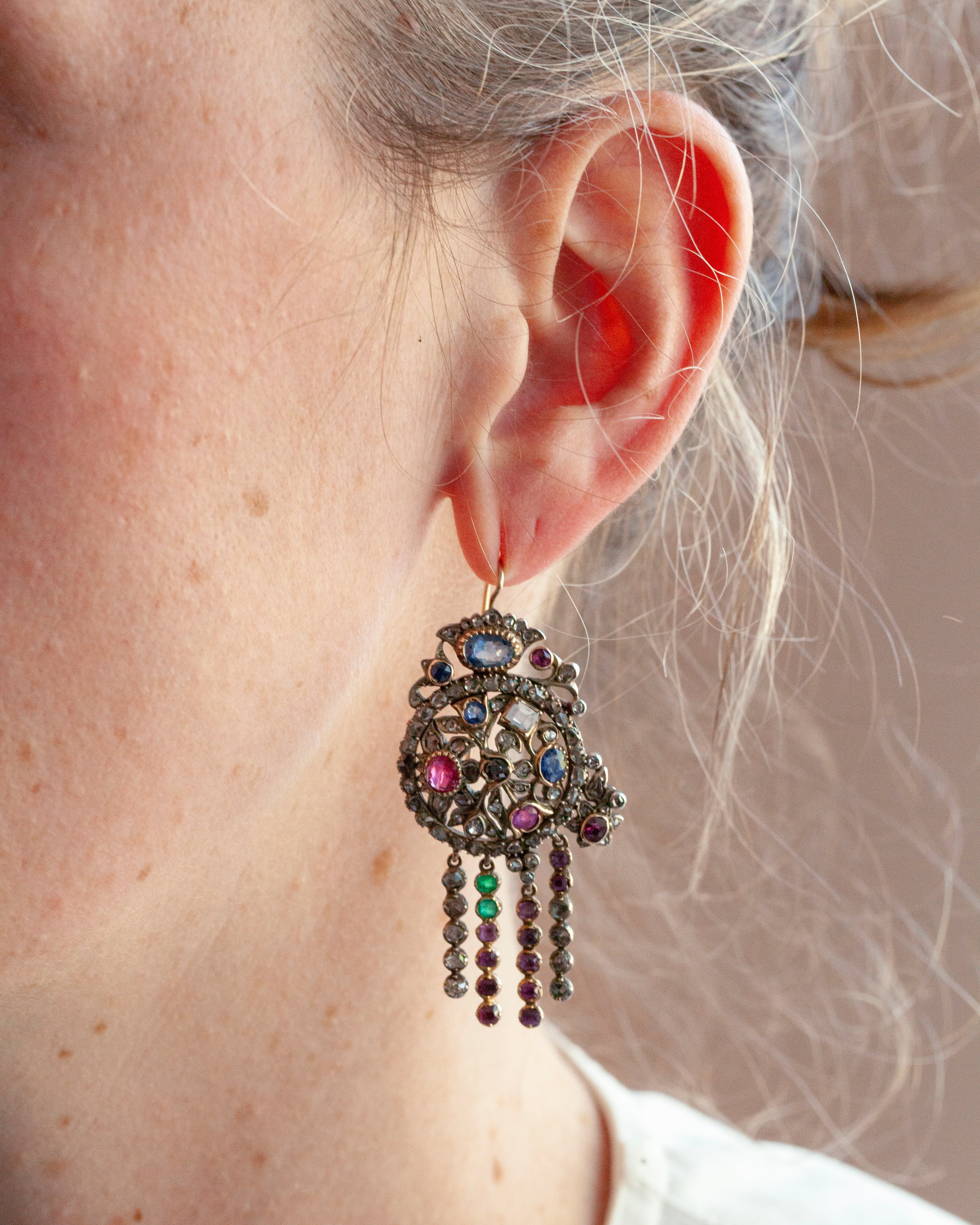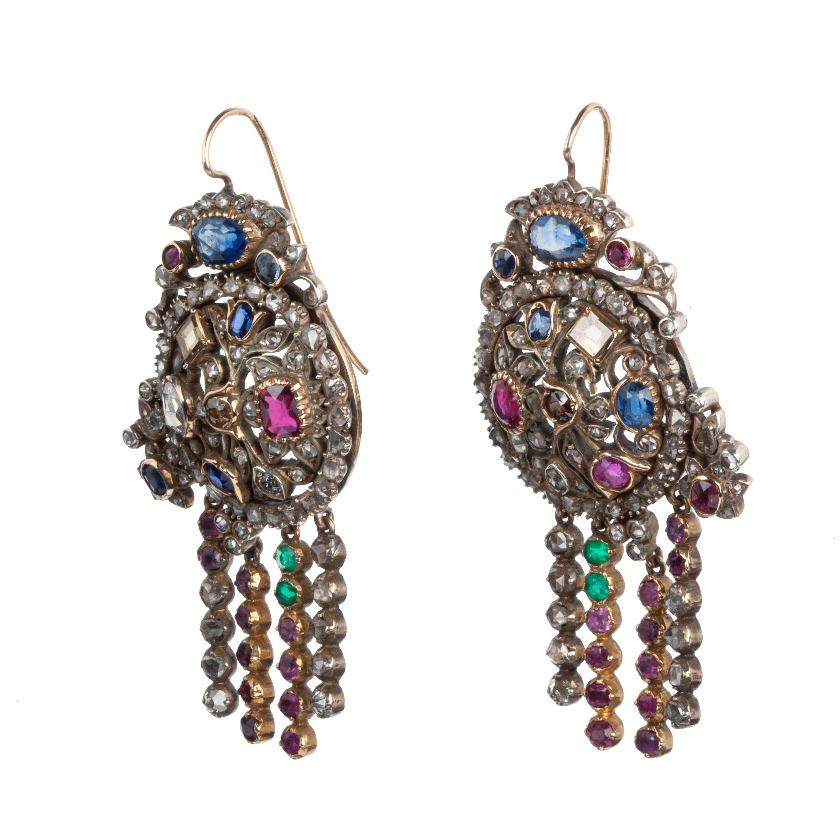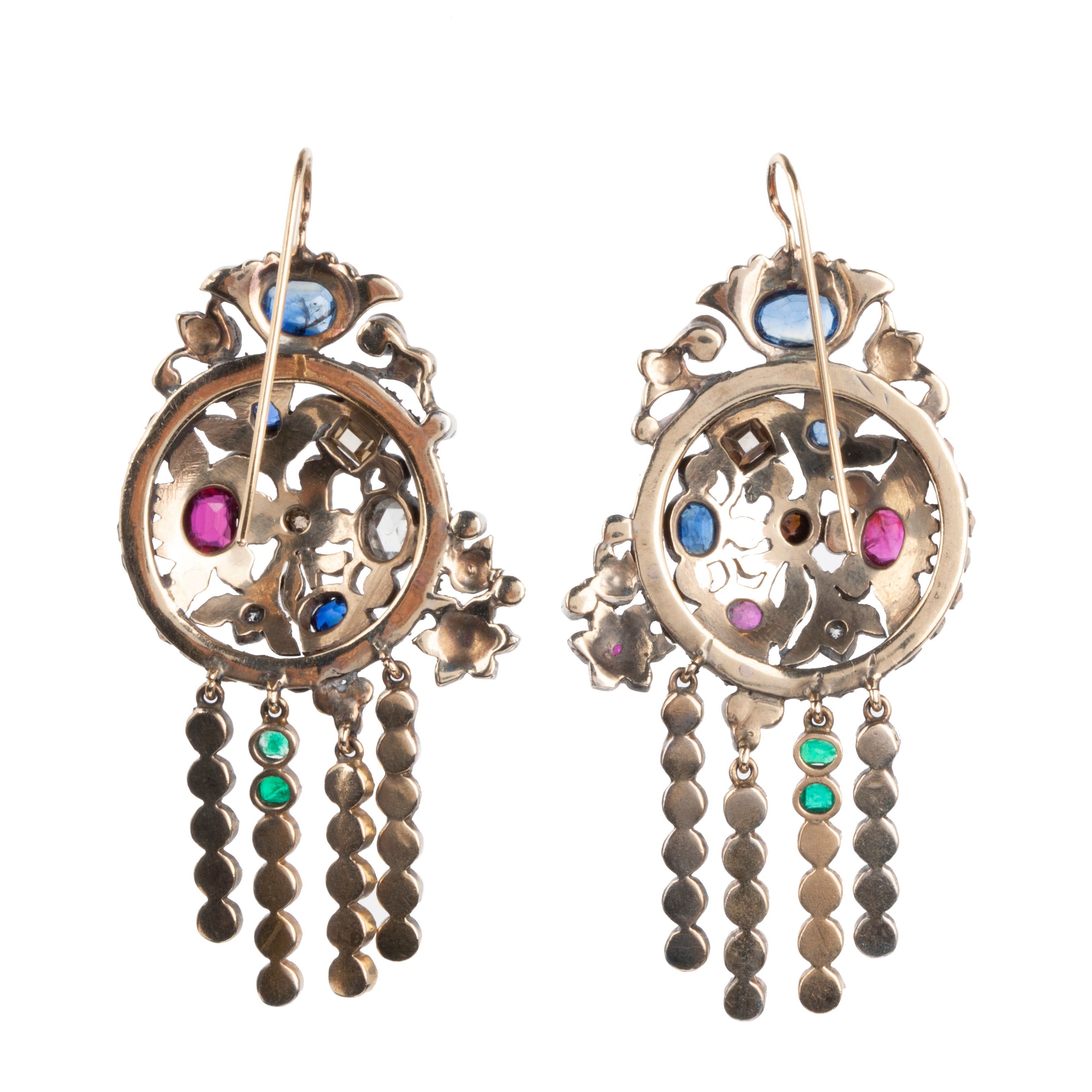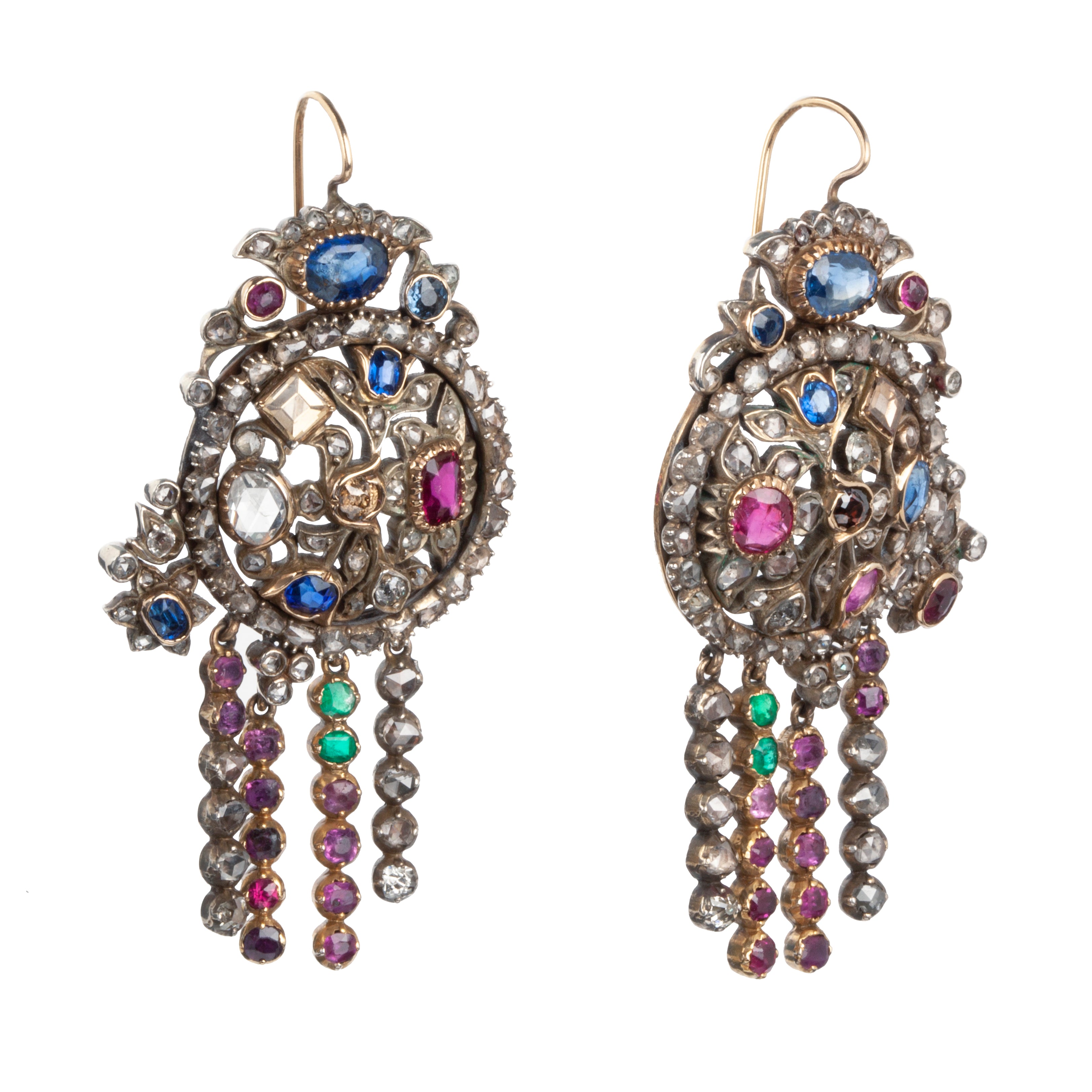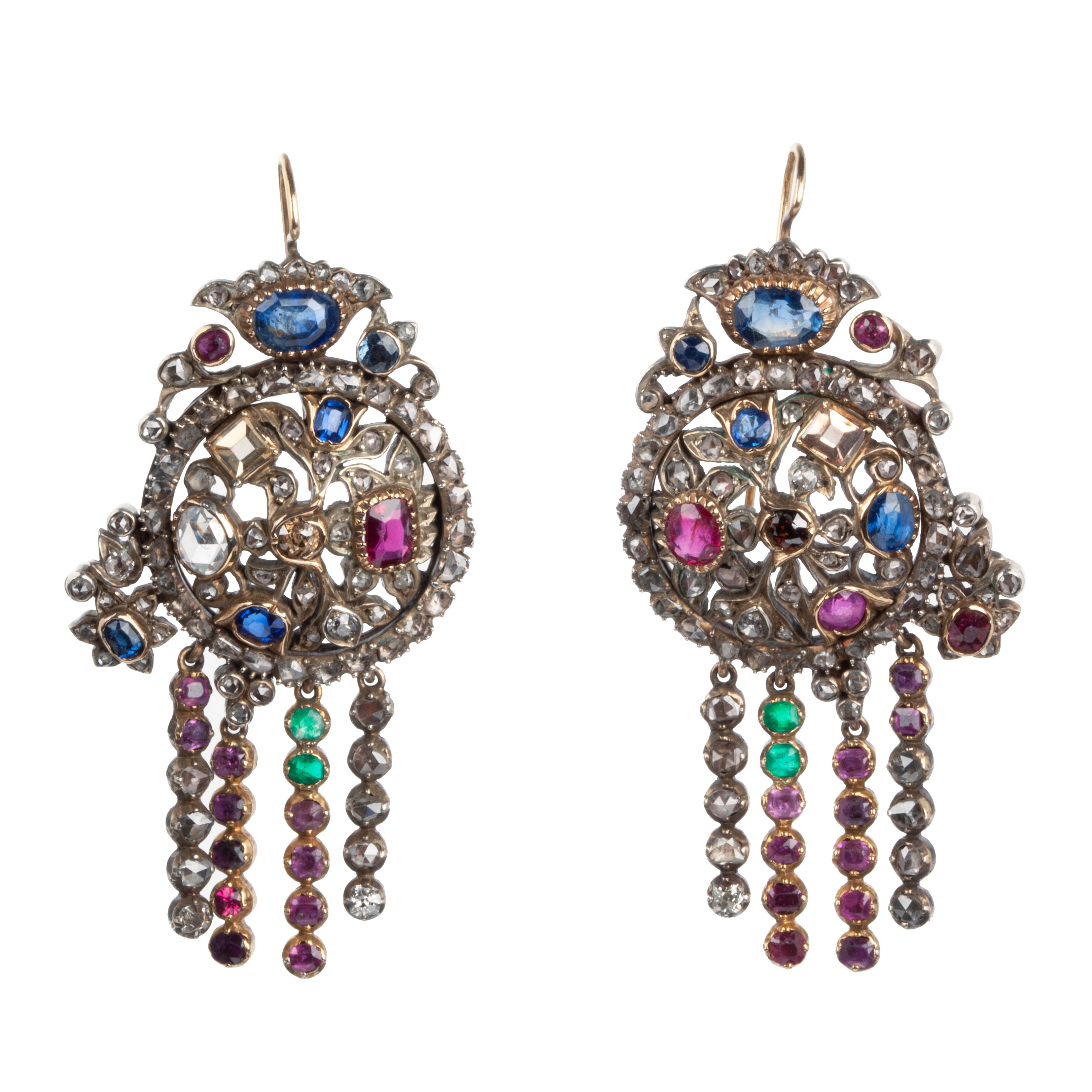 19th Century multi-gemstone pendant earrings. A beautiful combination of rose cut diamonds (approximately 4 carats), blue sapphires (approximately 2 carats), rubies (approximately 1.5 carats), 2 table cut champagne diamonds and 4 emeralds. The gemstones are in floral motif, set in silver topped gold settings. Once part of a larger piece of jewelry and then converted into drop earrings. European in origin. Circa 1890.