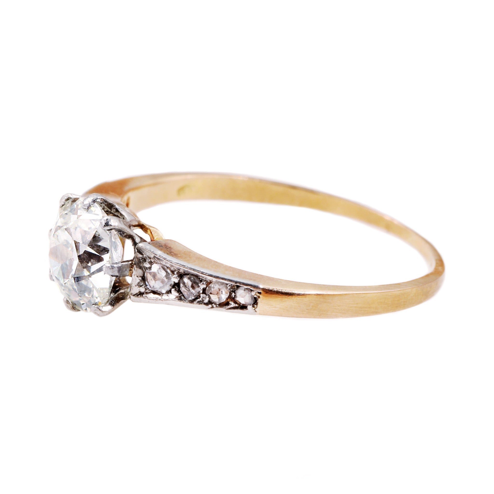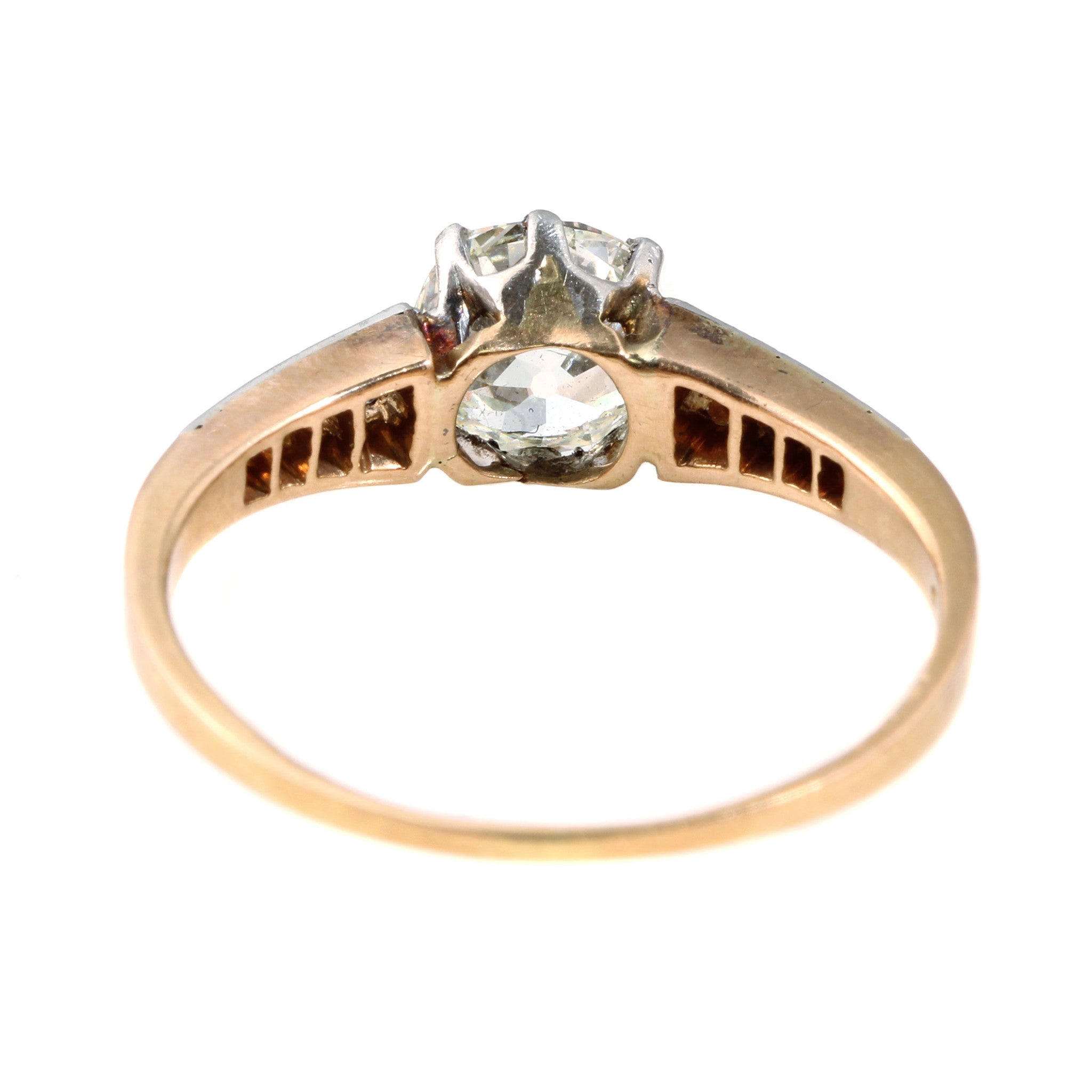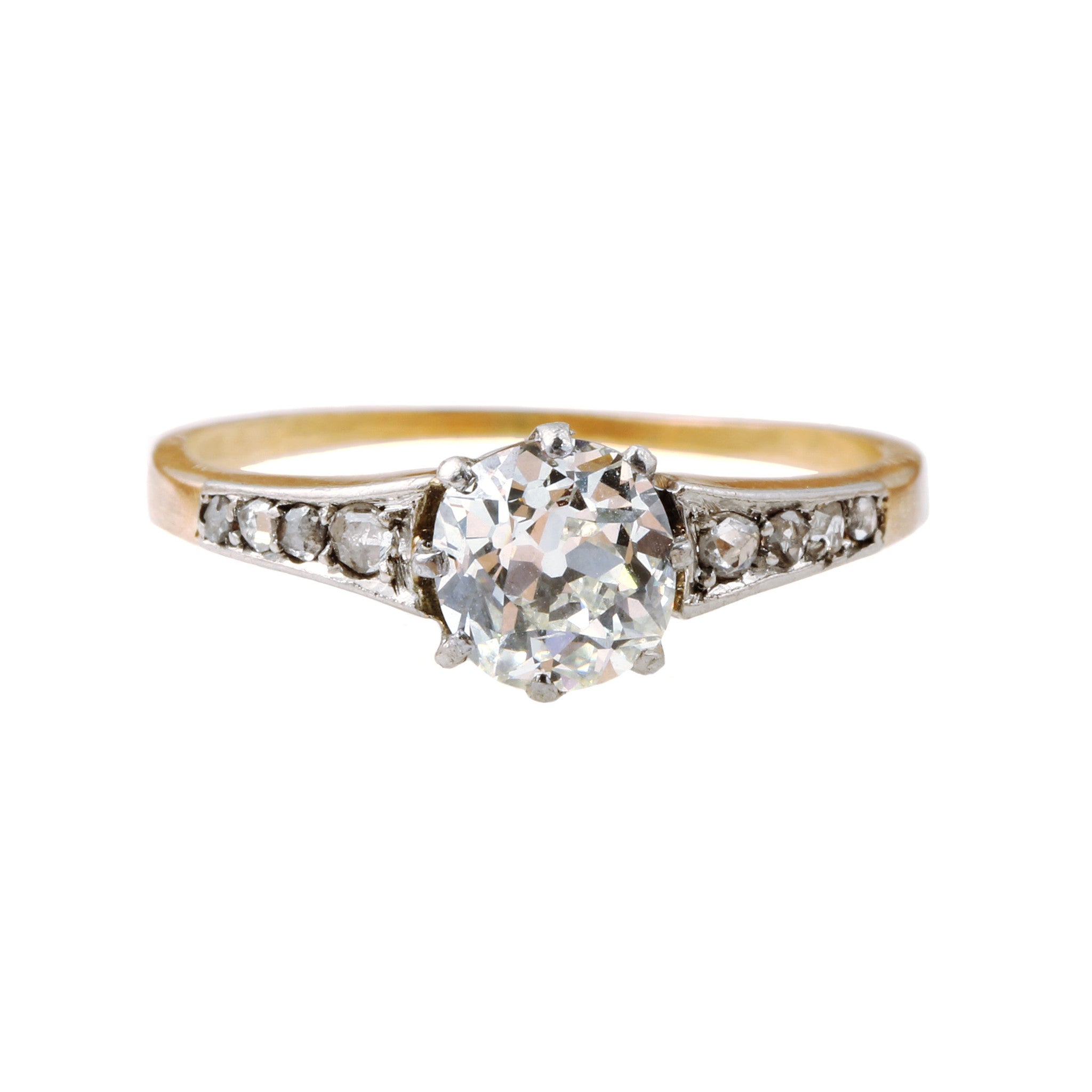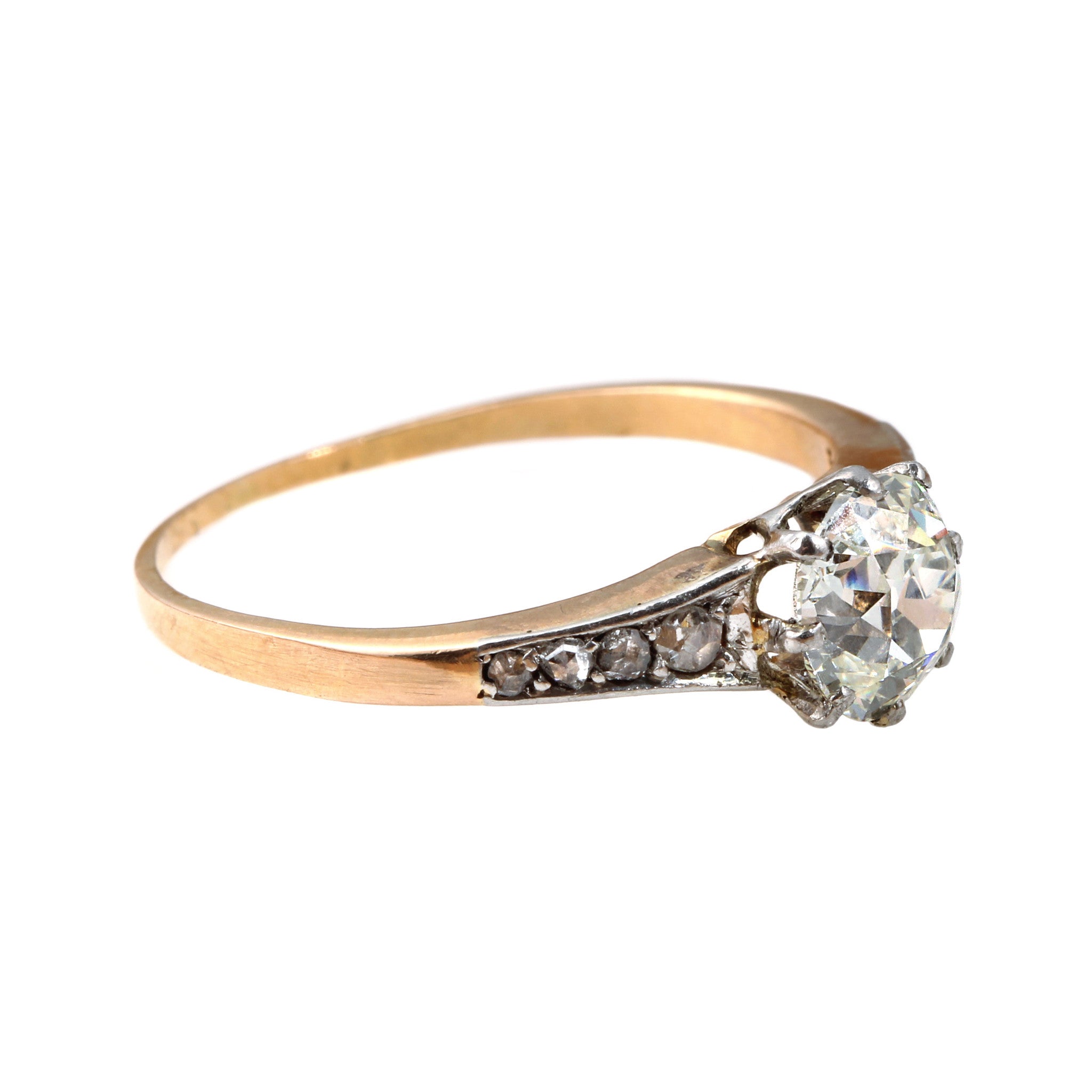 Late 19th century diamond ring. Center stone is approximately .8 carats with 8 rose cut diamonds flanking each side. The stones are set in platinum while the rest of the ring is in 18k rose gold. Circa 1890.