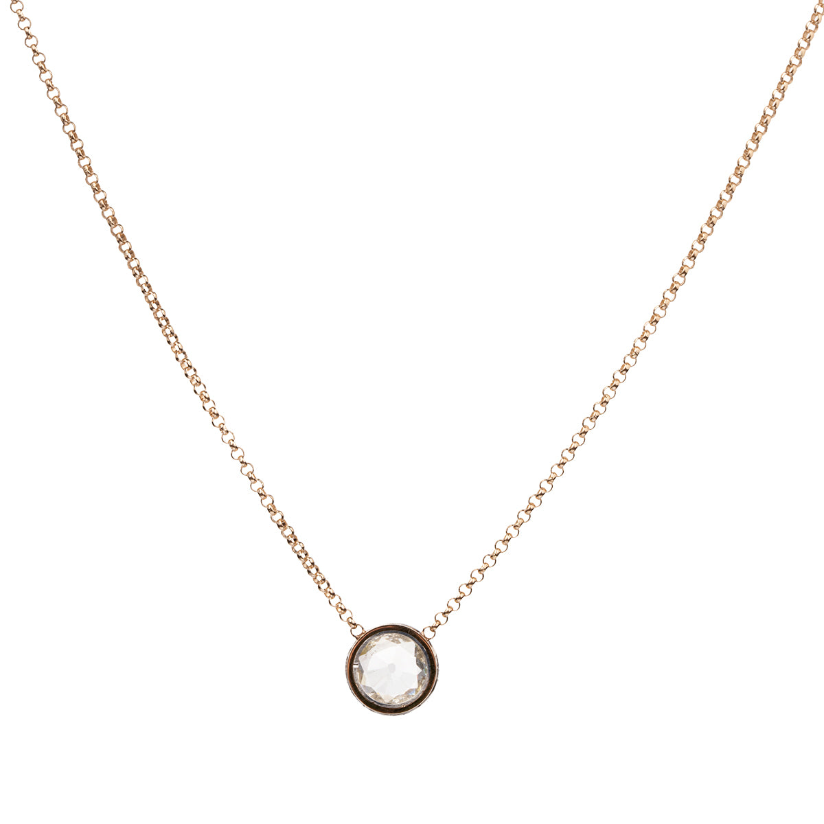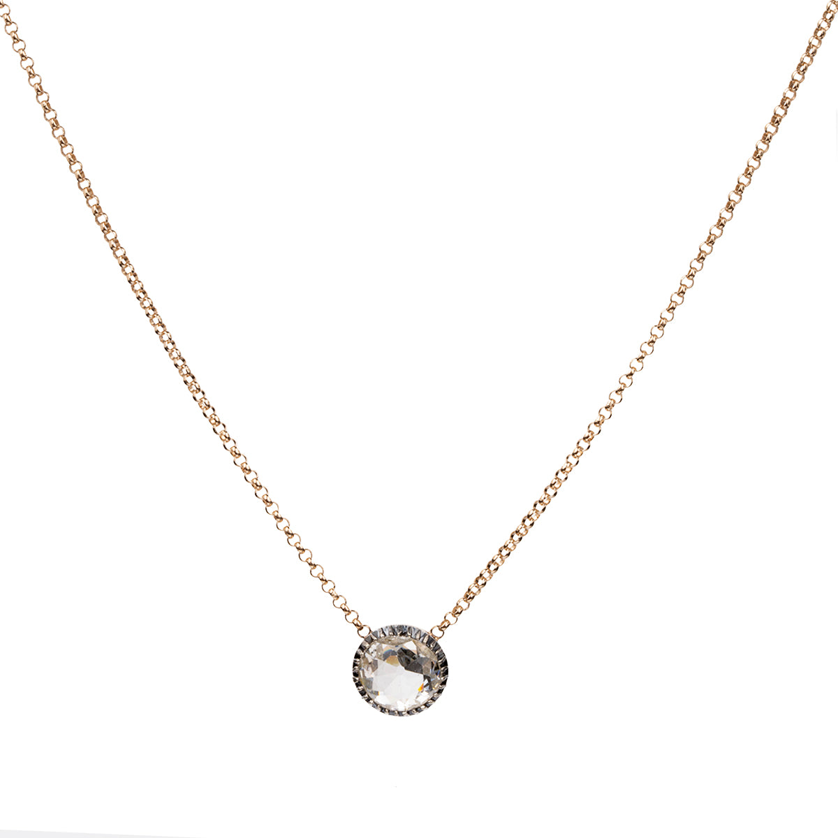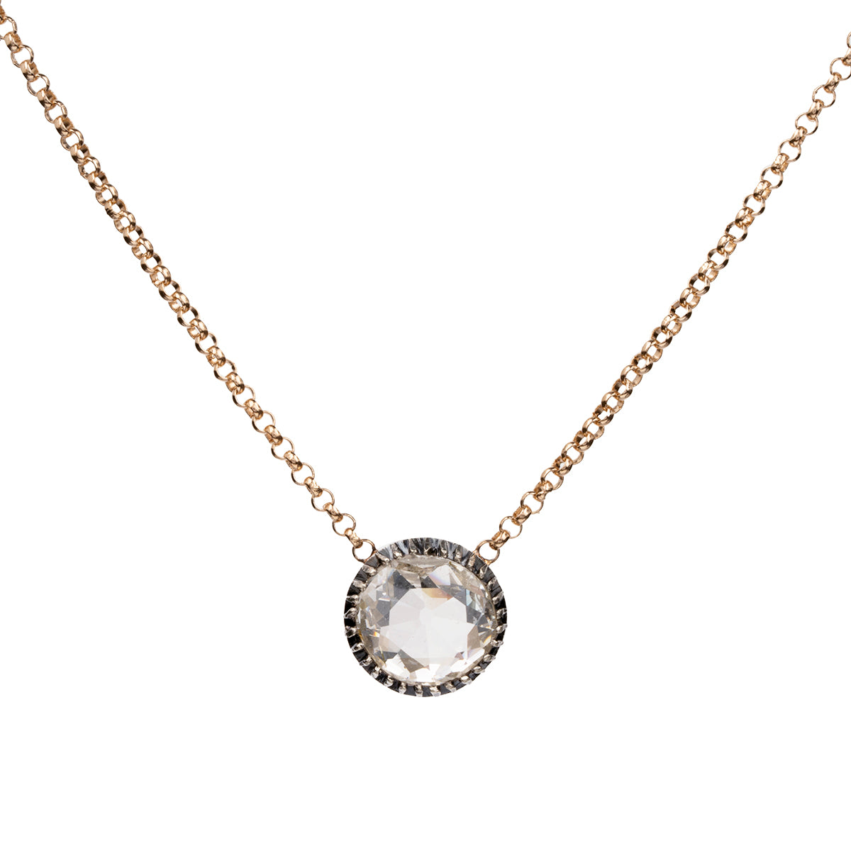 A simple floating diamond necklace. The diamond is in silver topped gold cutaway setting. Approximately 1 carat, J color and SI1 clarity. Originally the center of a large flower brooch and converted into a pendant necklace. The unusual flat proportions of the stone make the stone appear larger than its weight, facing up more like a 2 carat stone. Hanging on a modern 14k gold cable link chain. Diamond and setting, English in origin. Circa 1860.