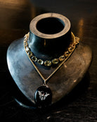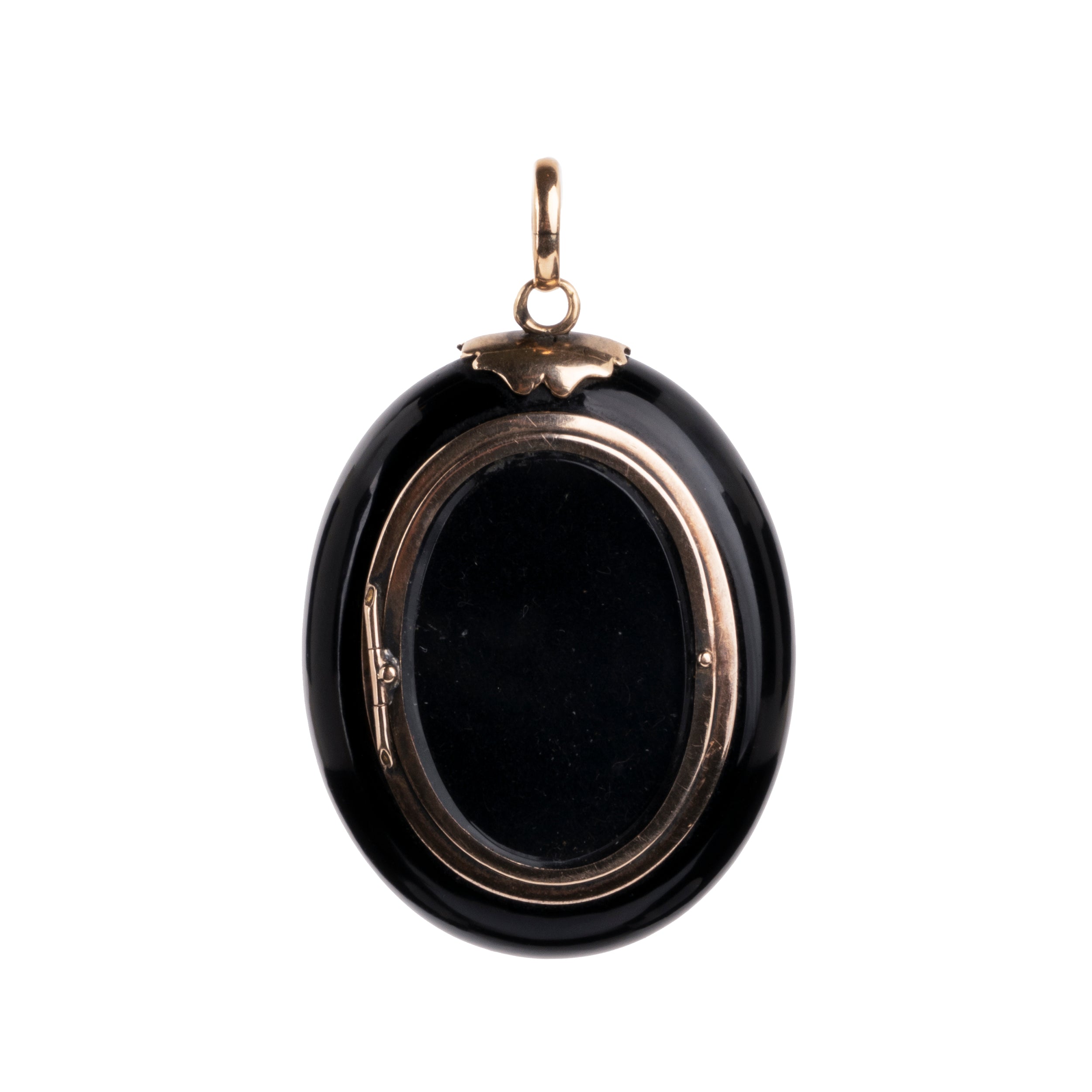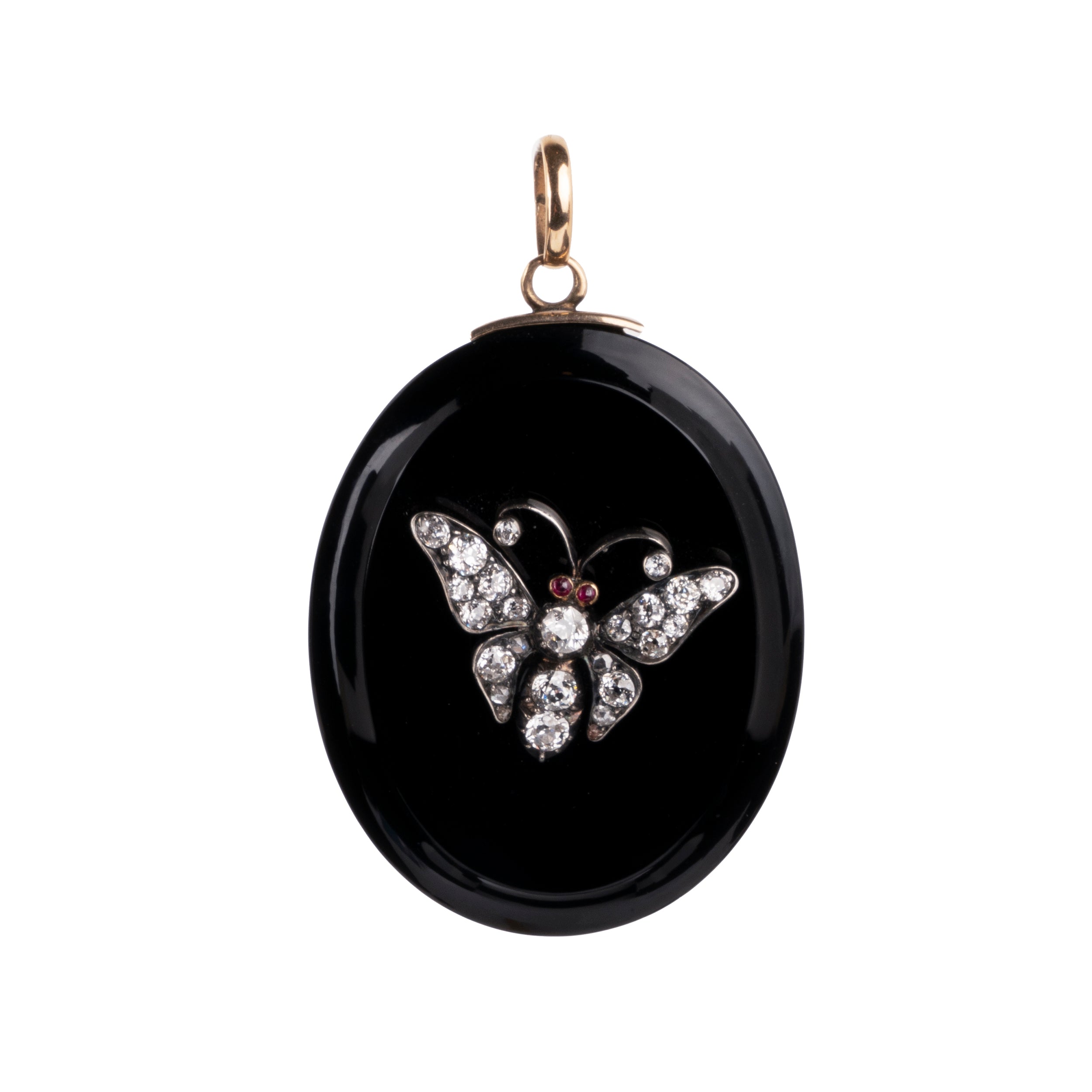 The butterfly was a common motif in 19th-century jewelry, often representing the beauty of transformation or new beginnings. This locket is made from a carved onyx stone with a glass compartment on verso with 15k gold details. The butterfly is set with old mine-cut diamonds and garnets for eyes. England, circa 1870.