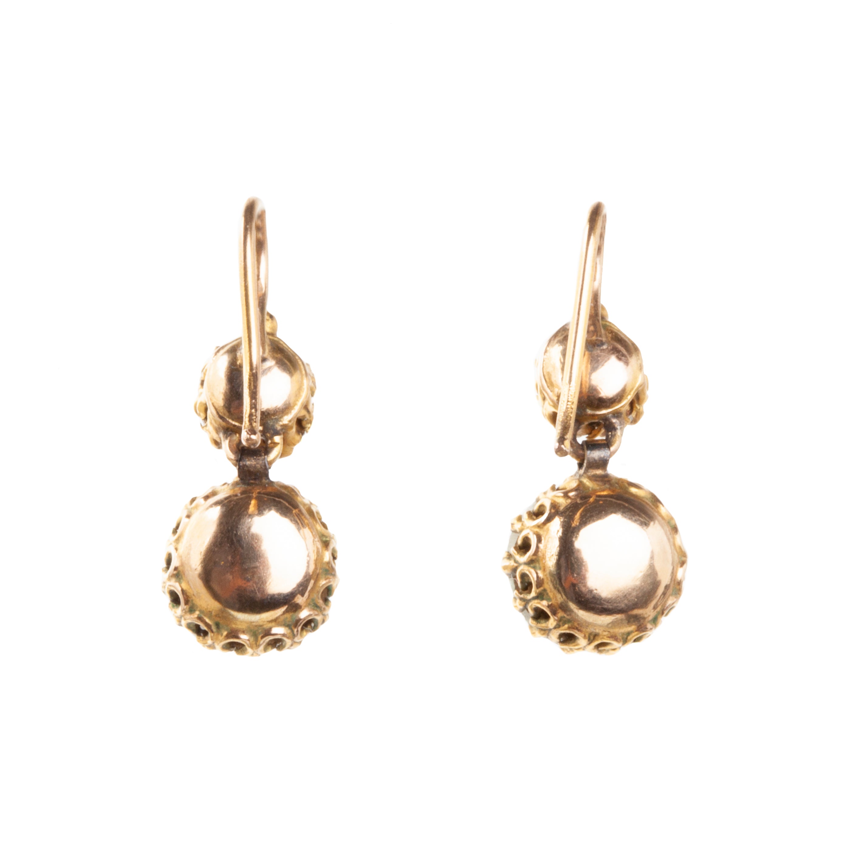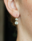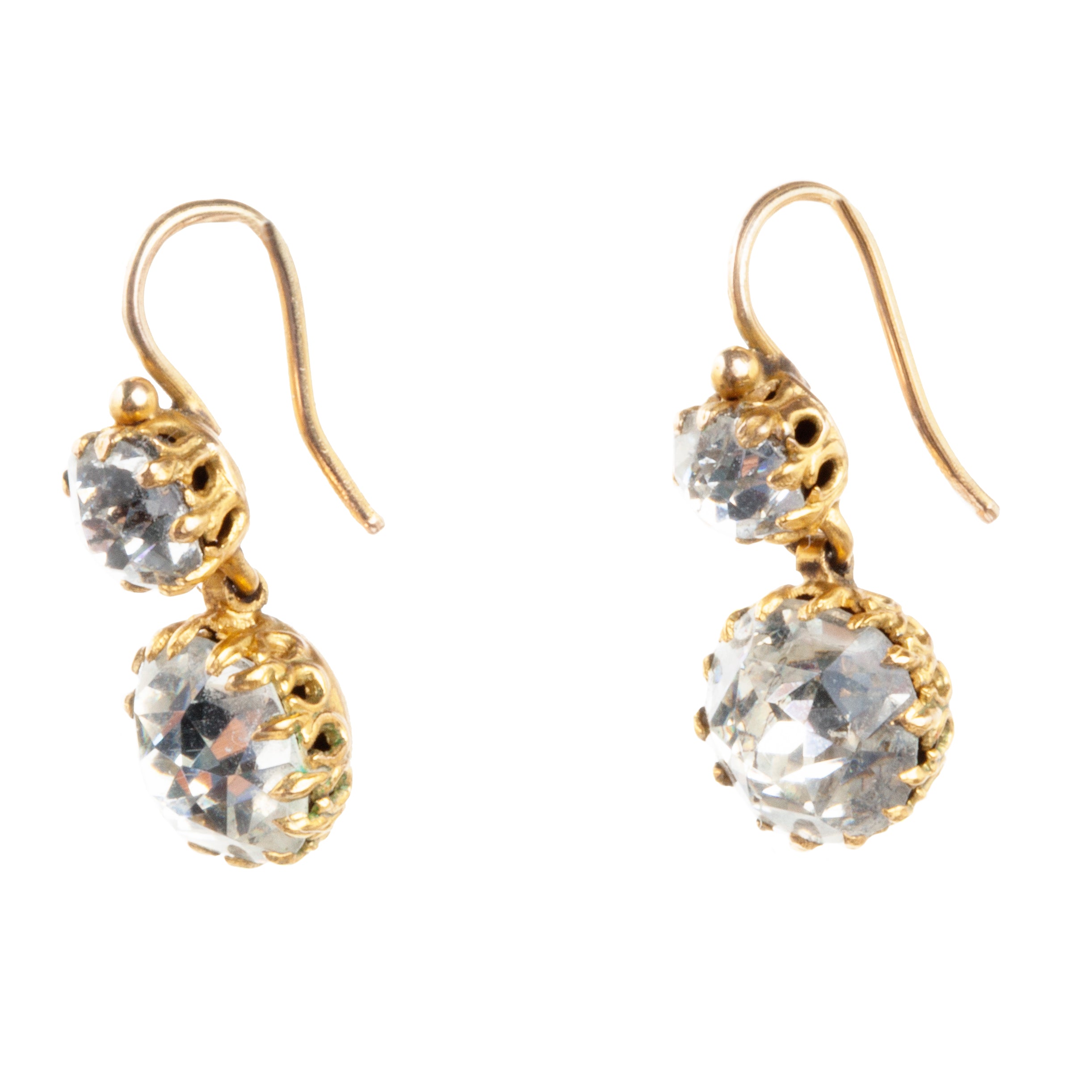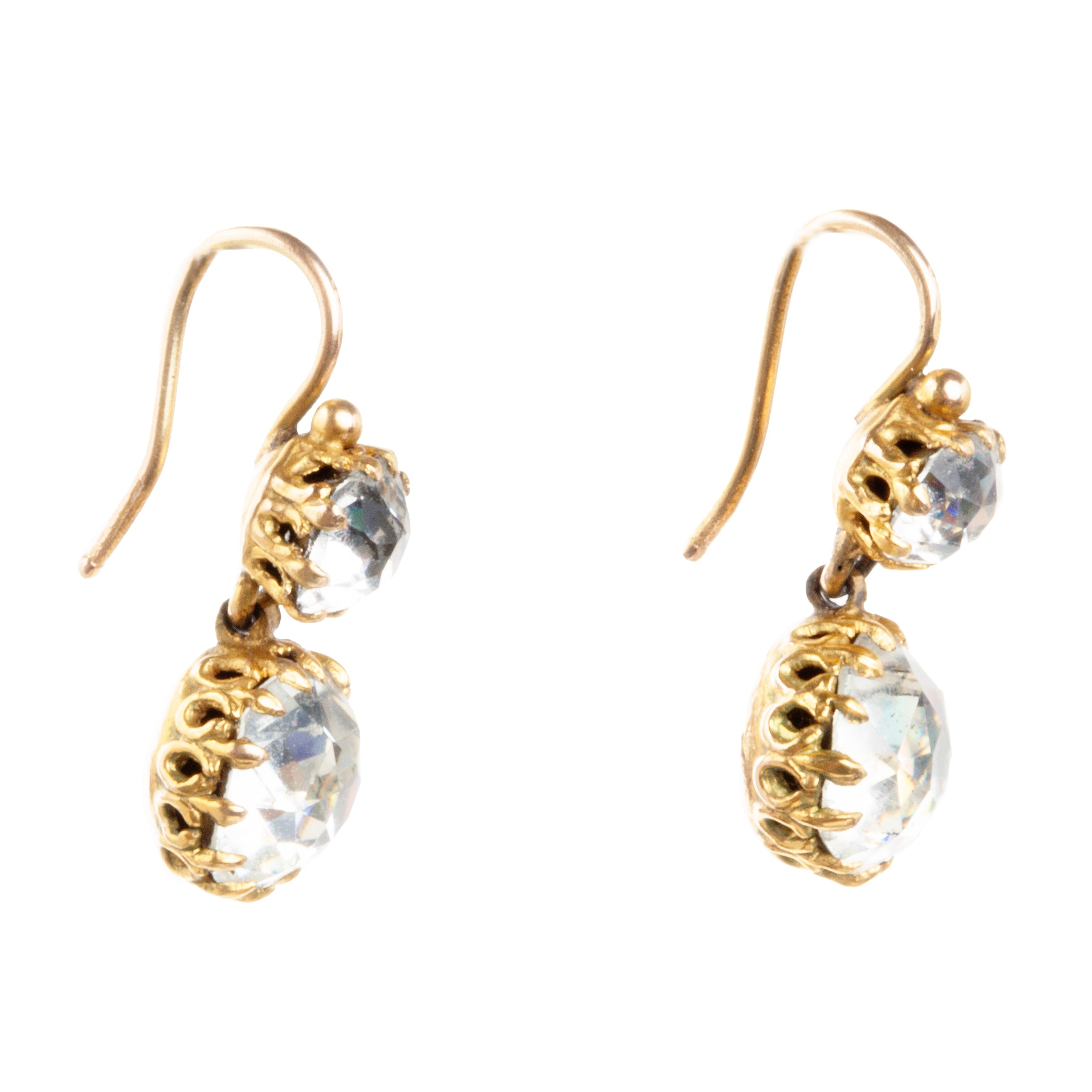 19th Century double drop white paste earrings. Lovely white colored paste stones are set in the foiled back gold settings. On gold earring wires. English in origin. Circa 1860.