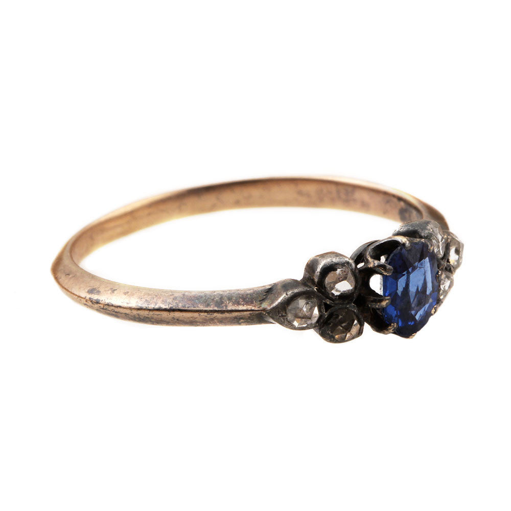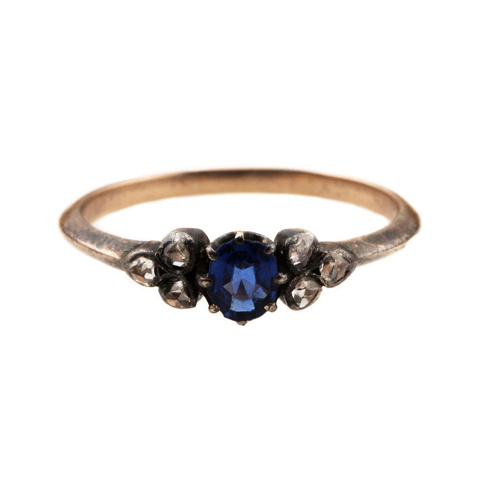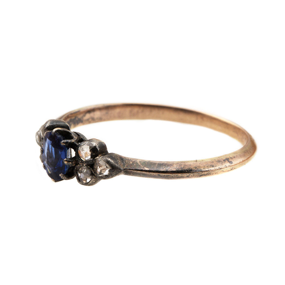 A lovely petite sapphire & diamond ring that dates to the mid 19th century. The rose gold metal has acquired a beautiful patina over the last 150 years although it could easily be polished to a bright finish. There are six rose cut diamonds set in silver flanking a central oval shaped natural sapphire. The band has a knife edge detail.