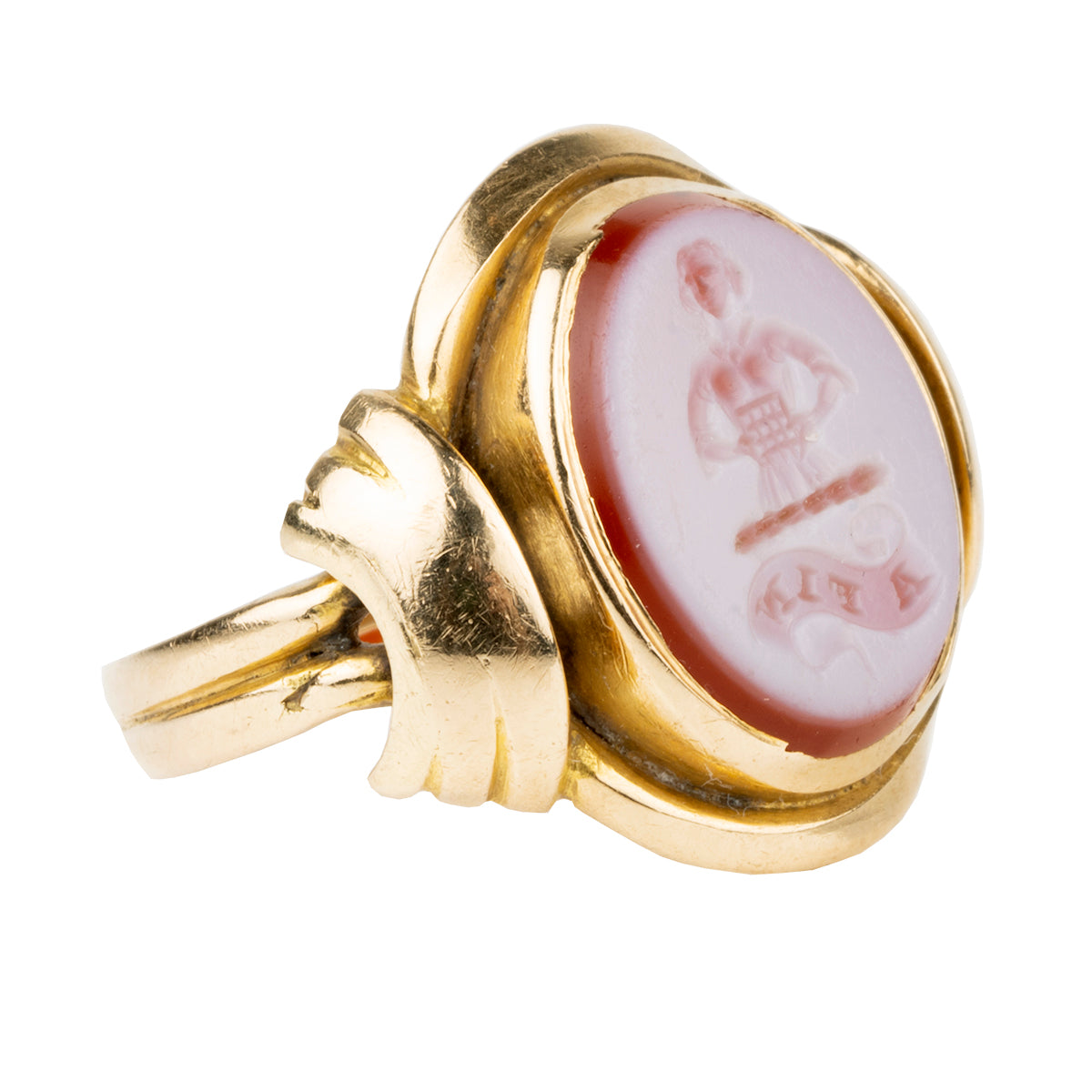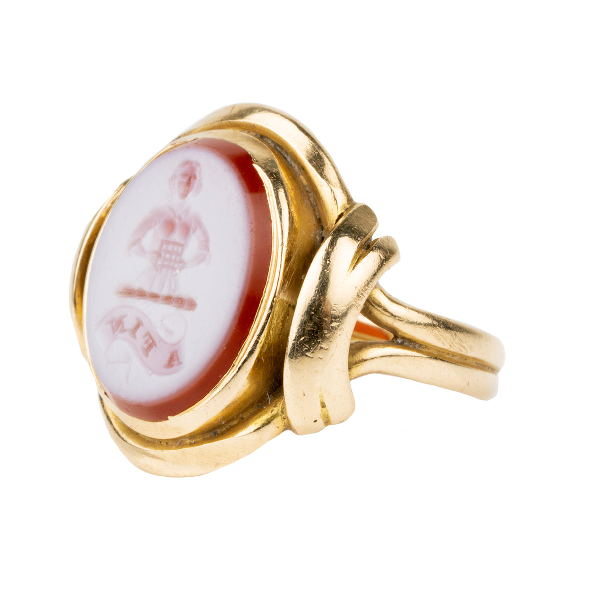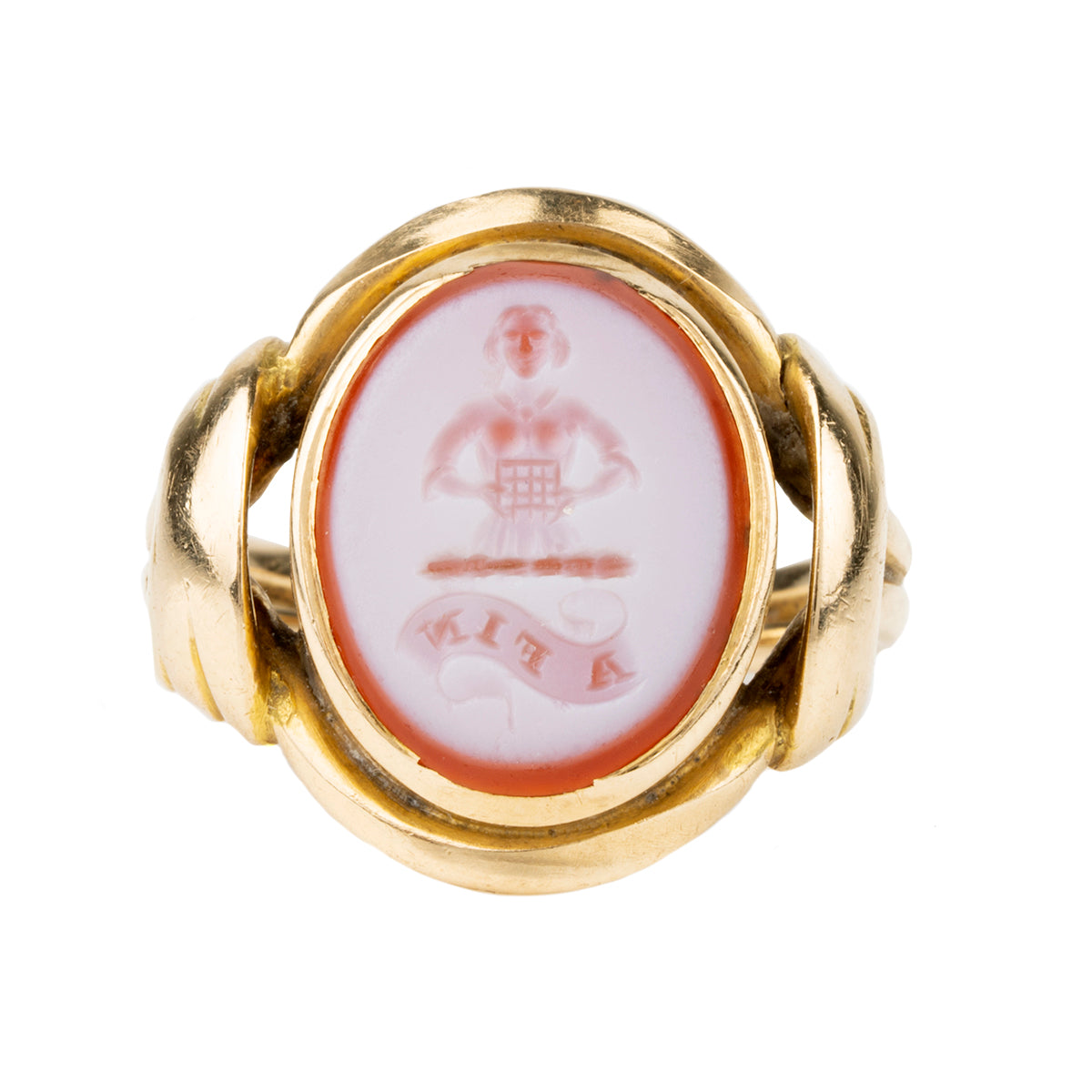 19th-century hardstone signet ring, in 18k gold. The carved intaglio depicts the Ogilvie Scottish clan crest, a woman holding a portcullis, and the Latin motto "A Fin," "To the End." English in origin. Circa 1880.