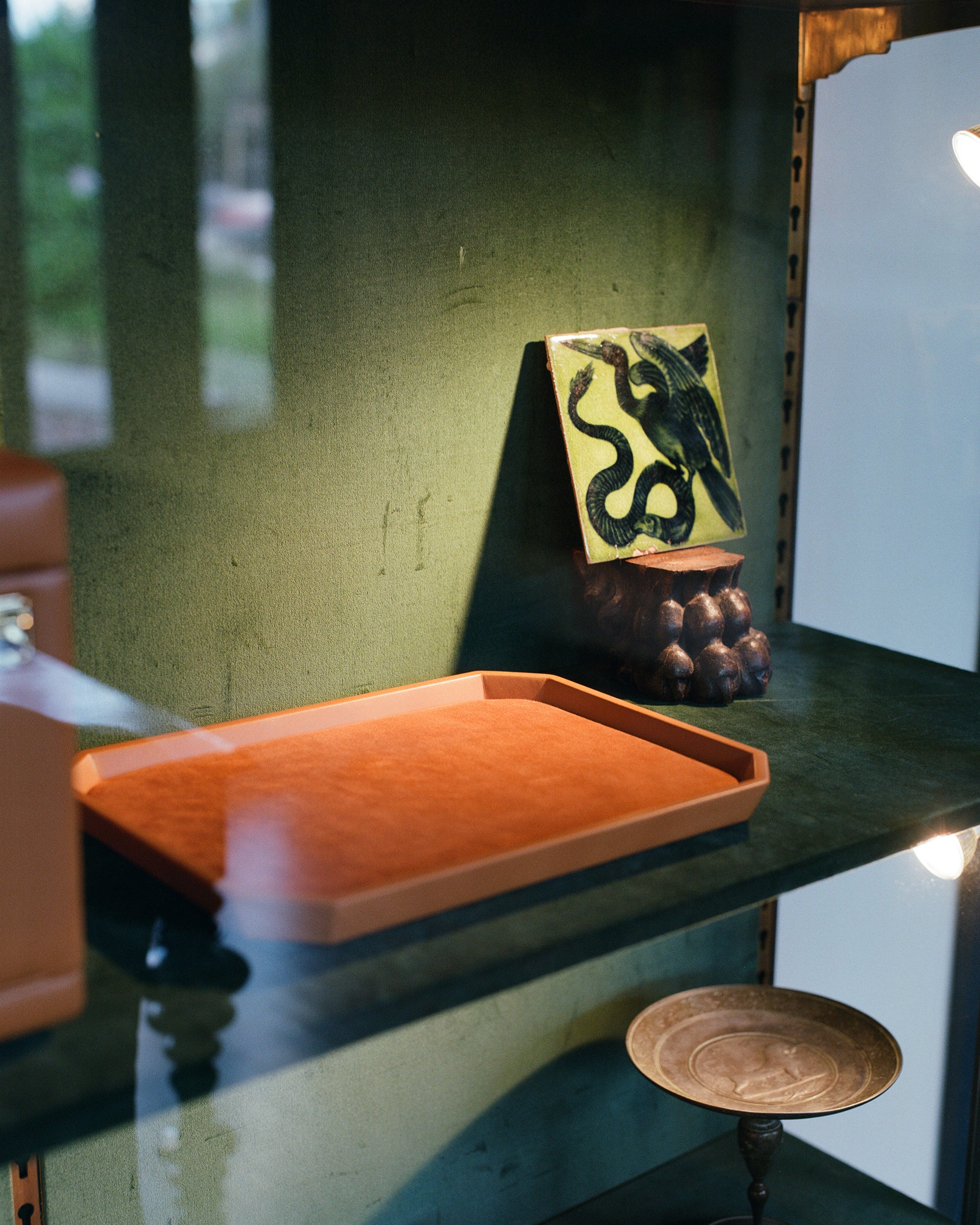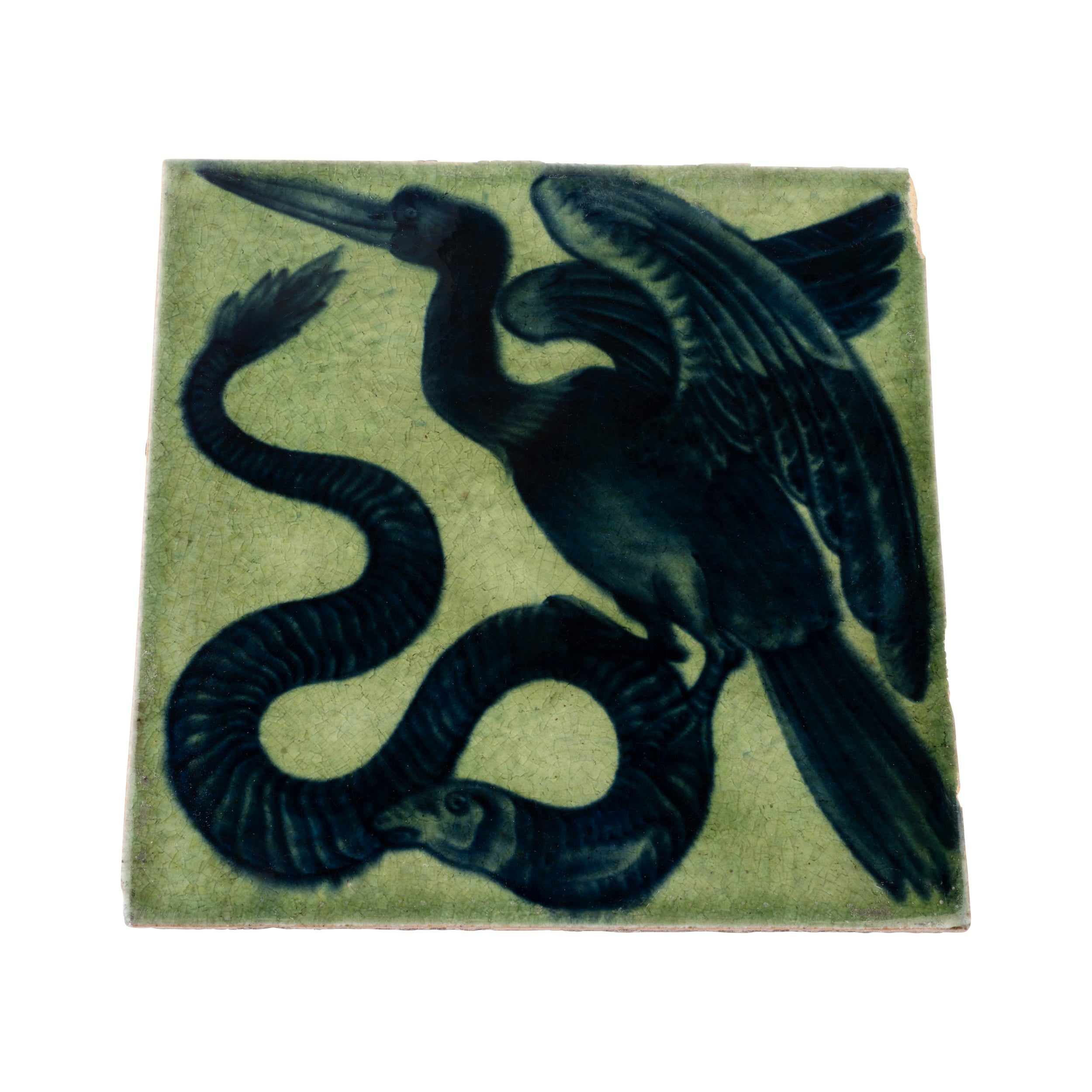 A decorative tile depicting a bird and a snake. Sands End Factory Ark to back, in a green glaze. Some damage on the edge of the tile. See photos for details.