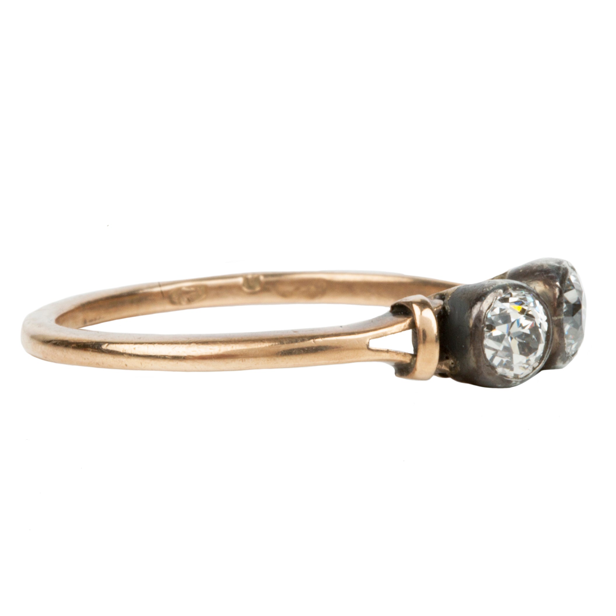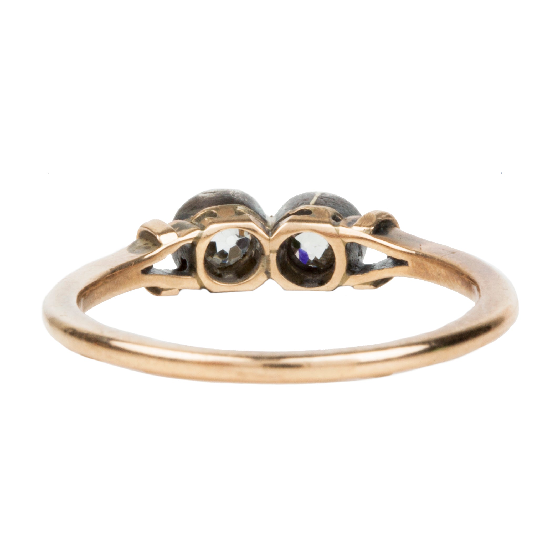 Very sweet turn of the Century diamond ring. Two transitional cut Old European cut diamonds set in silver topped settings on a rose gold band. Circa 1900. "moi et toi" translates to "me and you" this was a popular style of engagement ring from the early 20th century.