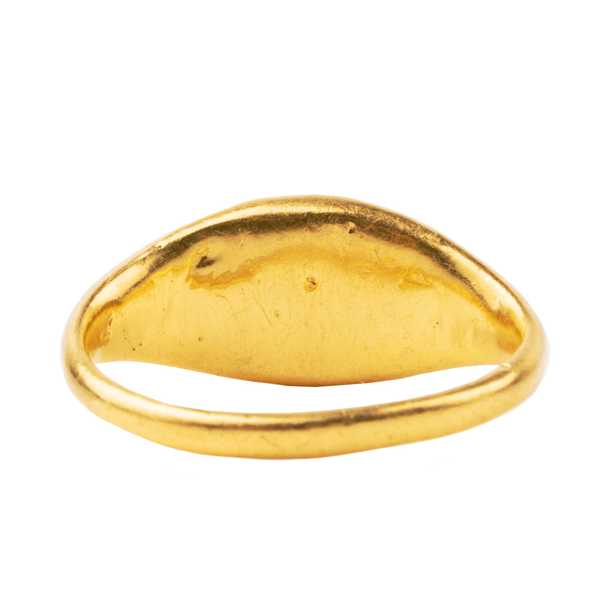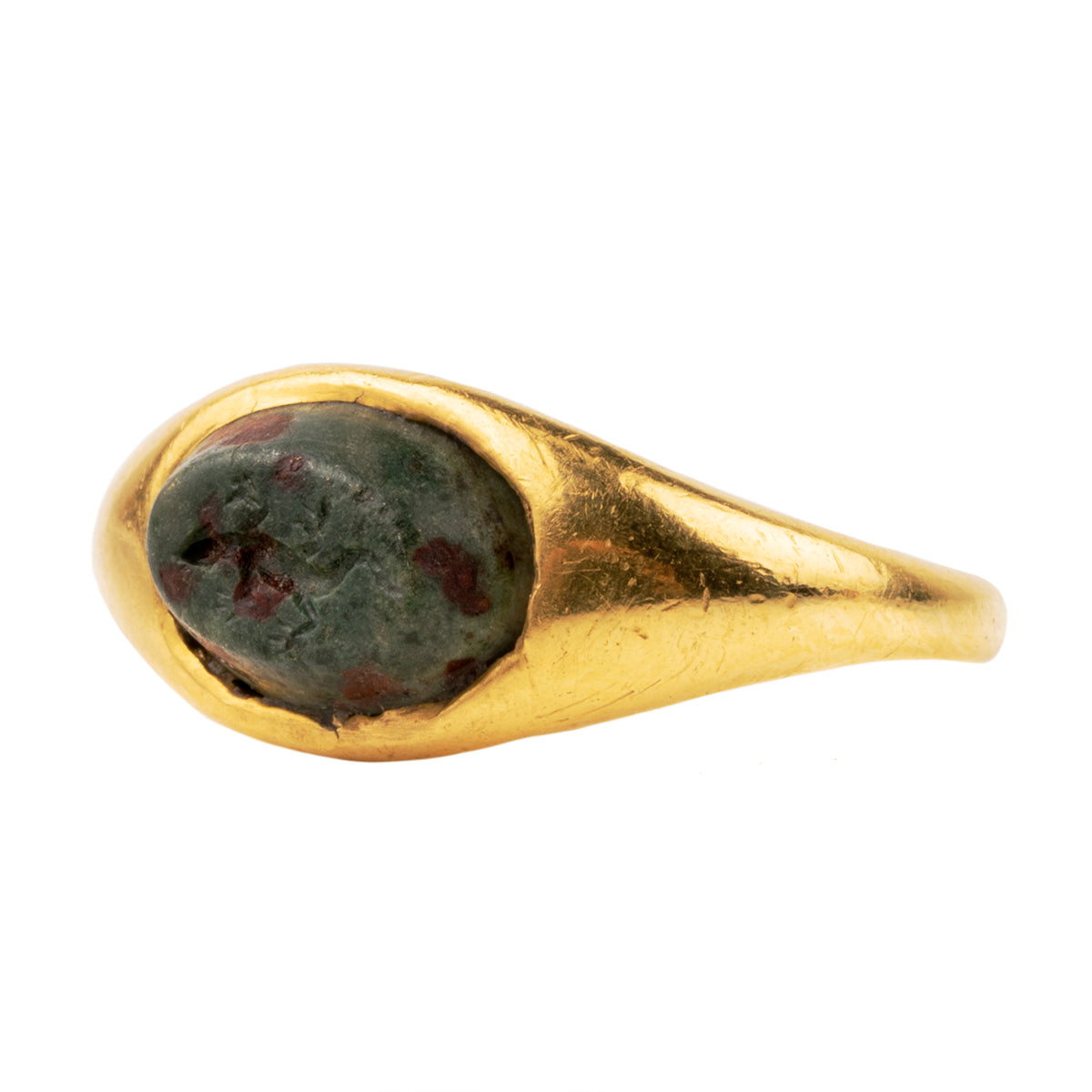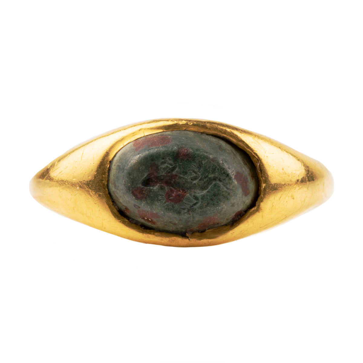 Ancient Roman carved bloodstone intaglio ring depicting a Salamander. The shank is in a high carat gold stir-up shaped setting, common in rings from this time period. The salamander represented a talisman of protection as it was believed to have been a "fire proof" creature. Circa 1nd Century.