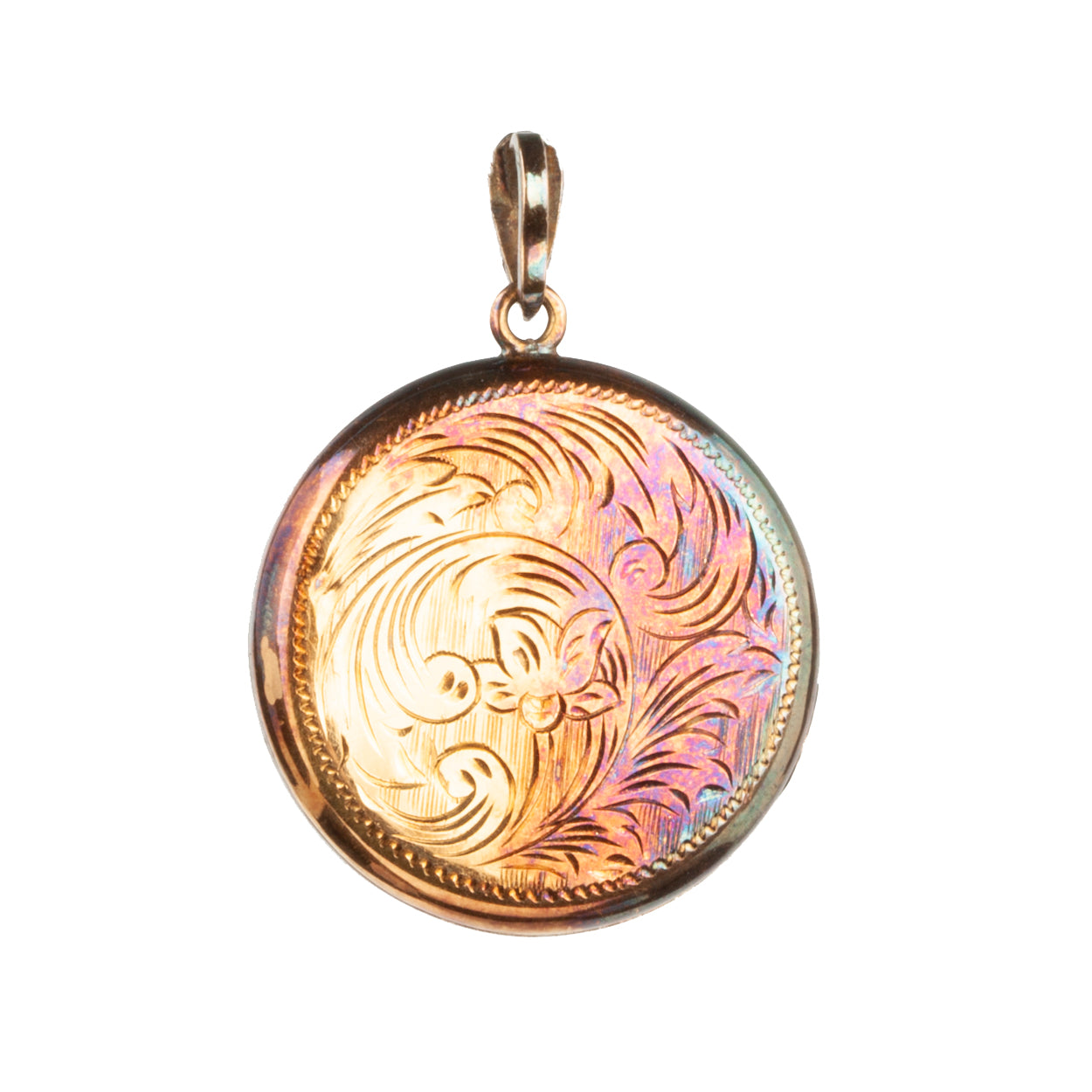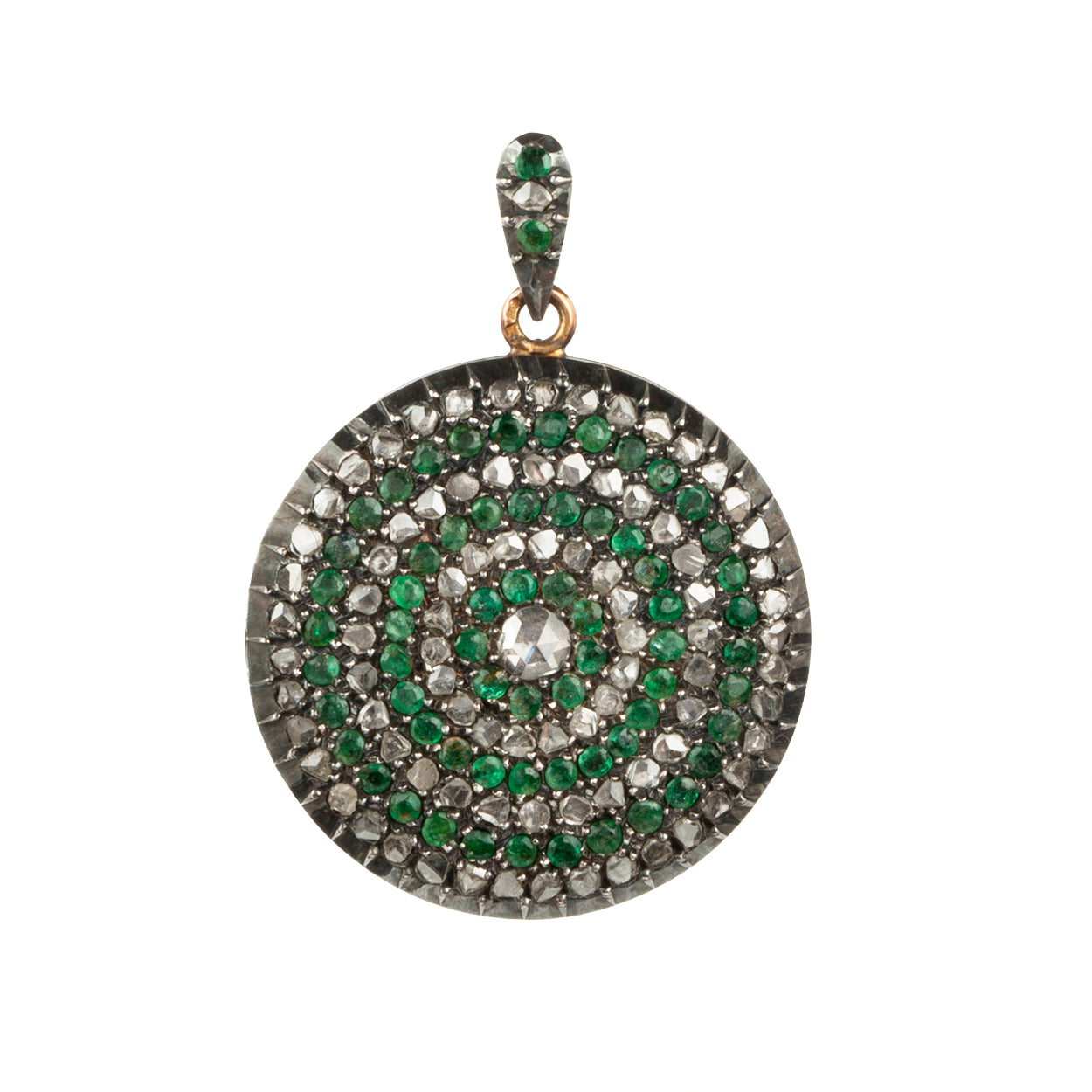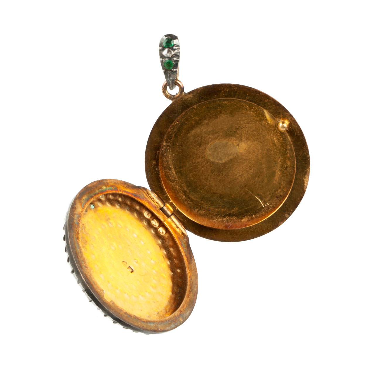 Antique rose cut diamond and emerald locket. Emeralds and diamonds are in silver-topped gold cut away setting. A hand-engraved floral design with a deep patina, appropriate for the age. Portuguese hallmarks. Circa 1920.