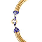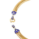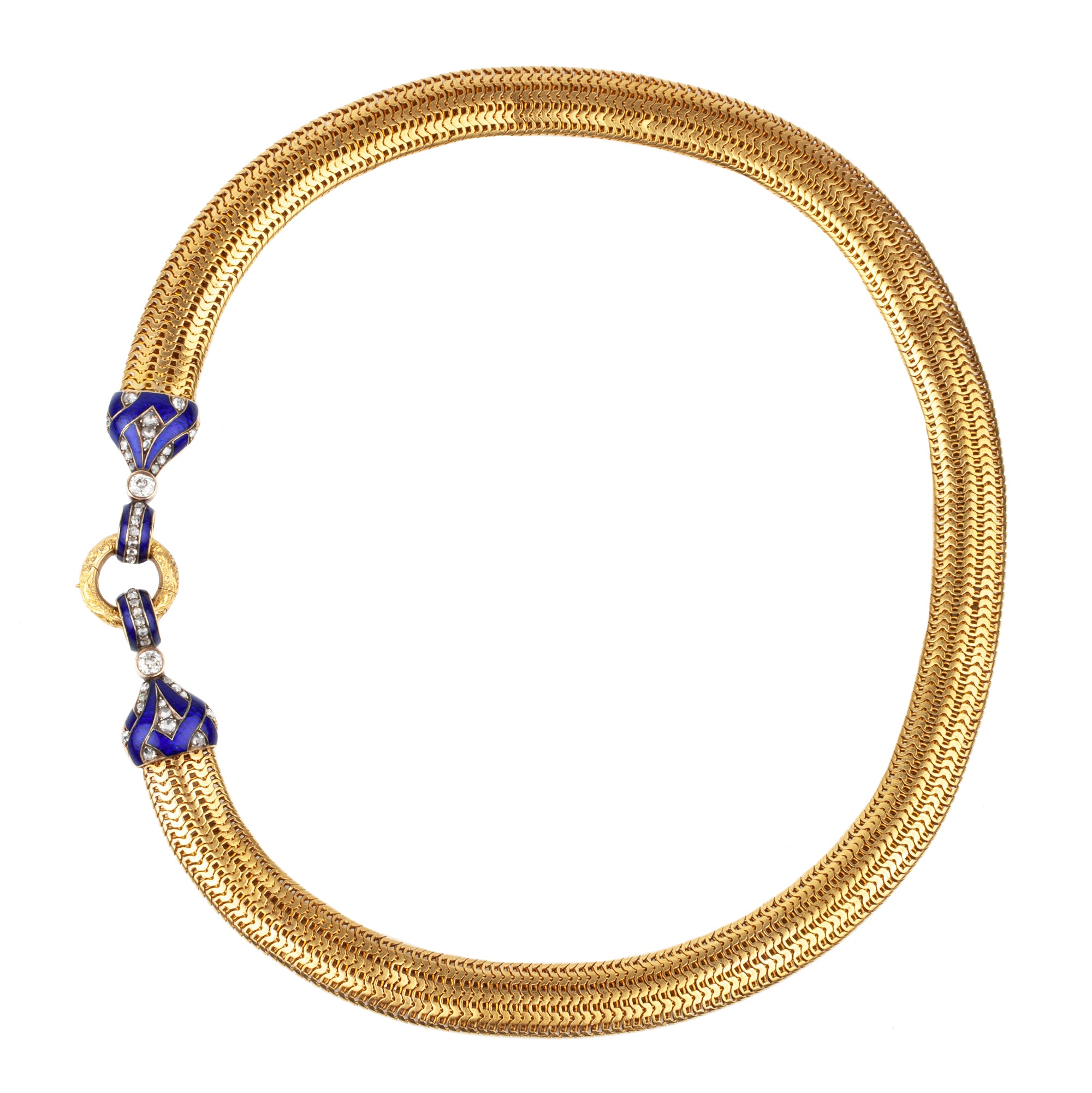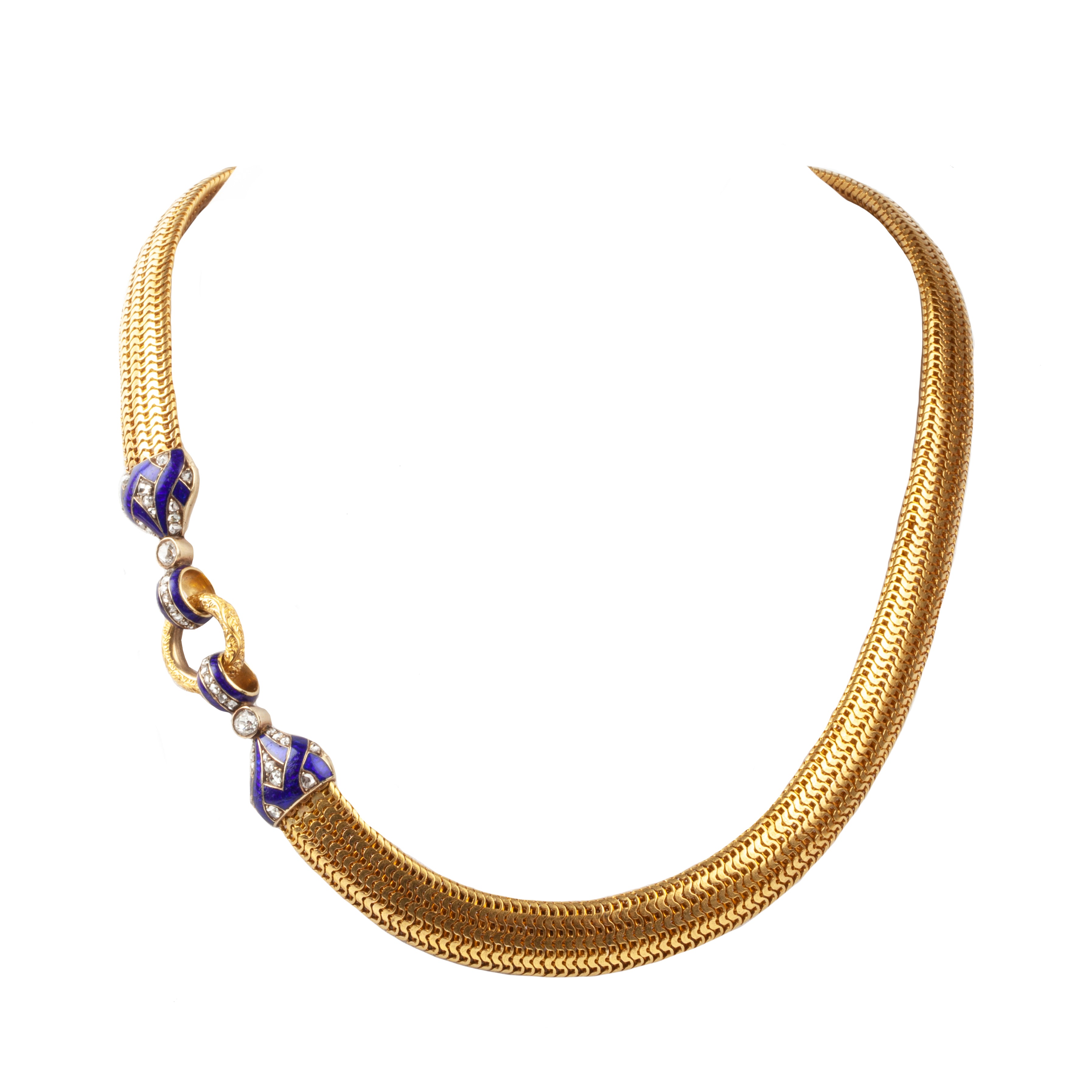 Antique 18k gold flexible collar necklace. Old mine cut diamonds and blue enamel details, allow the necklace to be worn in multiple ways. English in origin. Circa 1870.