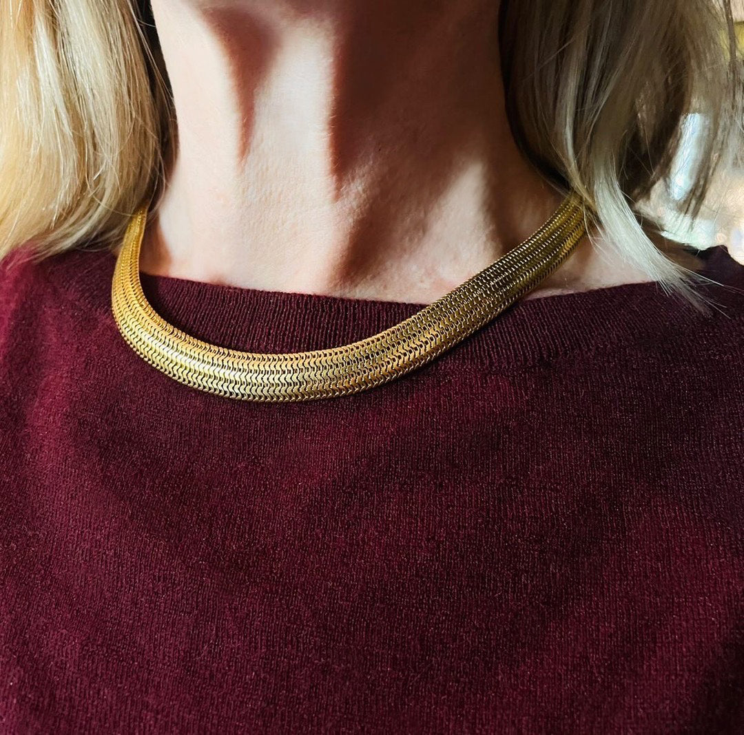 Engraved gold ring ornamental clasp opens sideways to release. Measures 17.25" in length and .50" wide.
