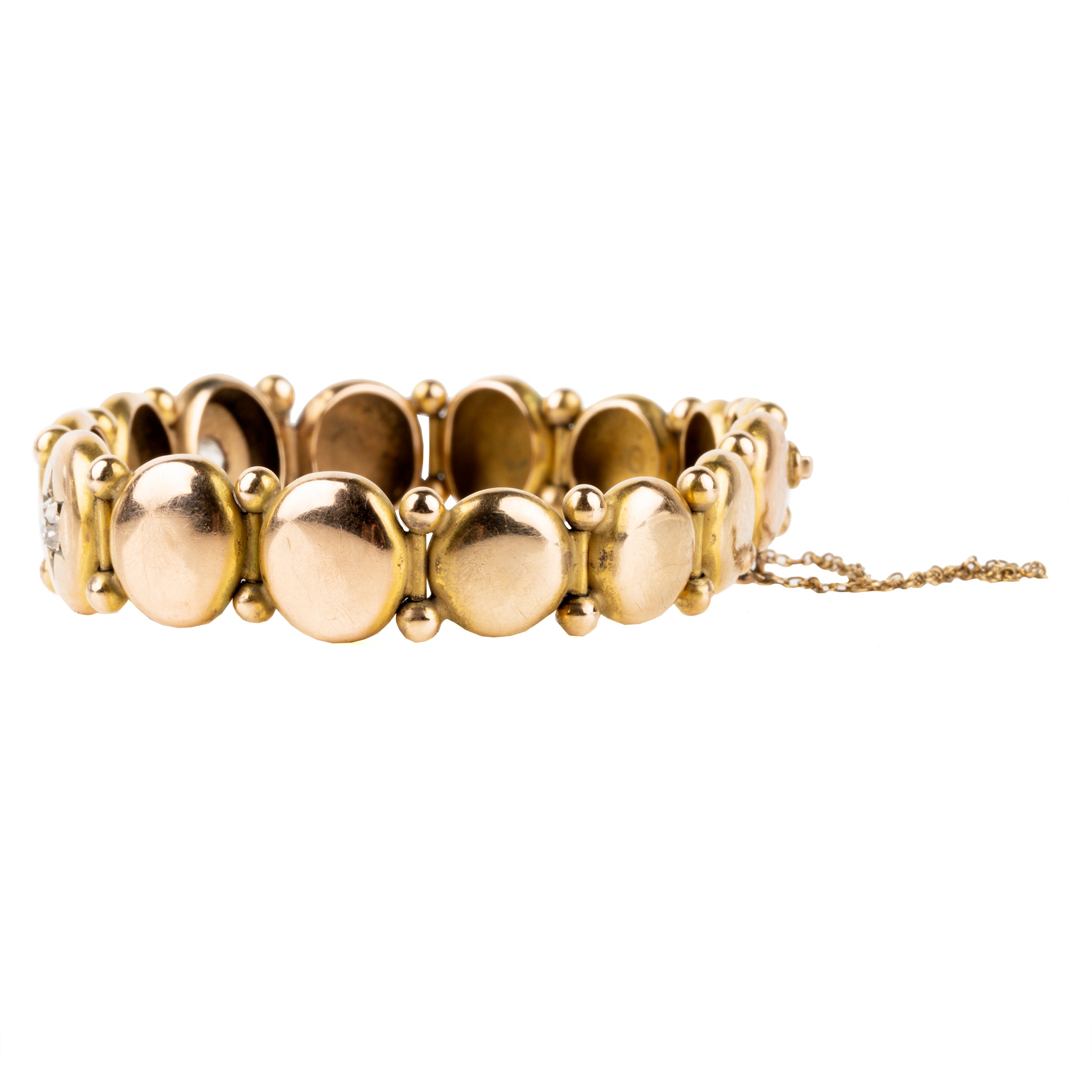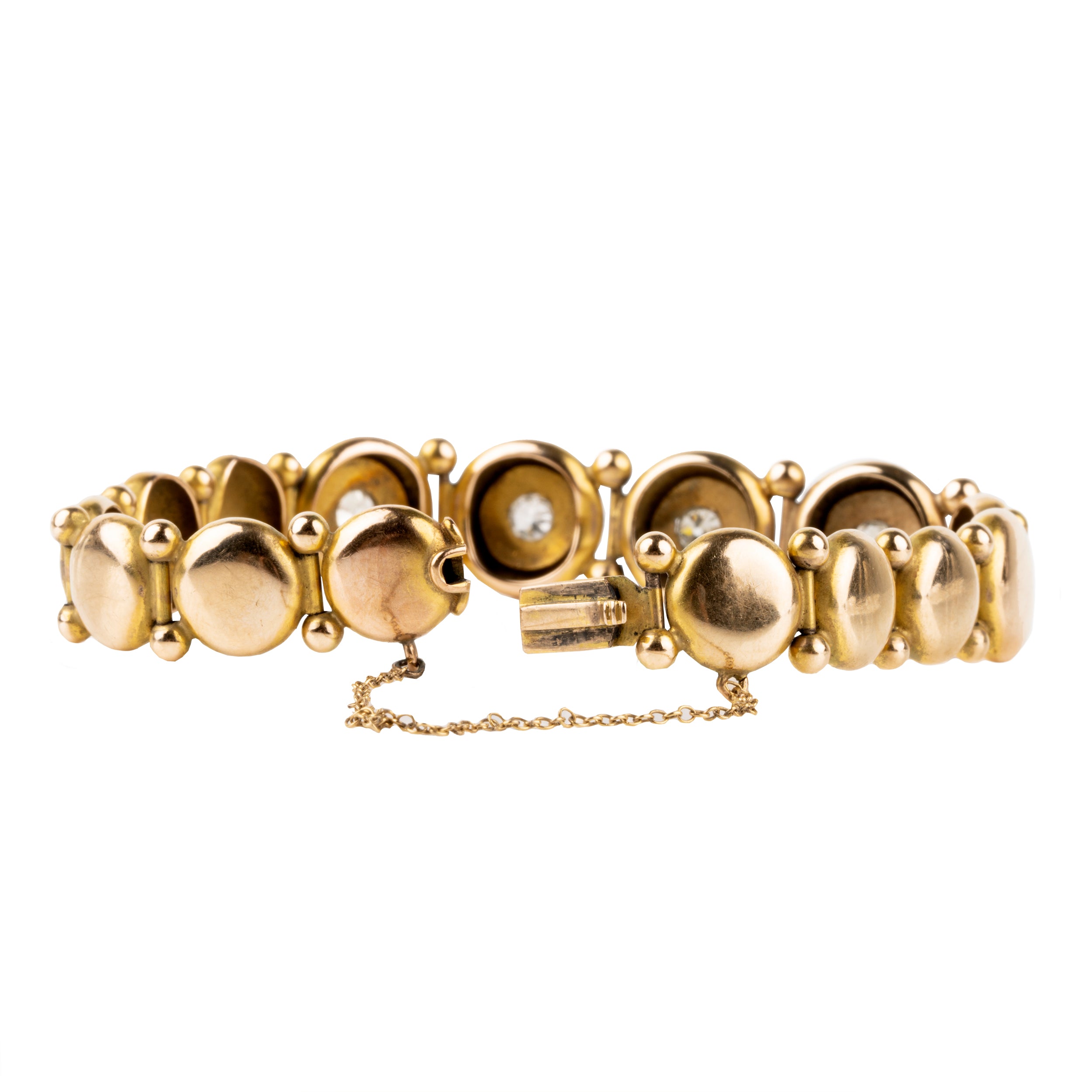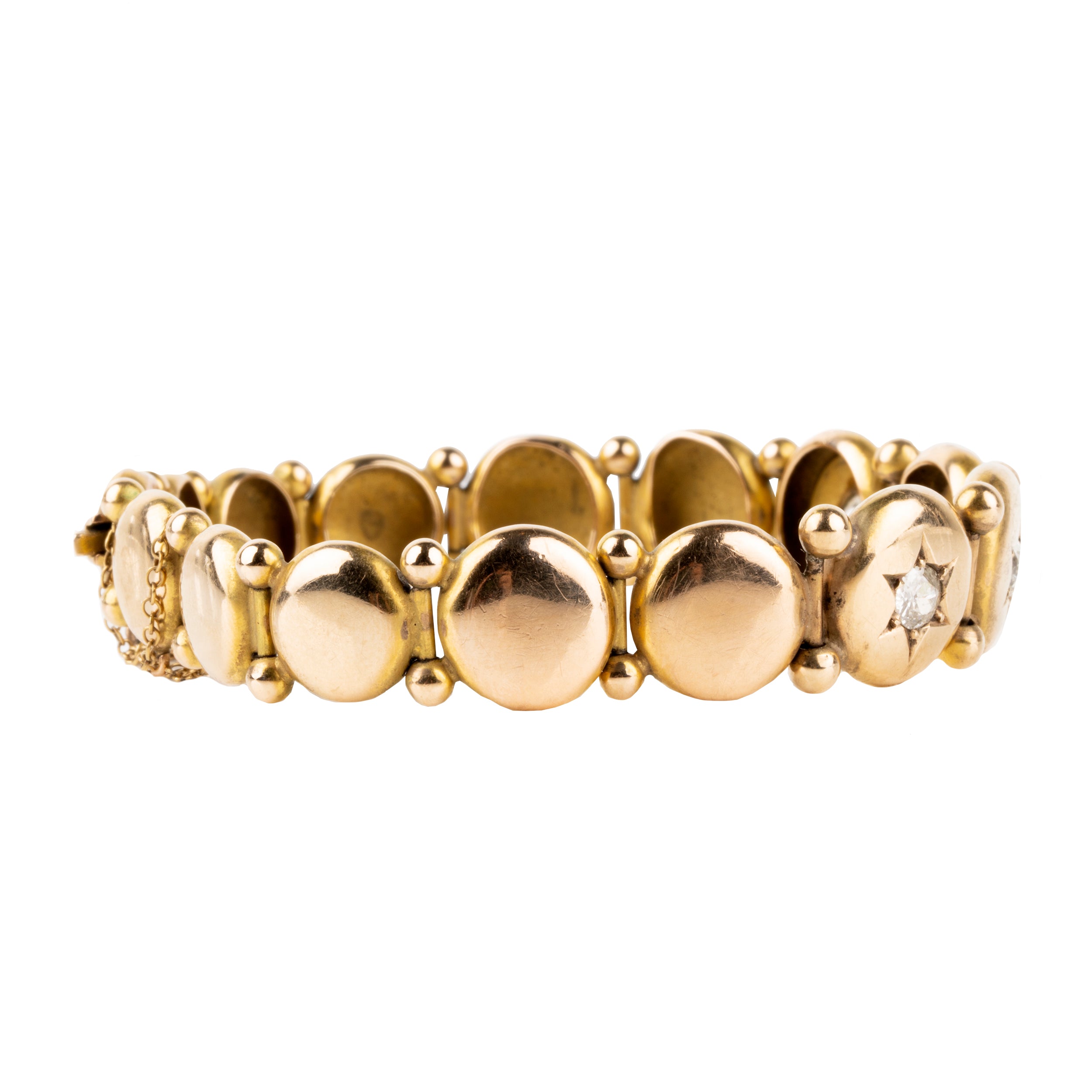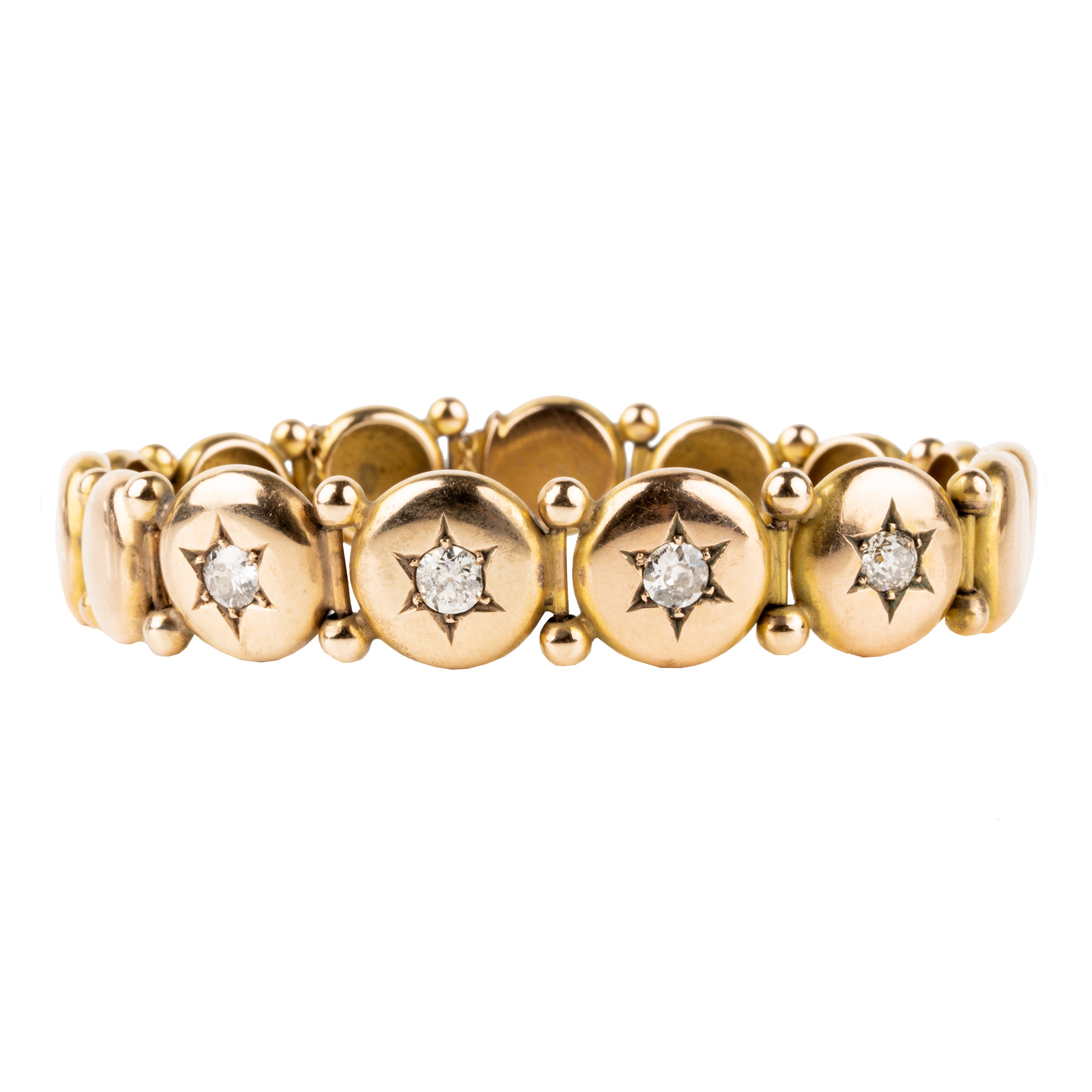 Antique diamond and gold bracelet, in 10k gold. Four old mine cut diamonds in star detail settings. Approximately 1 carat in total diamond weight. American in origin. Circa 1900.