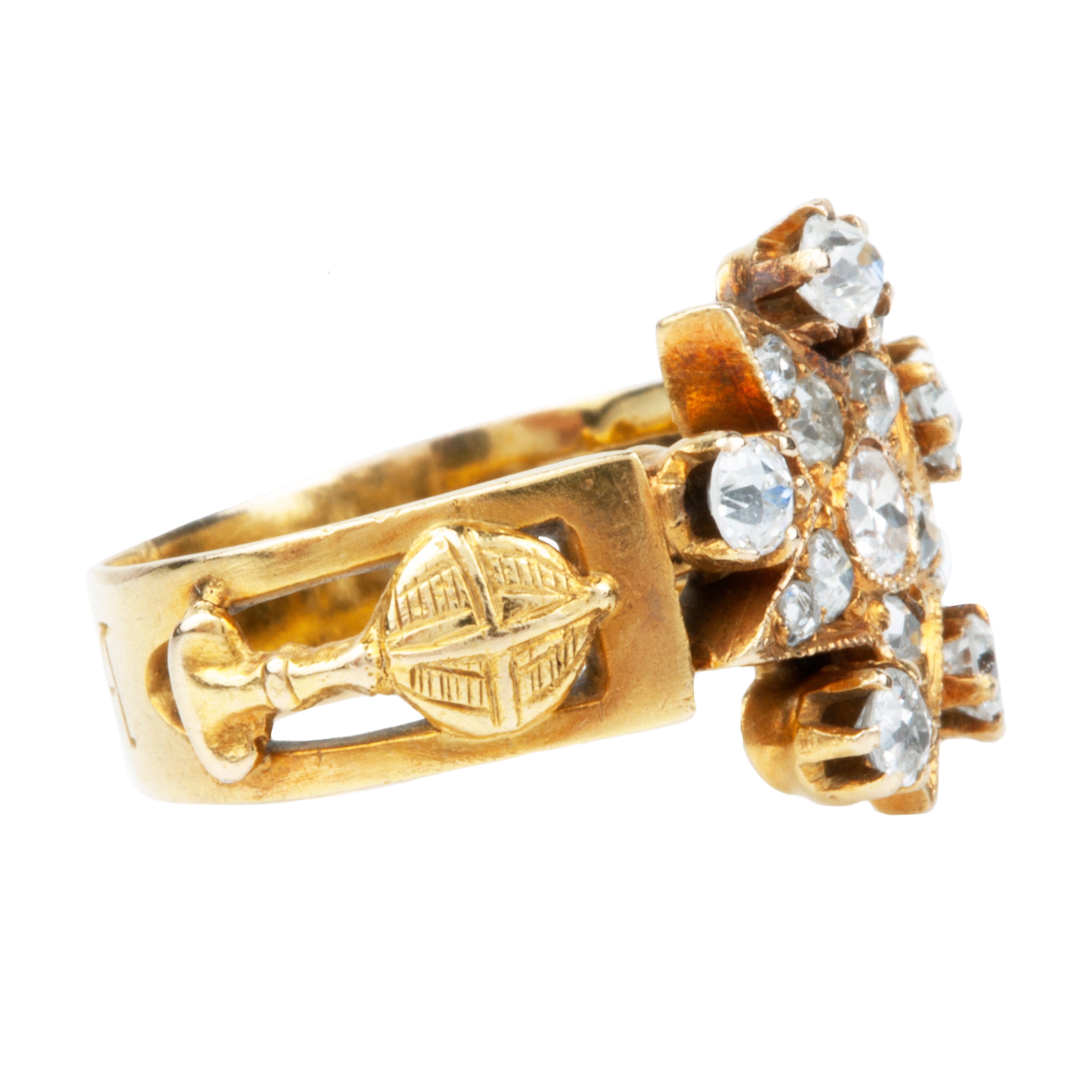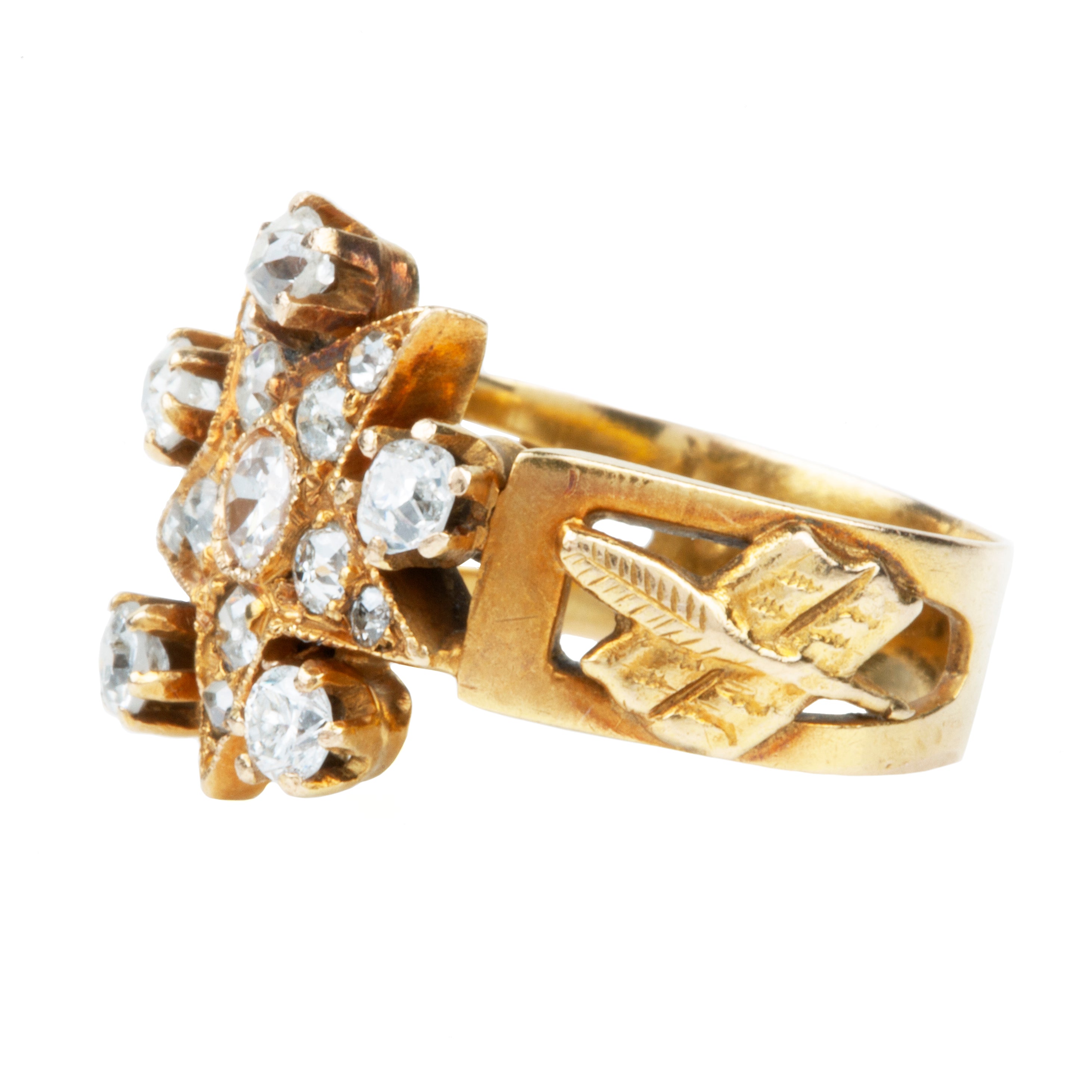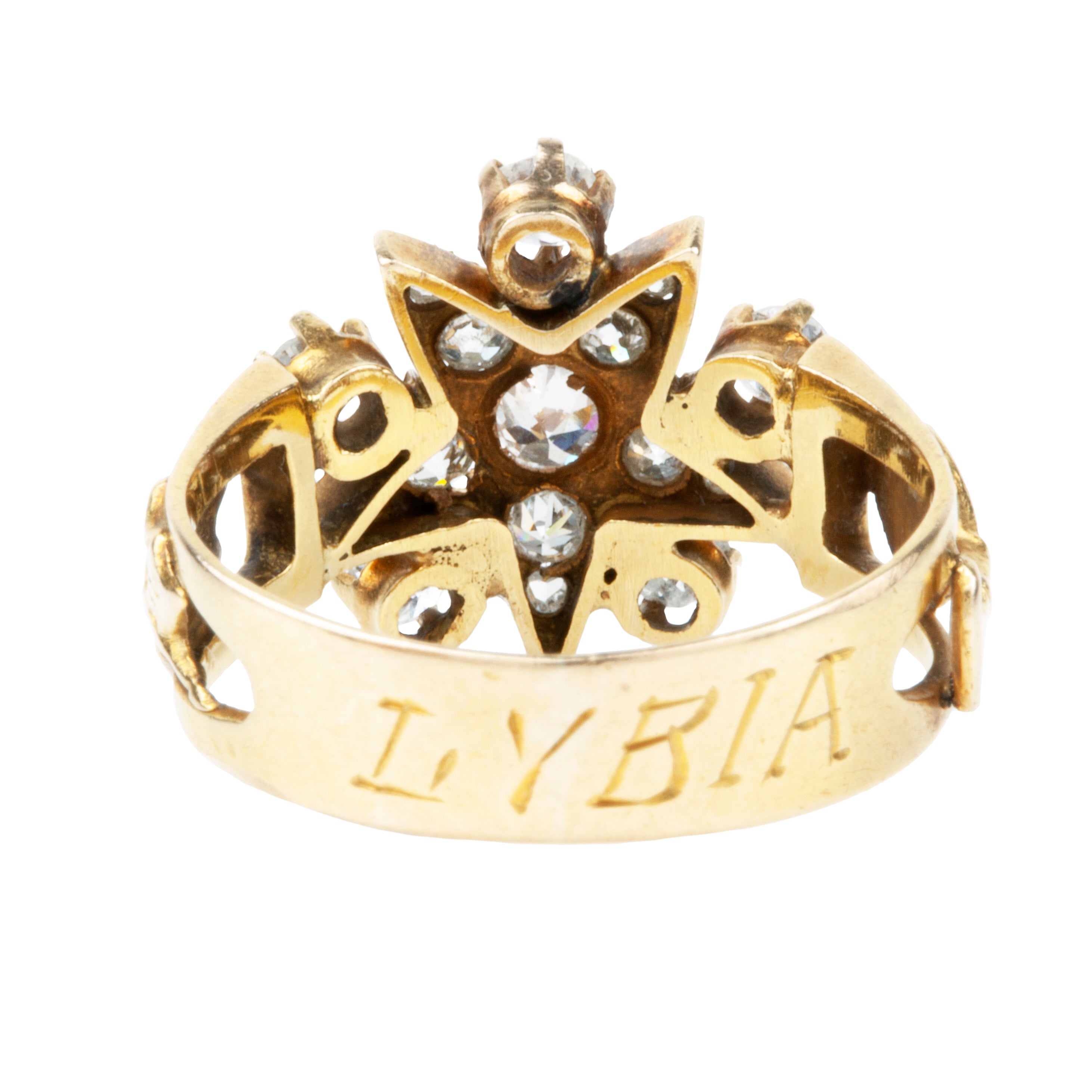 Unusual antique diamond star shaped ring, in 18k gold. The star detail has both old mine and old European cut diamonds. The shoulder display symbols for travel (a globe) and writing (a quill and paper) with "Lybia" engraved on the back of the ring.