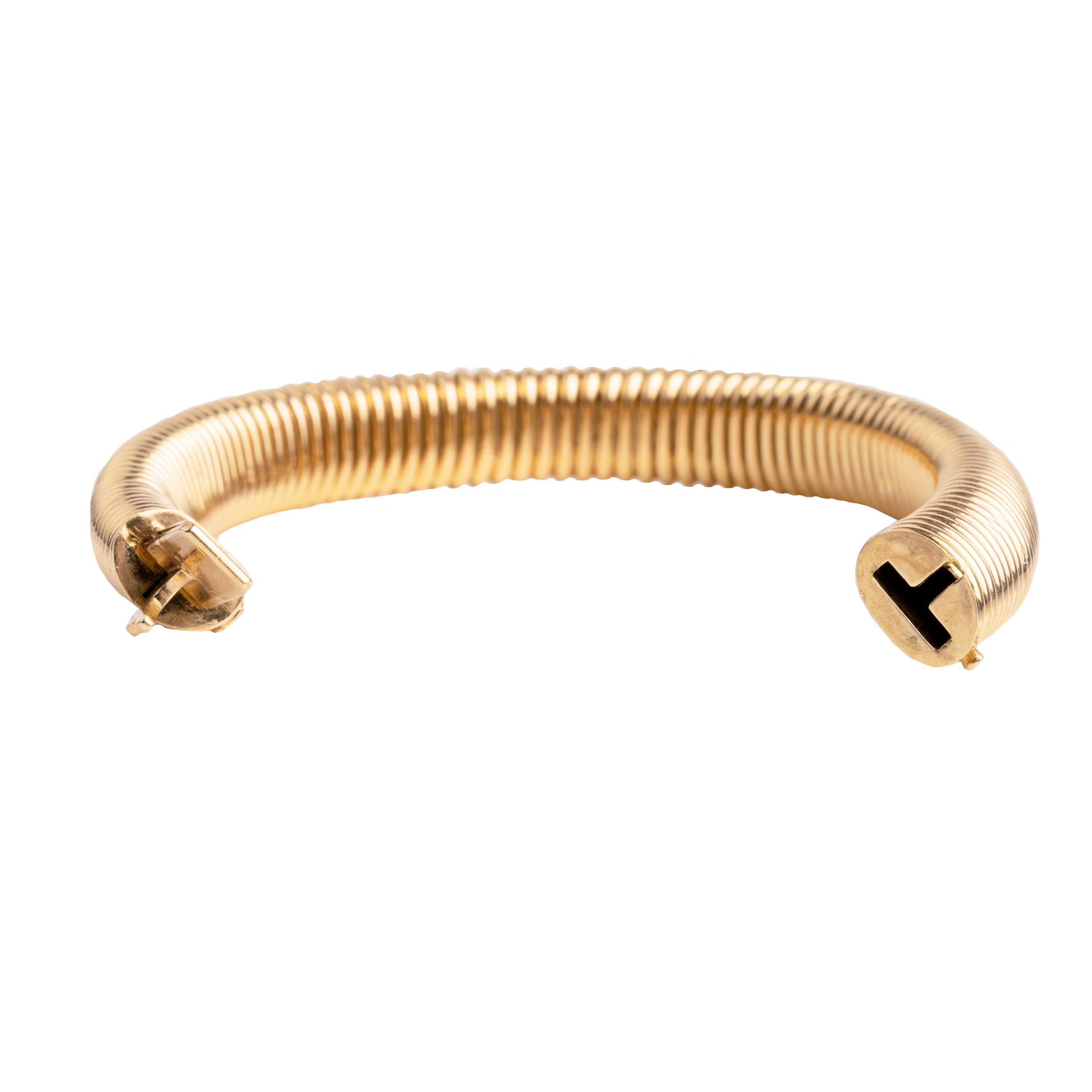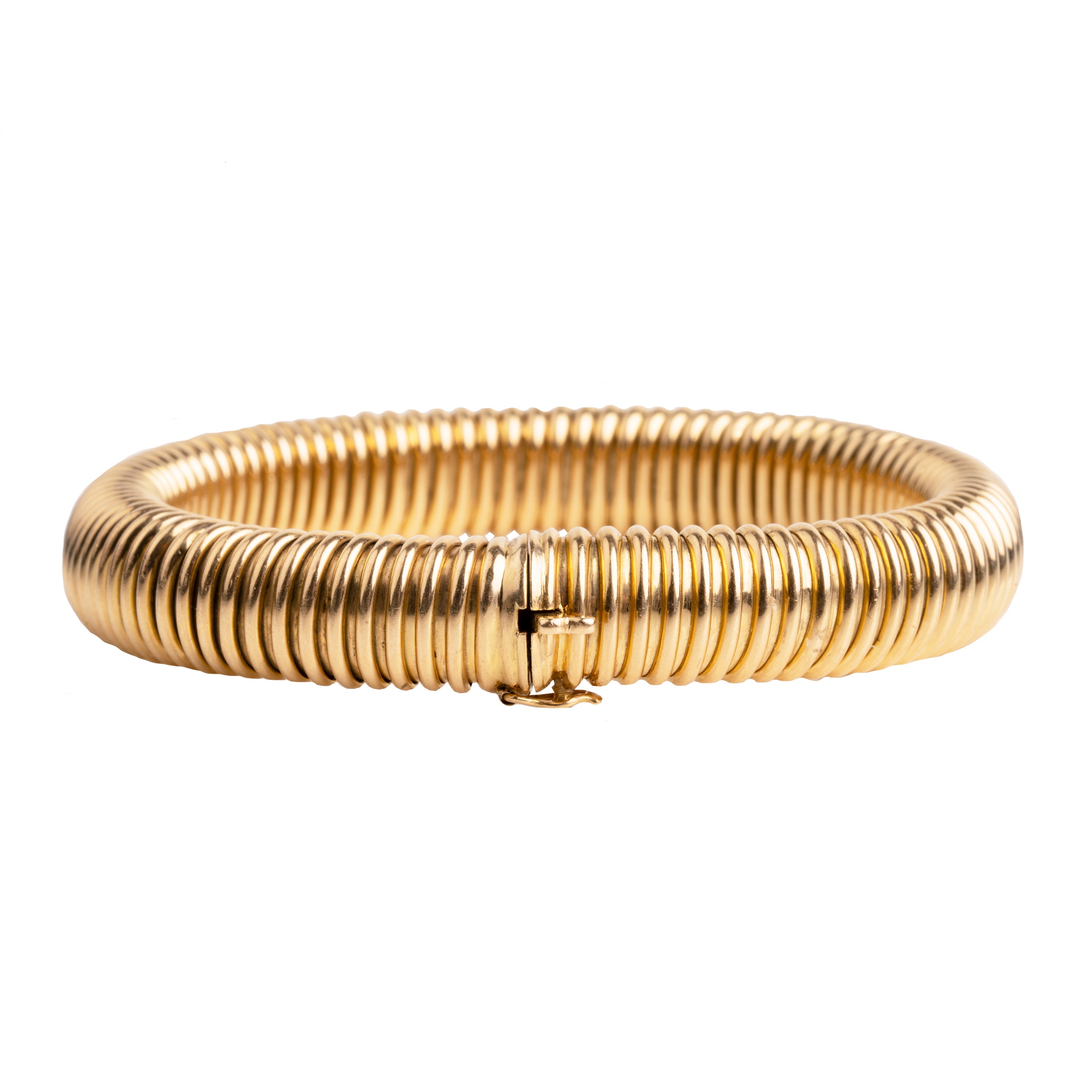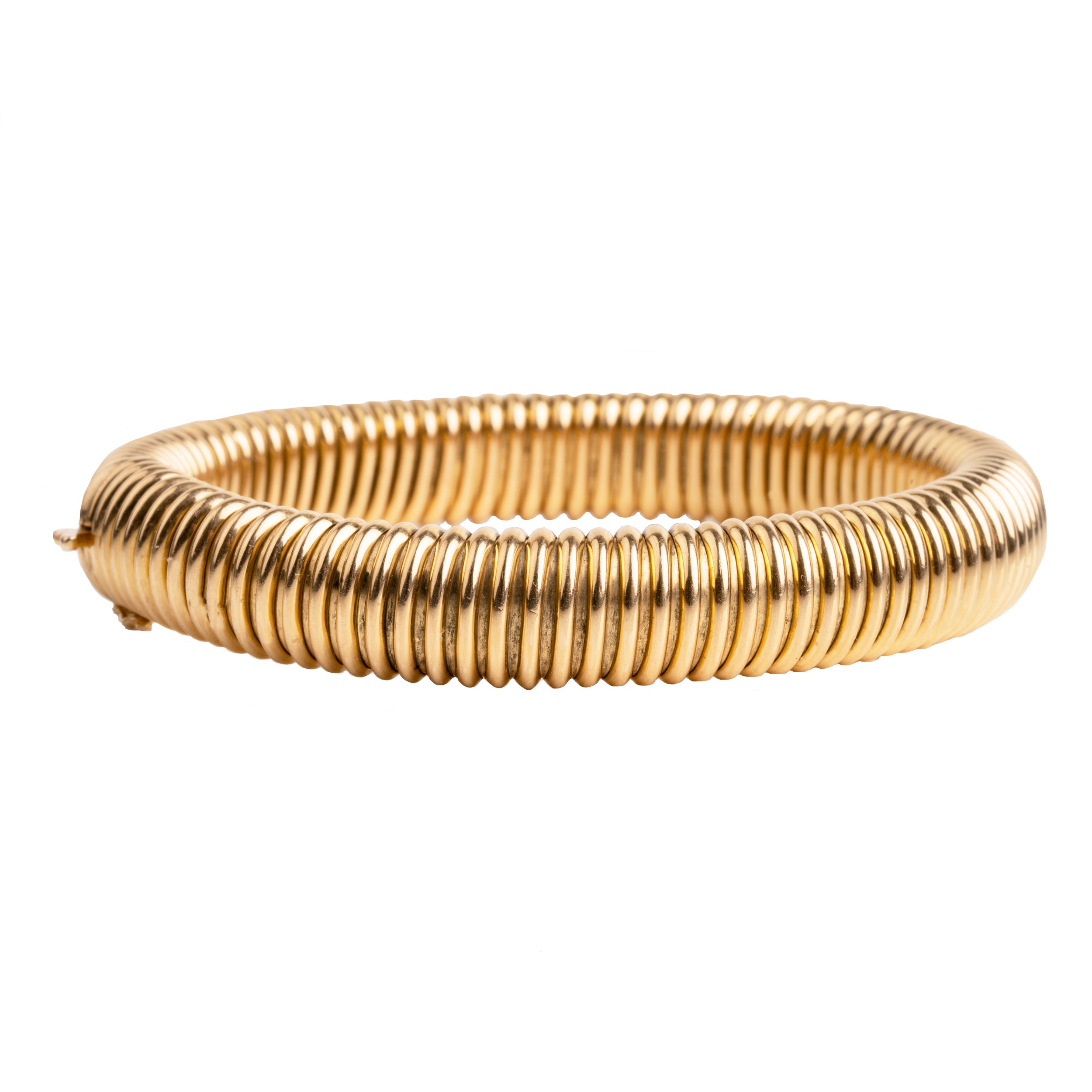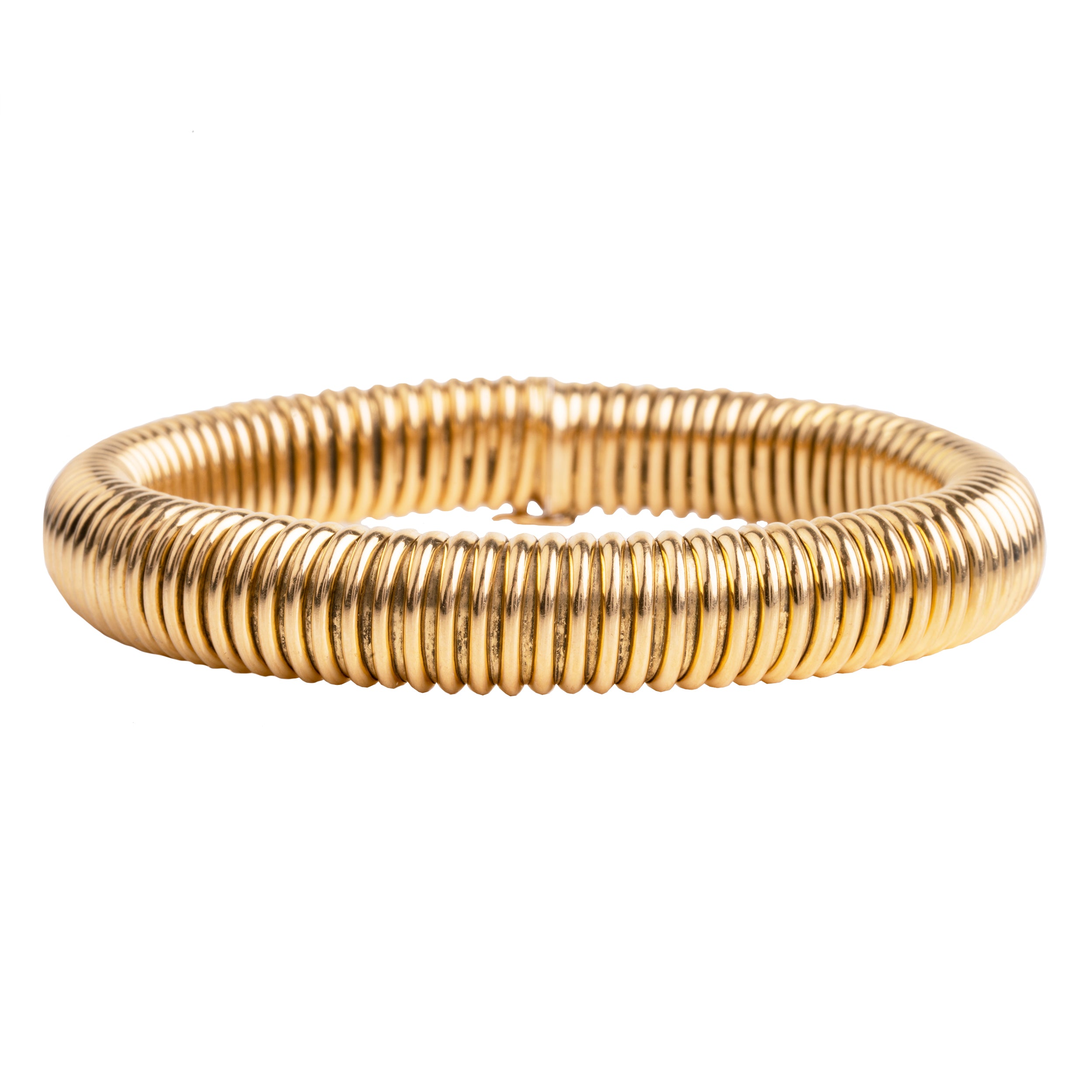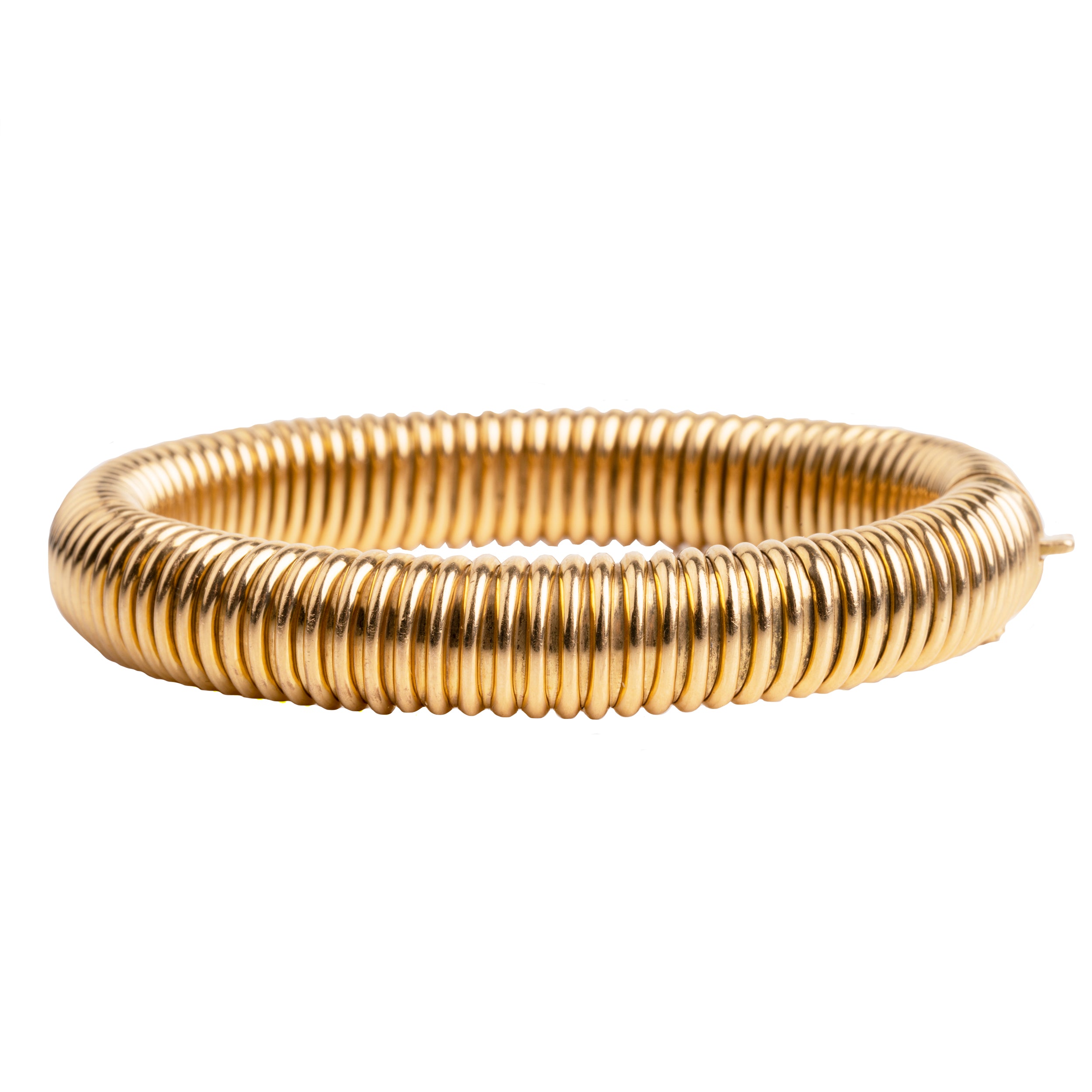 Antique gas pipe gold bracelet. A flexible tubular style bracelet in yellow 18k gold with patina. Found in Denmark. Circa 1900