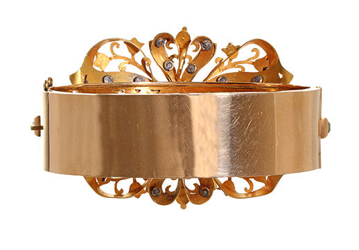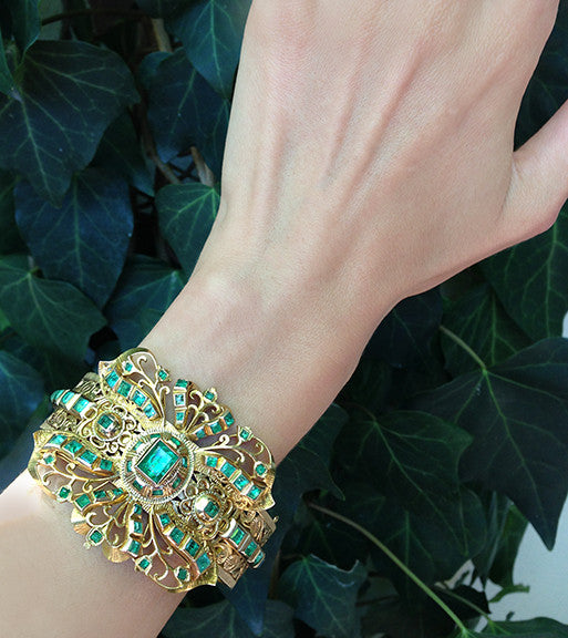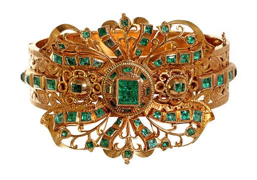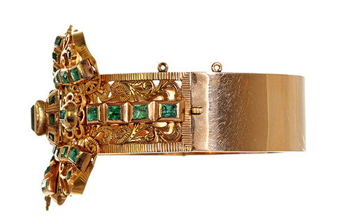A late 19th century bangle made in the Spanish style of the mid 1700's. Bright green emeralds closed set in 18k gold. This bracelet was purchased from an estate with a pair of 18th century Iberian emerald earrings. The bracelet was made over 100 years later to match the original earrings. See them here: in our archives. See our Field Guide on more history on jewelry from the Iberian Peninsula.