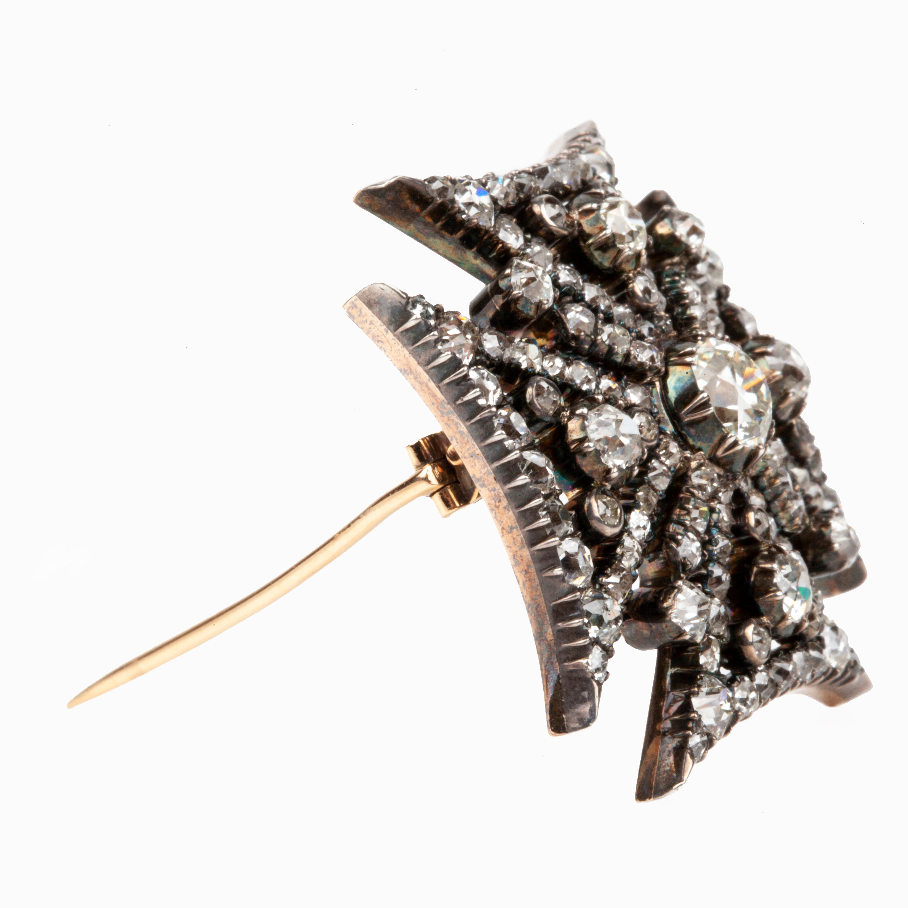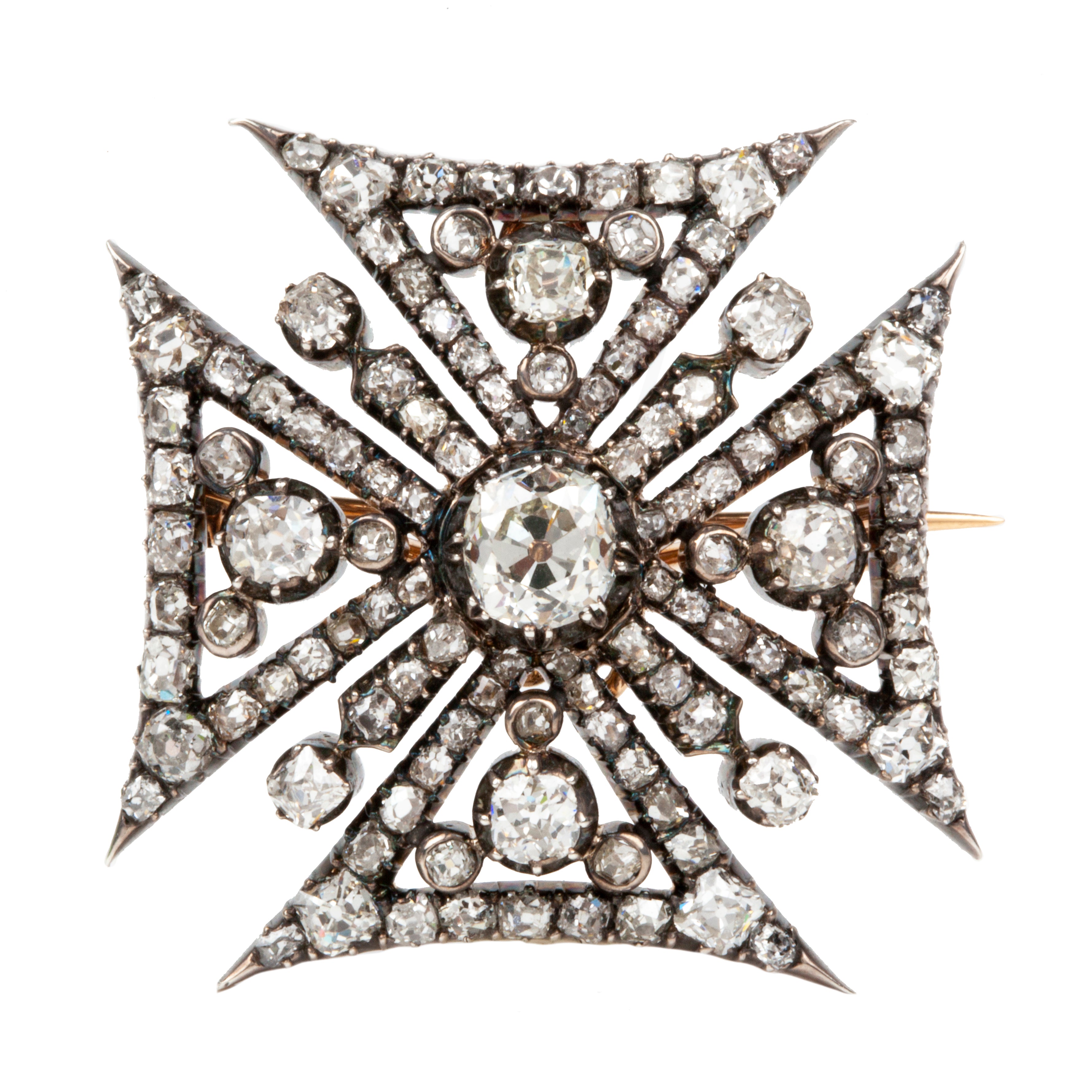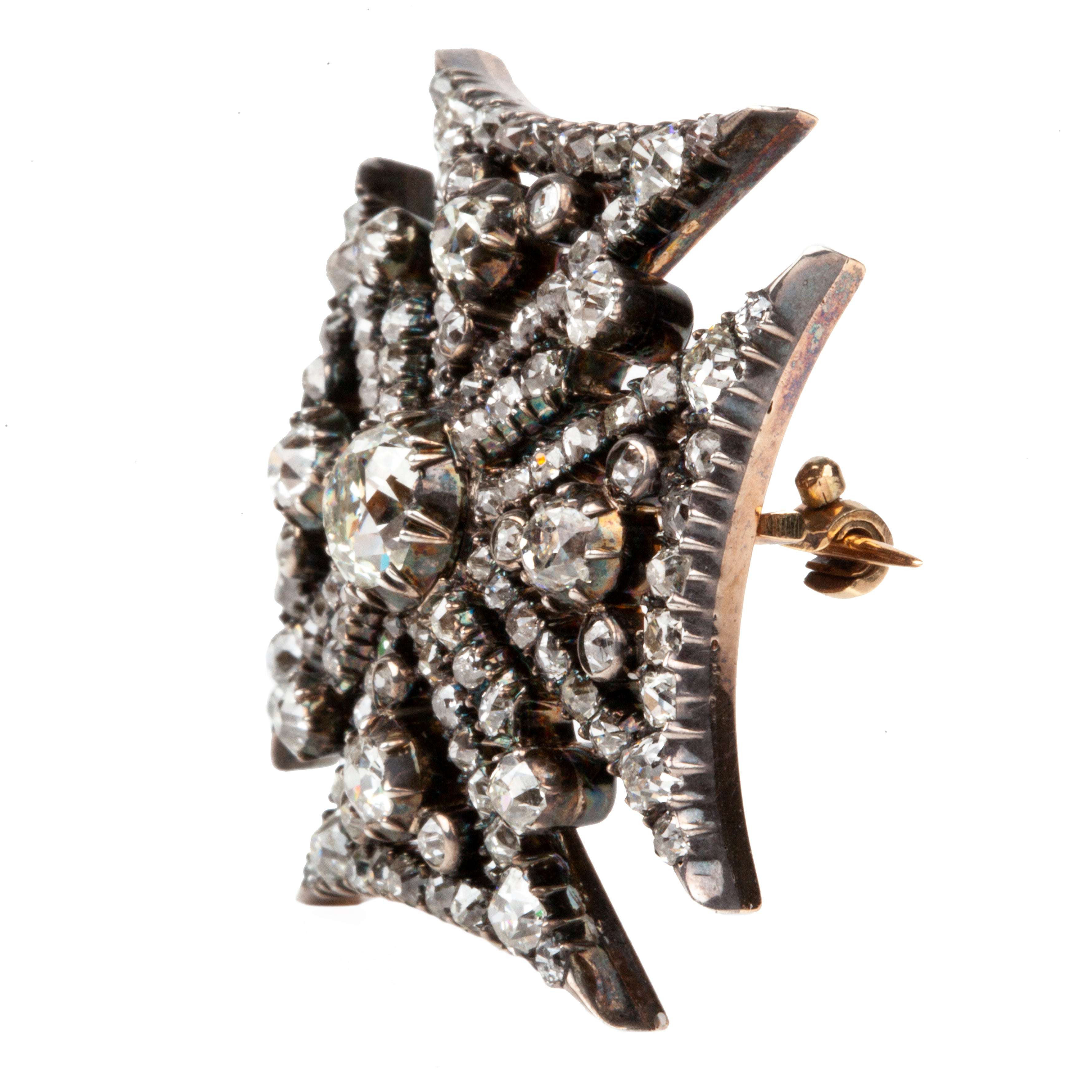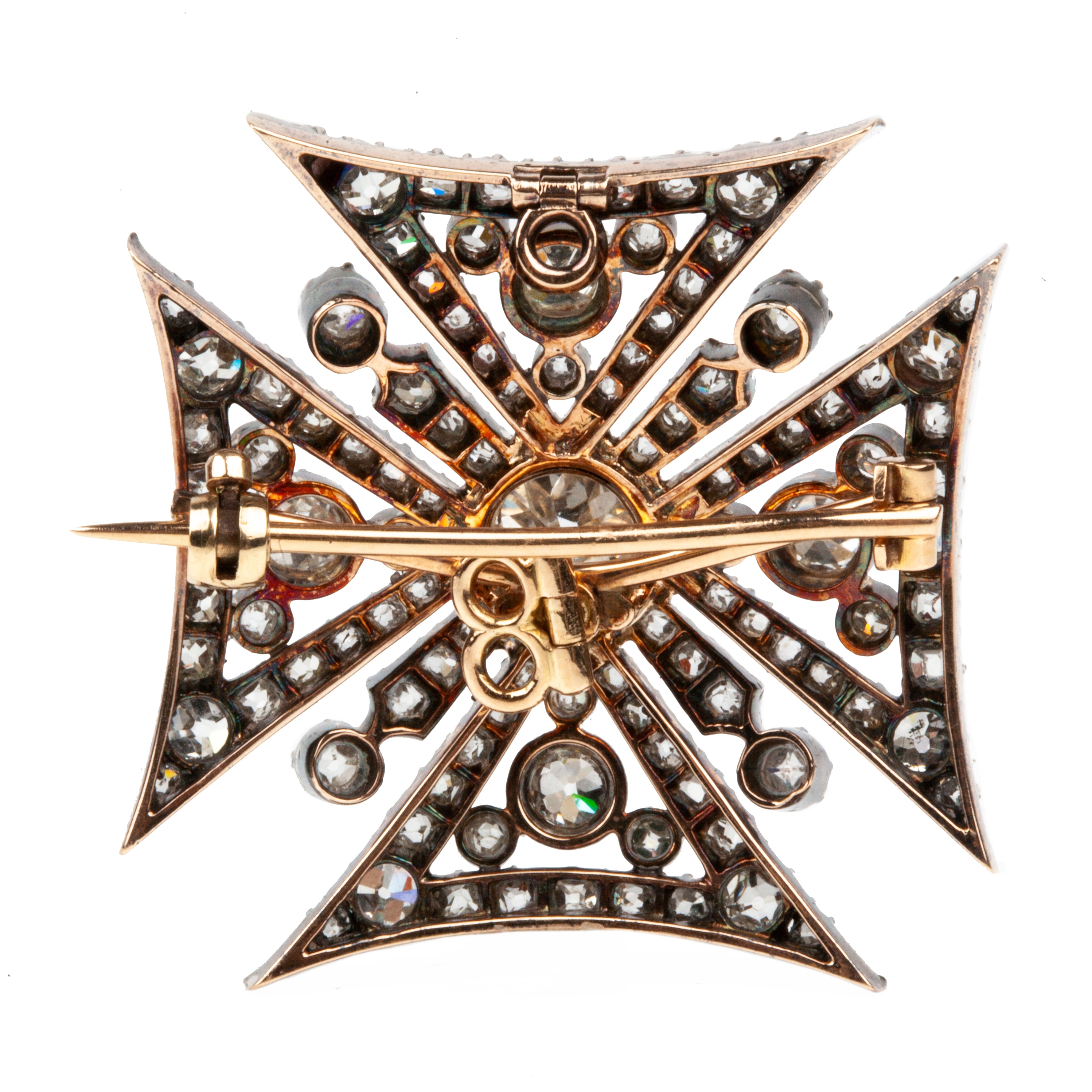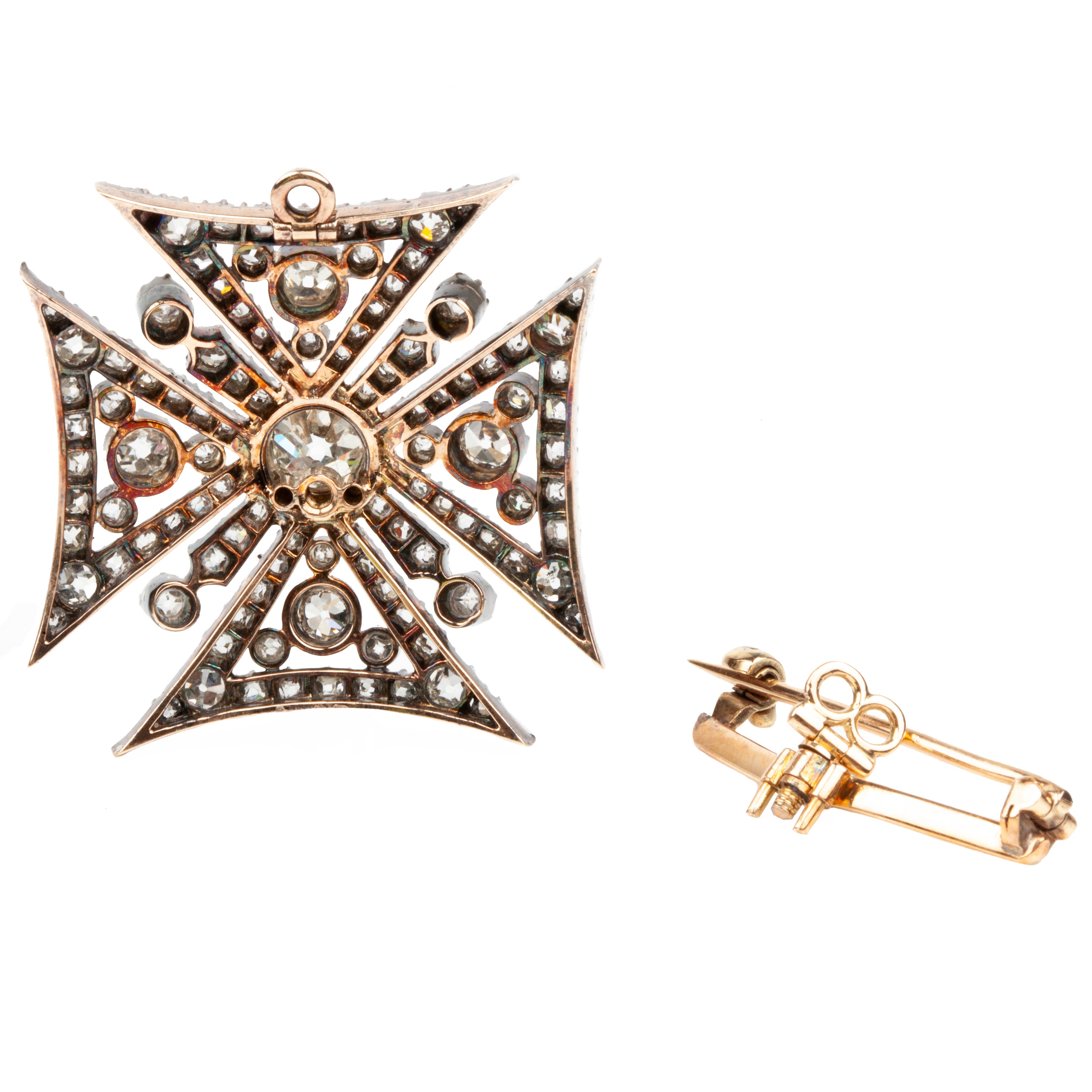 Antique Maltese cross with old mine cut diamonds, in silver topped gold setting. Center diamond is approximately 1.25 carats, with approximately 4 carats of additional diamonds. The original brooch fixture is detachable with a hinged loop which converts it into a pendant This piece can be worn as a pendant or a brooch. English in origin. Circa 1870.