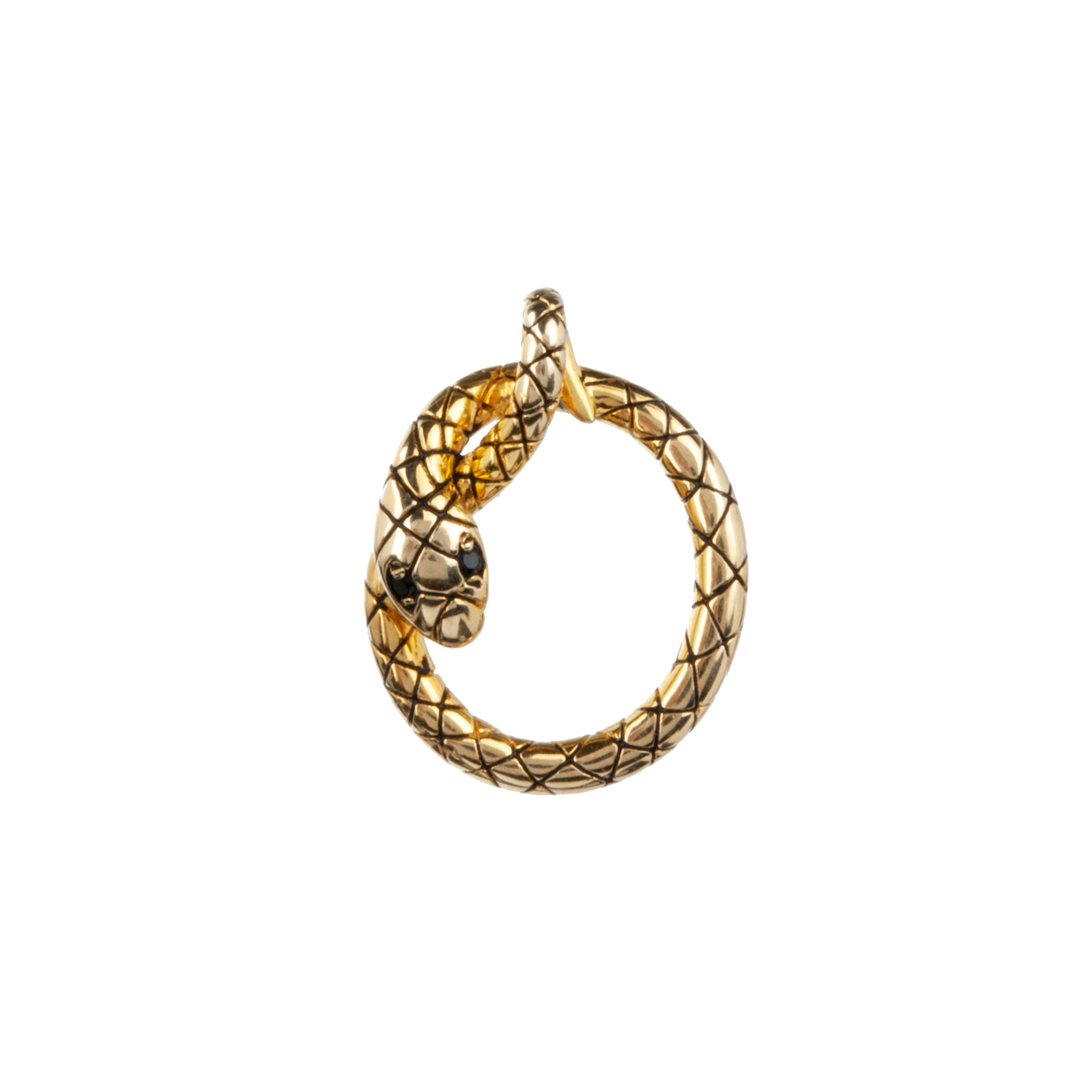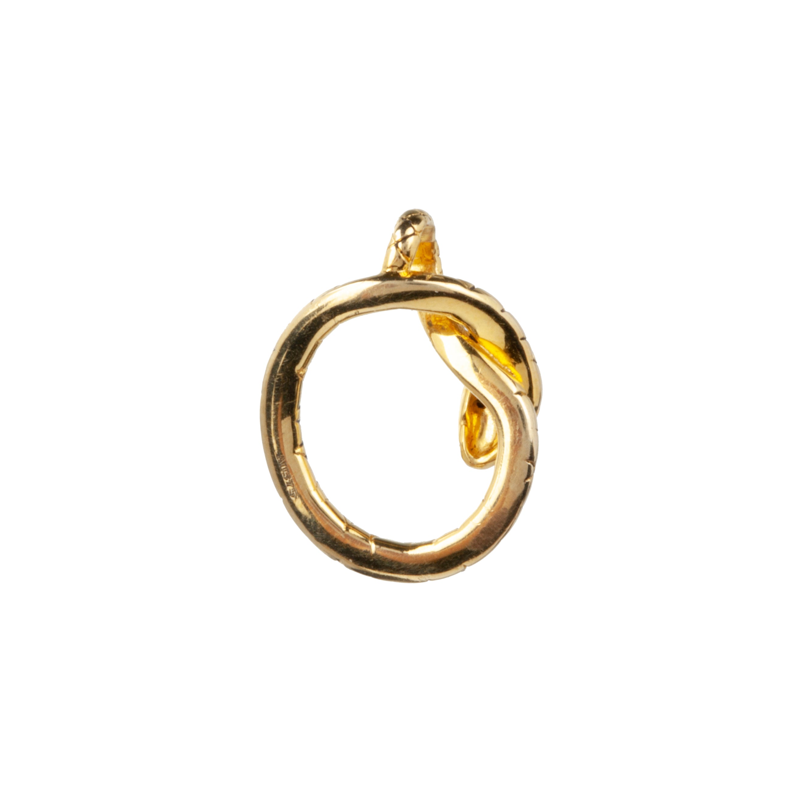 Diminutive gold snake pendant, with hand-engraved scale details. The body of the snake is encircled with the tail coiling around the neck. English in origin.