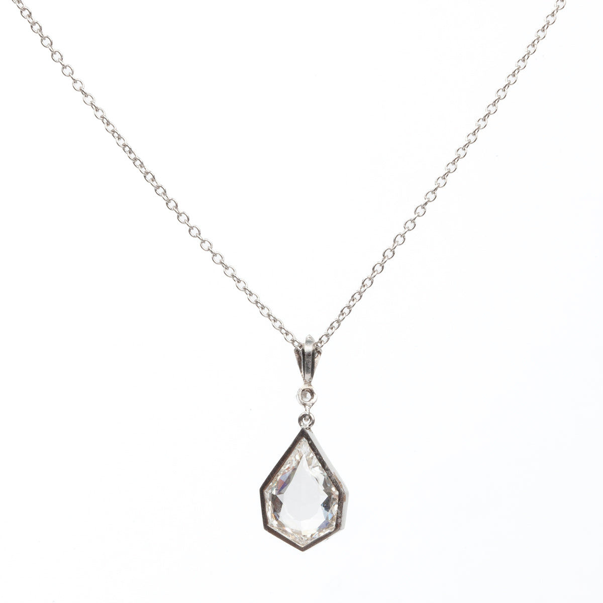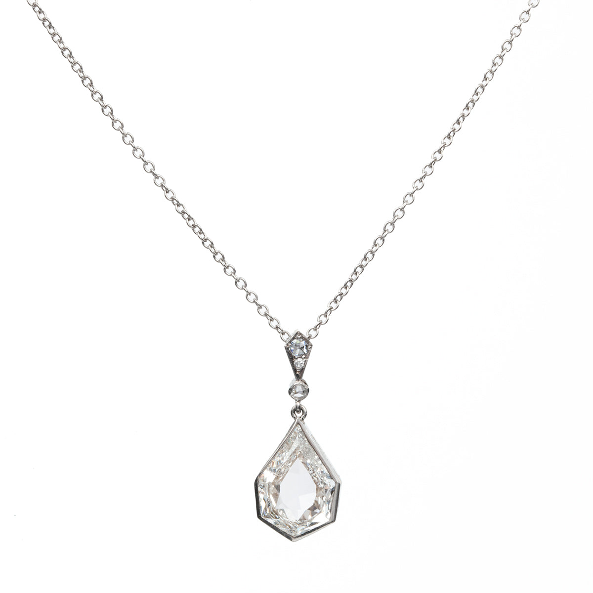 Antique shield shaped diamond pendant in platinum. The main stone is a rare portrait cut stone of approximately 1.20 carats. The setting is a delicate bezel set design that simply. floats the diamond. Portrait cut stones are cut from very flat diamond crystals allowing an image to be viewed clearly through the stone. We have encountered several fine antique jewels that have used a portrait cut diamond as the 'glass' over painted portrait. Found in London. Circa 1910. Hanging on a modern platinum chain.