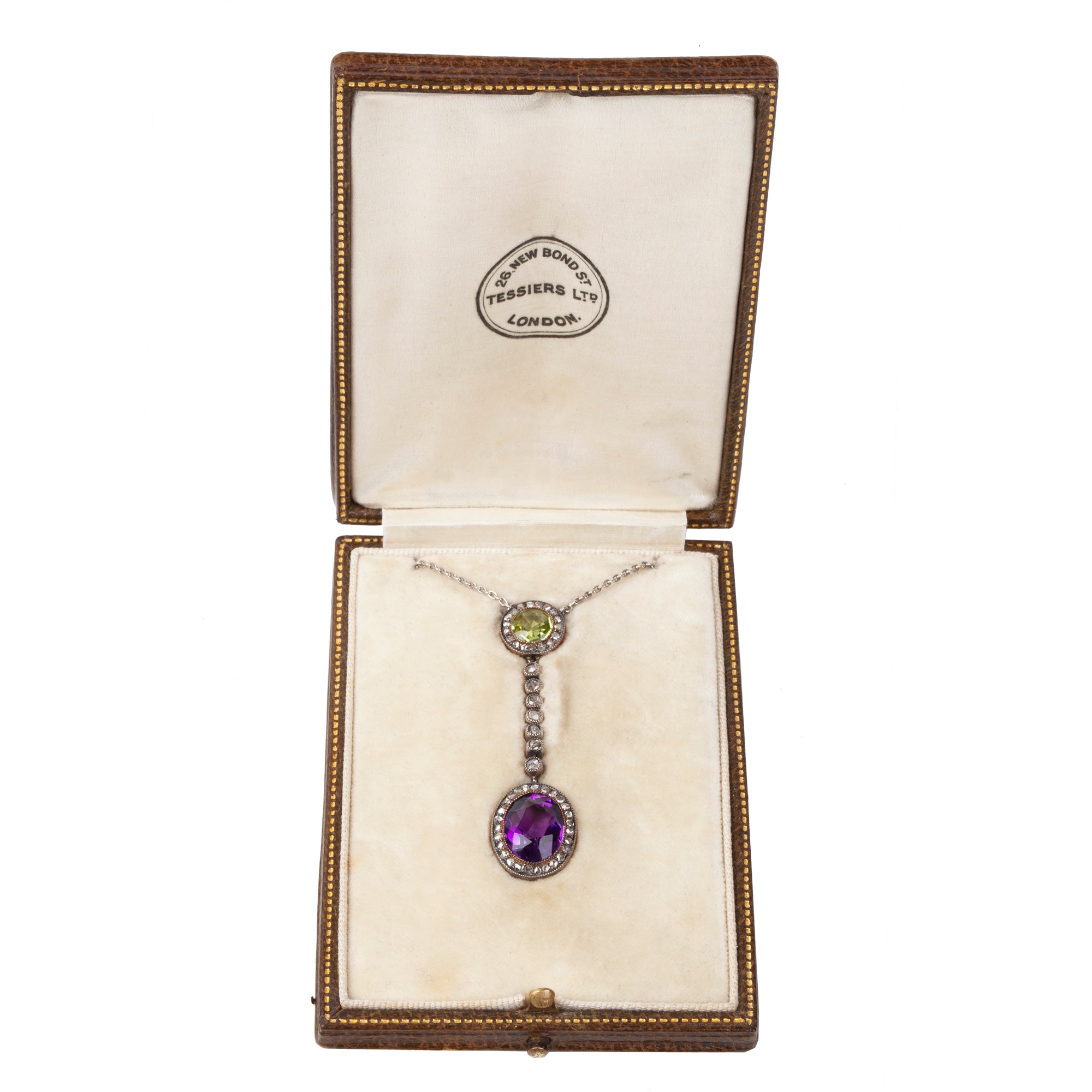 Antique amethyst, peridot and diamond drop pendant, in the colors of the UK movement, green “give”, white “women” and purple “votes”. In silver topped gold setting. Remains the original Tessiers of London fitted box. English in origin. Circa 1905.