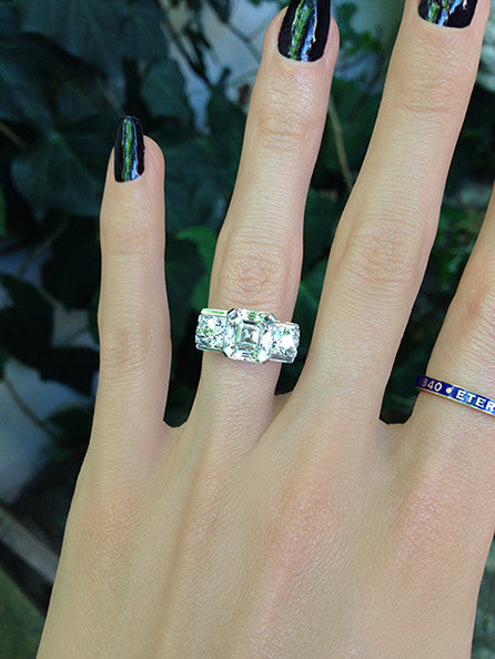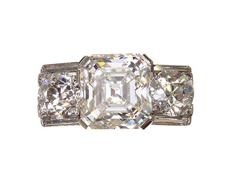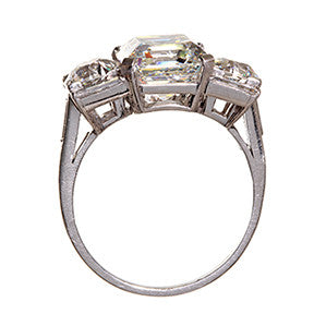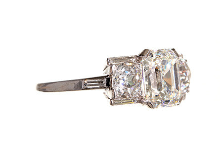 Art Deco Asscher Cut Diamond Ring. Central Asscher cut diamond weighing 3.26 carats. GIA certified to be I in color and VS2 in clarity. Built up crown and nice proportions. Two European cut diamonds set in squared settings weigh approximately 1.00ctw. Four baguette cut diamonds flank the round diamonds. Two baguette diamonds are flush set in each of the shoulders. Wonderful Art Deco Ring. Platinum. Sz 6 can be sized.