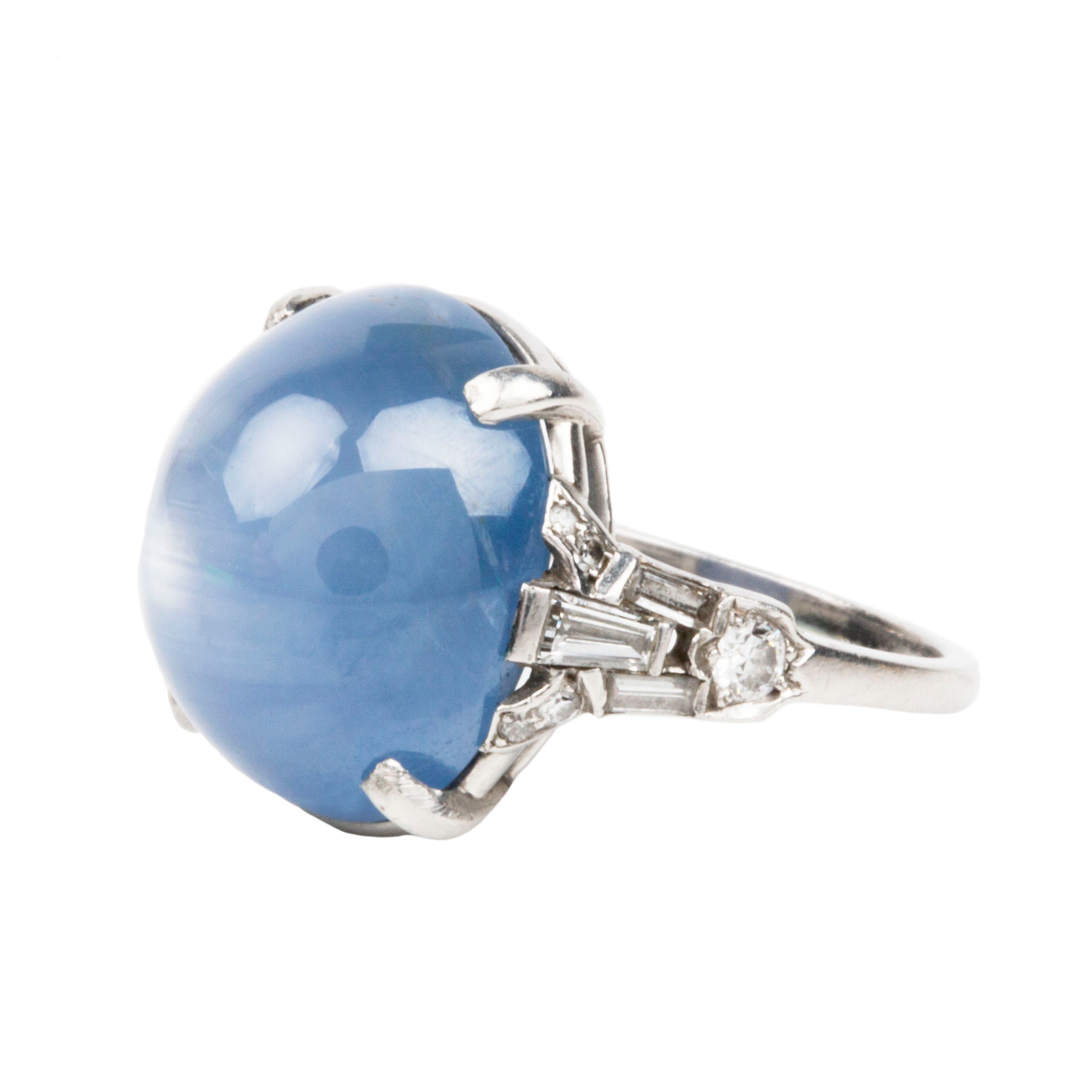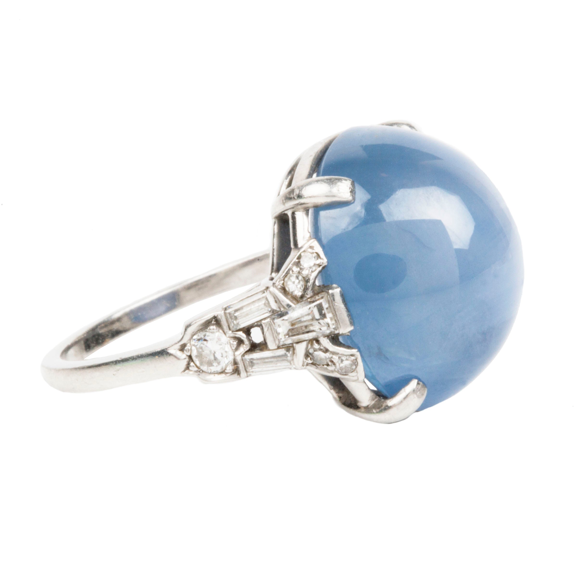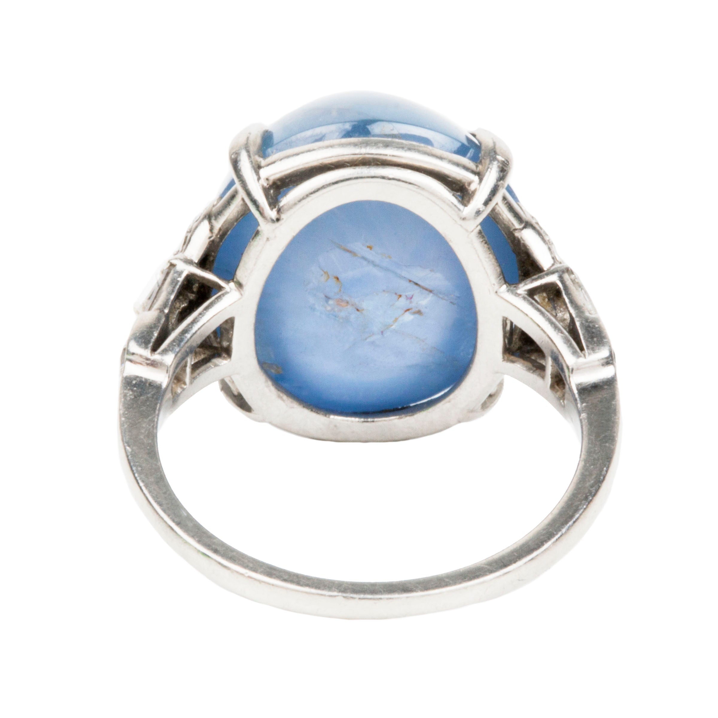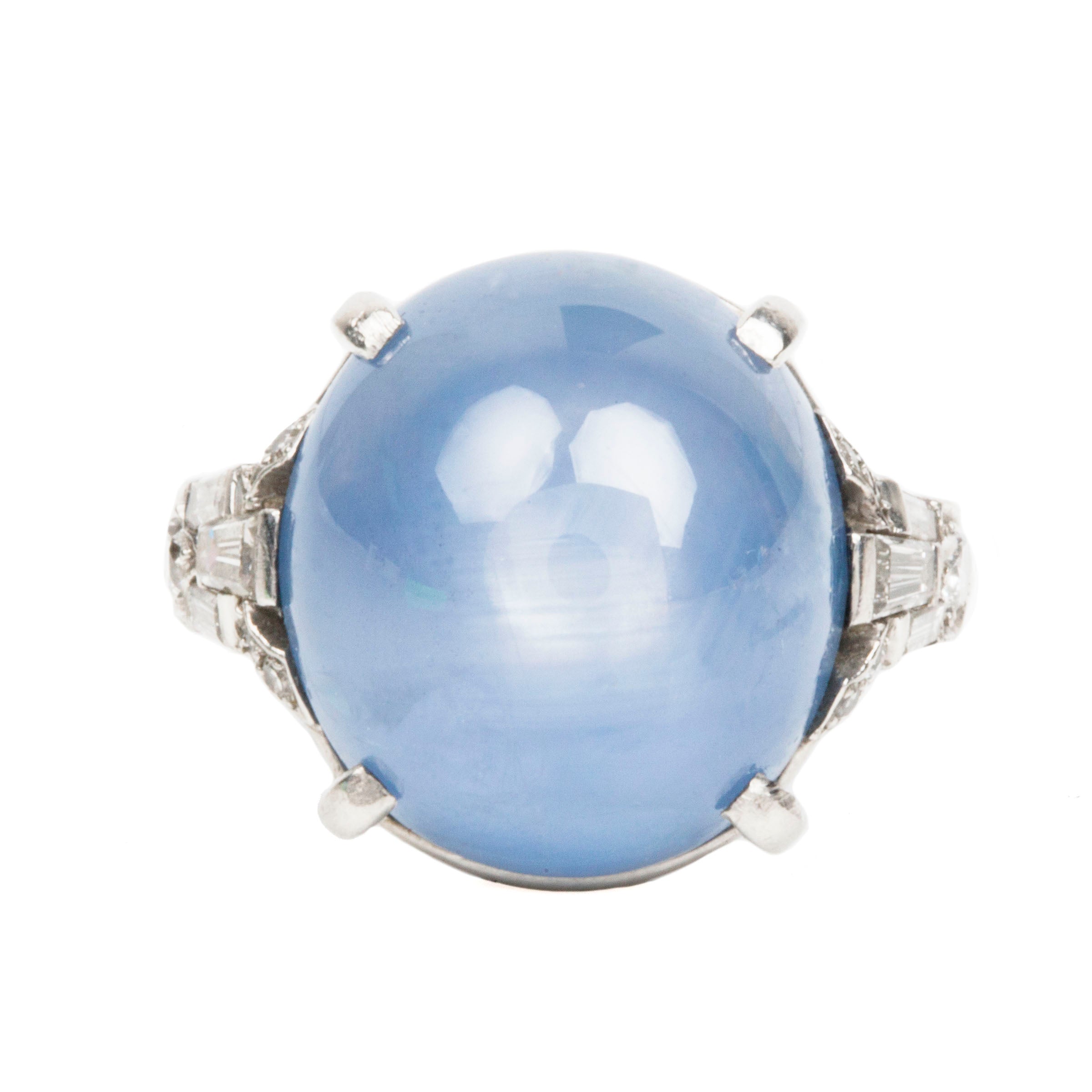 Art Deco Star Sapphire and diamond ring, in platinum setting. Diamond geometric designed shoulders. GIA certified, natural Star Sapphire, Ceylon in origin, 18.86 carats in total weight. American in origin, Circa 1900's.