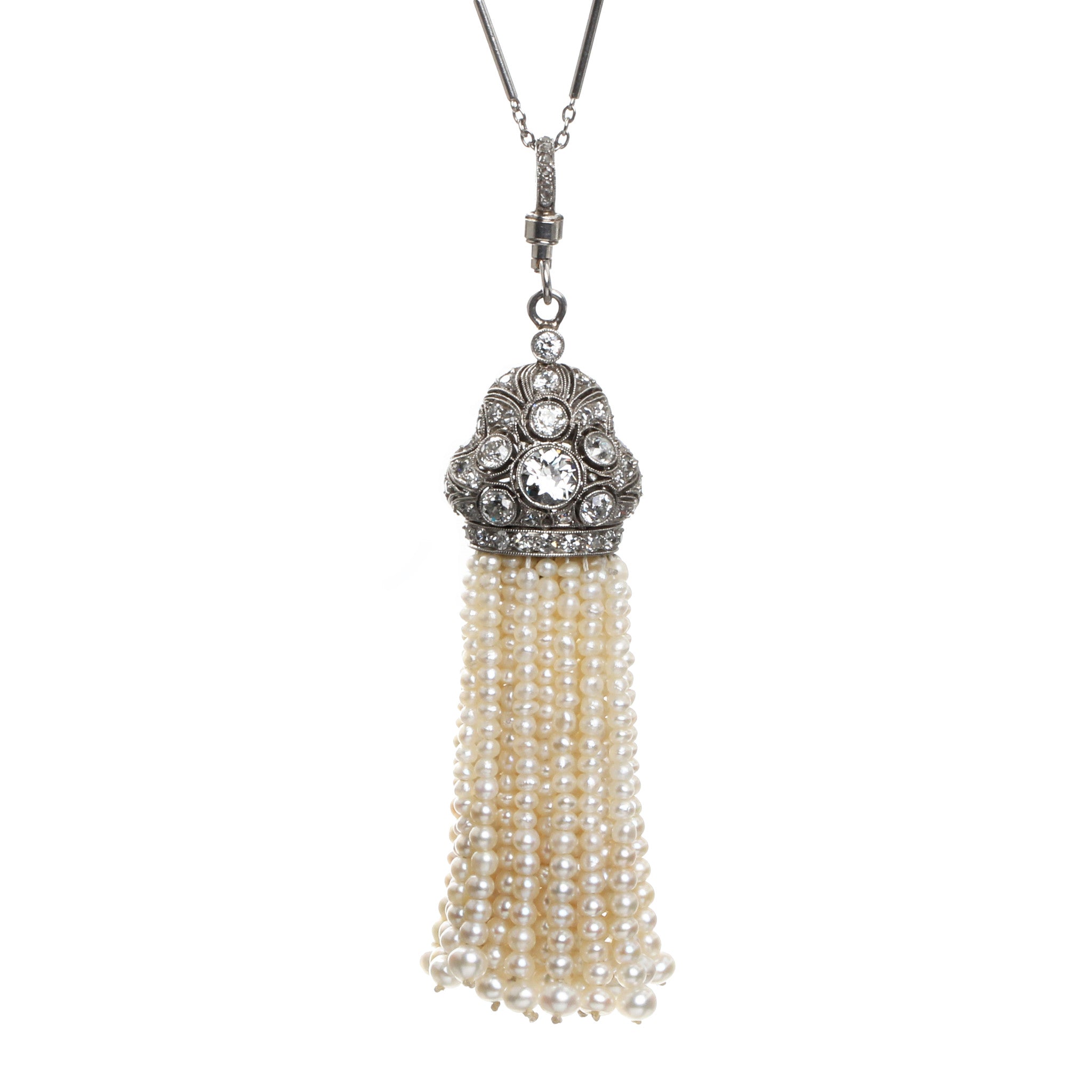 Art Deco pearl and diamond sautoir, tassel necklace, in platinum. European cut center stone surrounded by single cut diamonds. Long delicate platinum diamond chain. Pearl tassel hangs on diamond articulated bail.