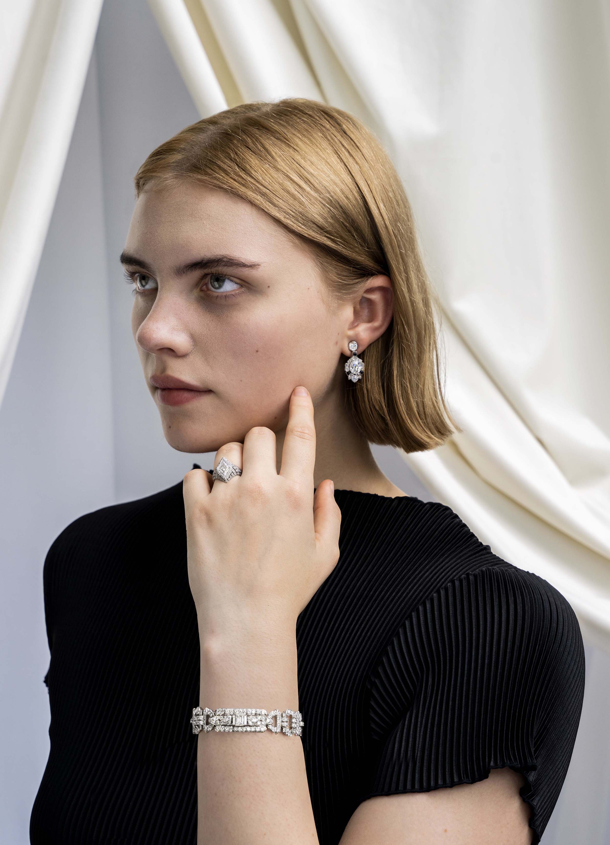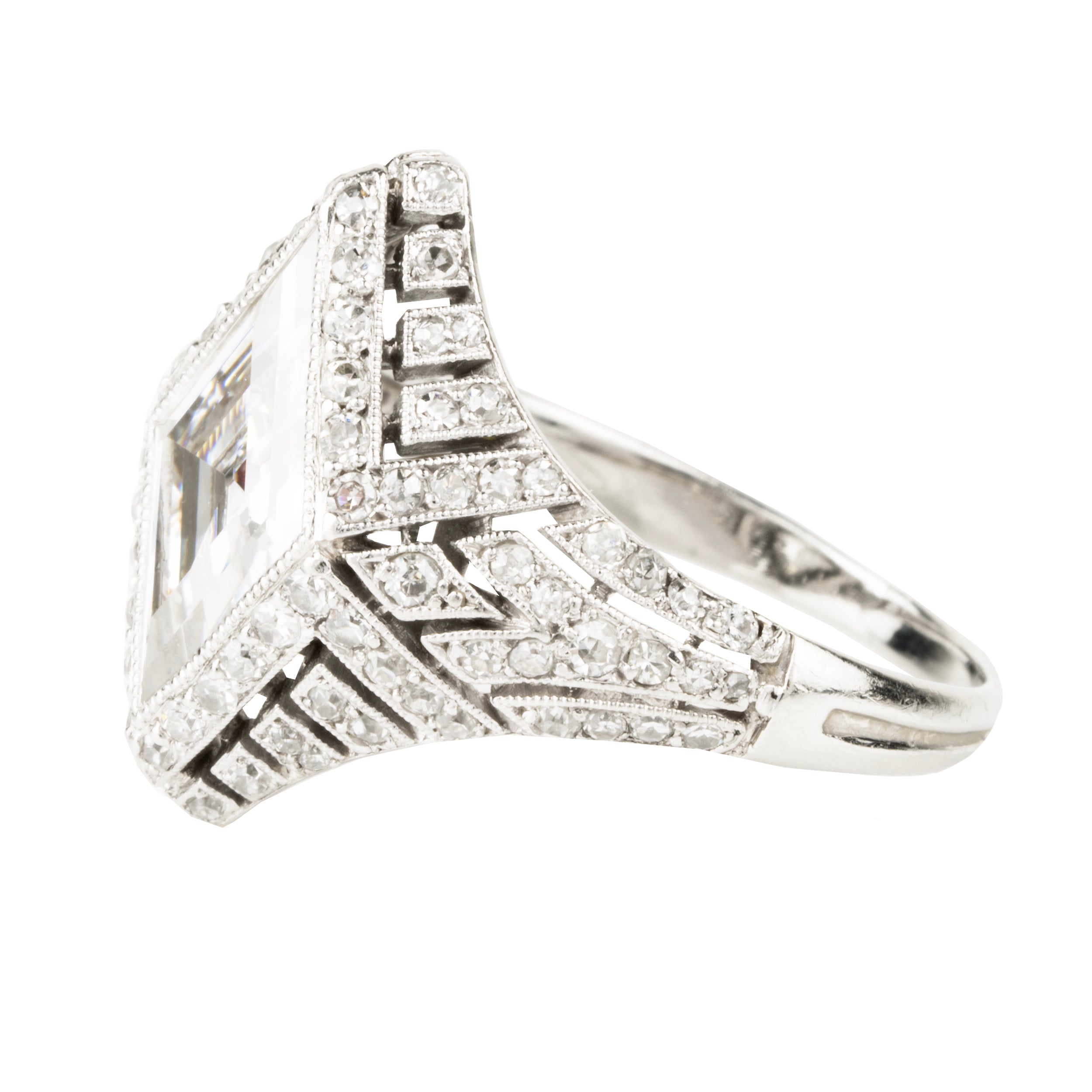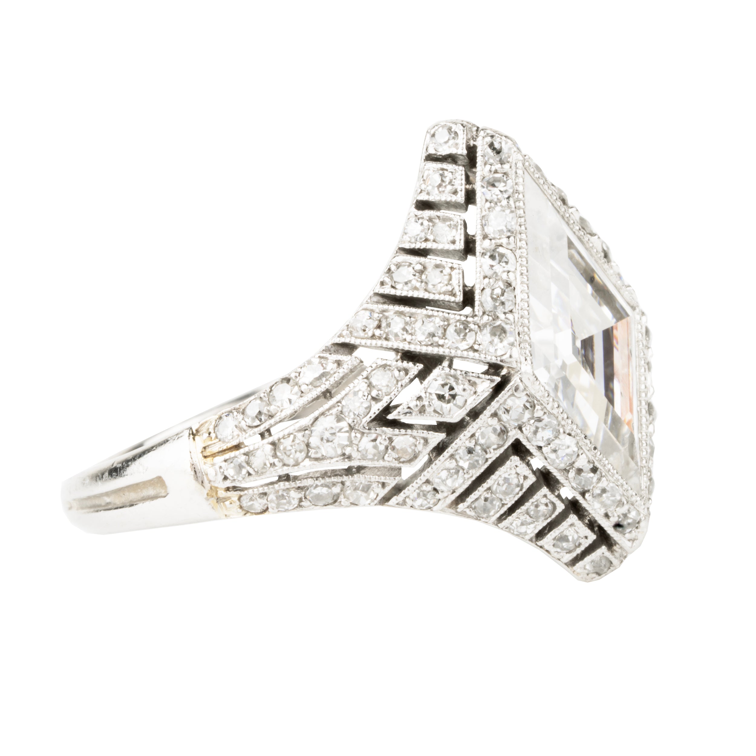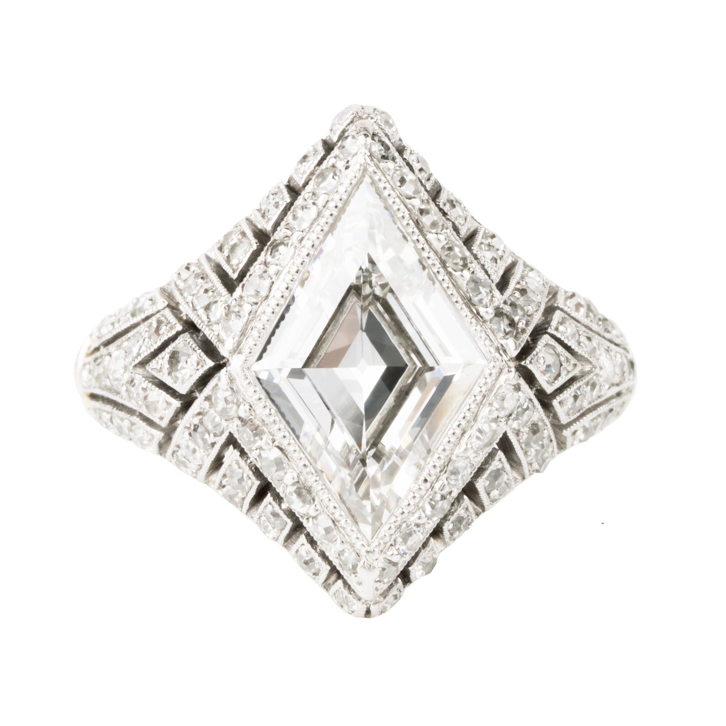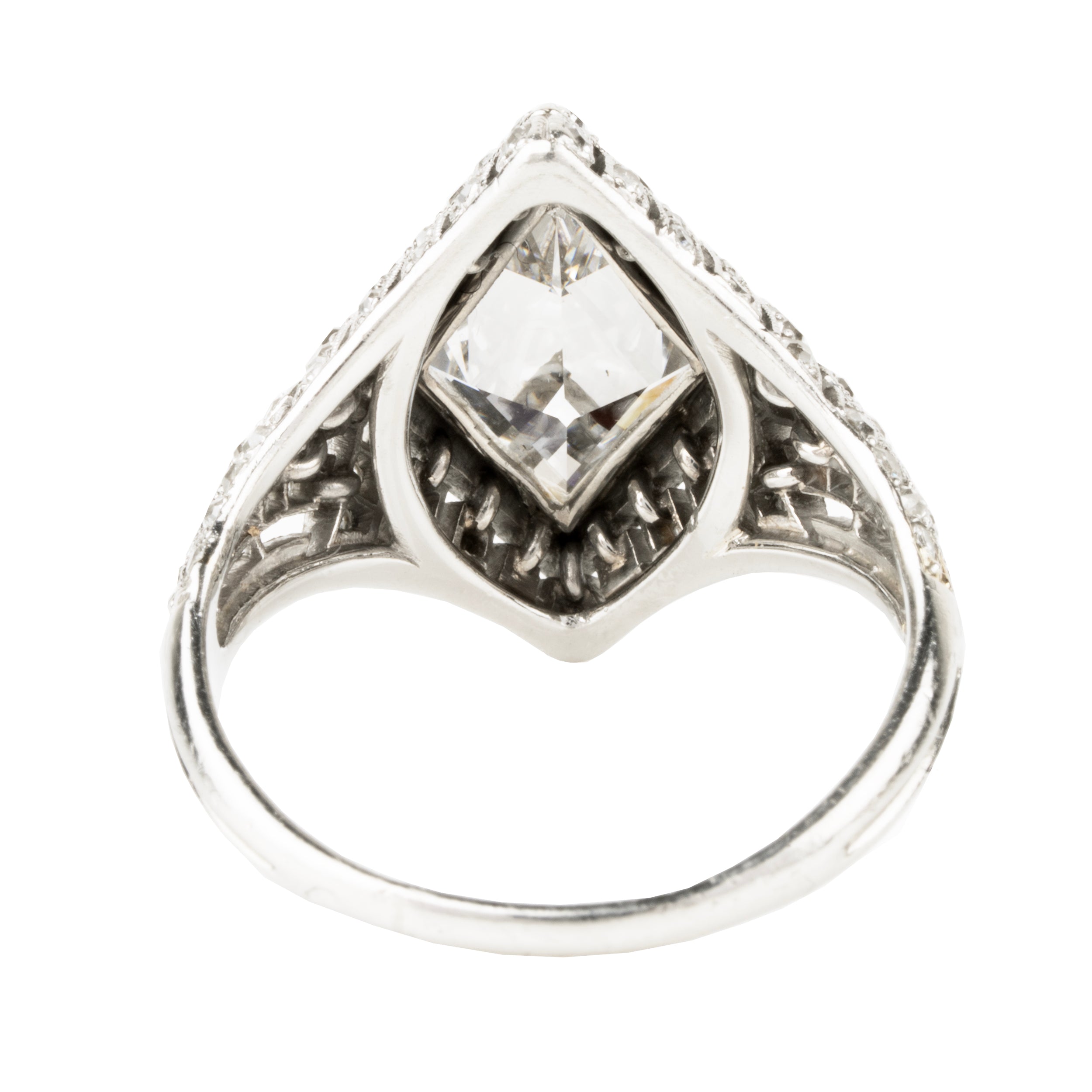 A fine and unusual diamond ring set in platinum. Intricate pierced platinum work of the finest manufacture surrounds a crisp stone weighing approximately 1.9 carats. The diamond is estimated to be E color and SI1 clarity. The additional single-cut diamonds are estimated to weigh an additional .96 carats in total weight. Size 6.5, limited sizing options. France, circa 1920.