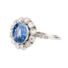 Art Deco sapphire and diamond cluster ring set in a platinum setting. Beautiful unheated 2.90 carat Cornflower Blue Ceylon Sapphire, with approximately 1.20 carats of old cut diamonds. English in origin. Circa 1930.
