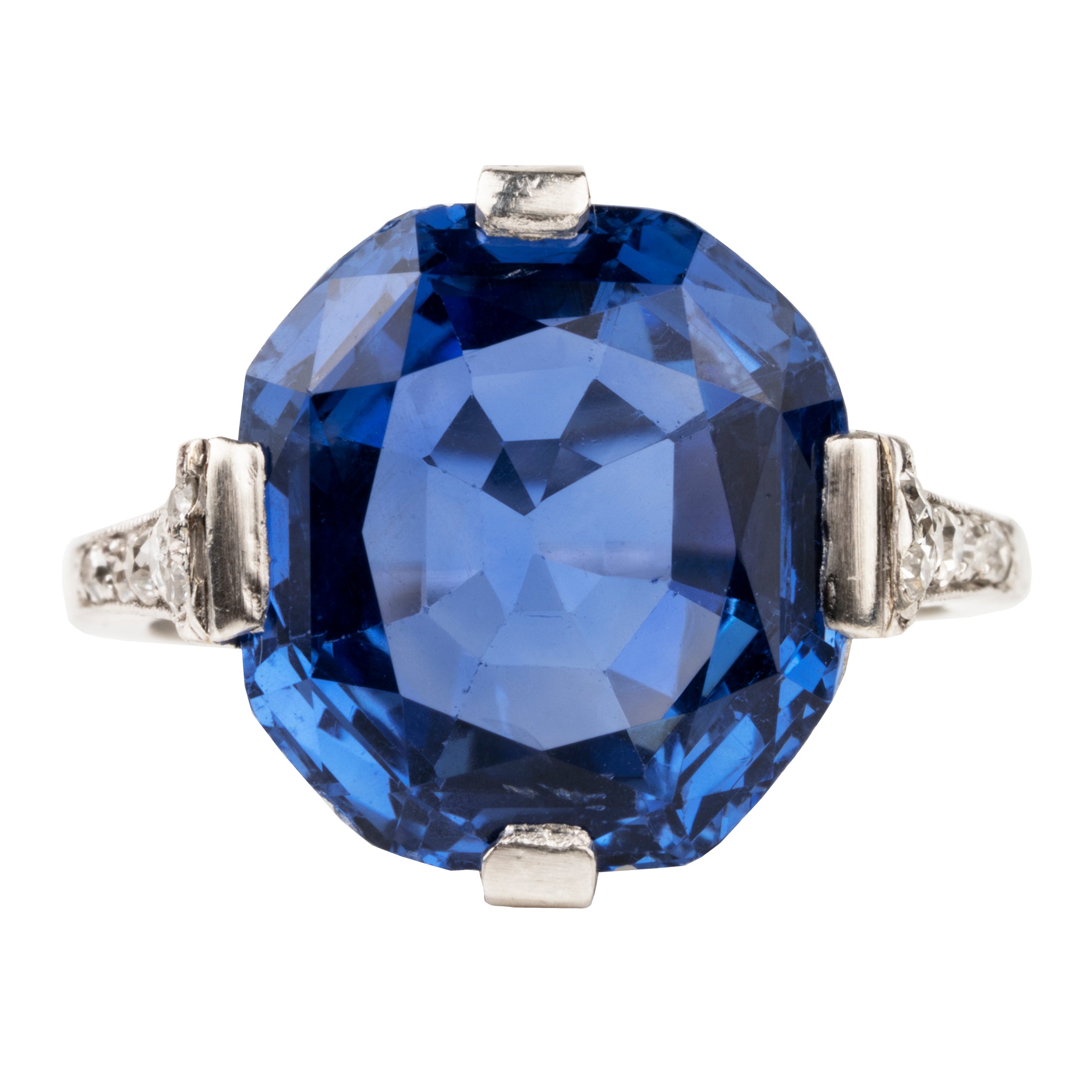 Large scale Art Deco sapphire and diamond ring, in platinum. Approximately 8.50 carat octagonal Sapphire, Burma in origin, no heat.