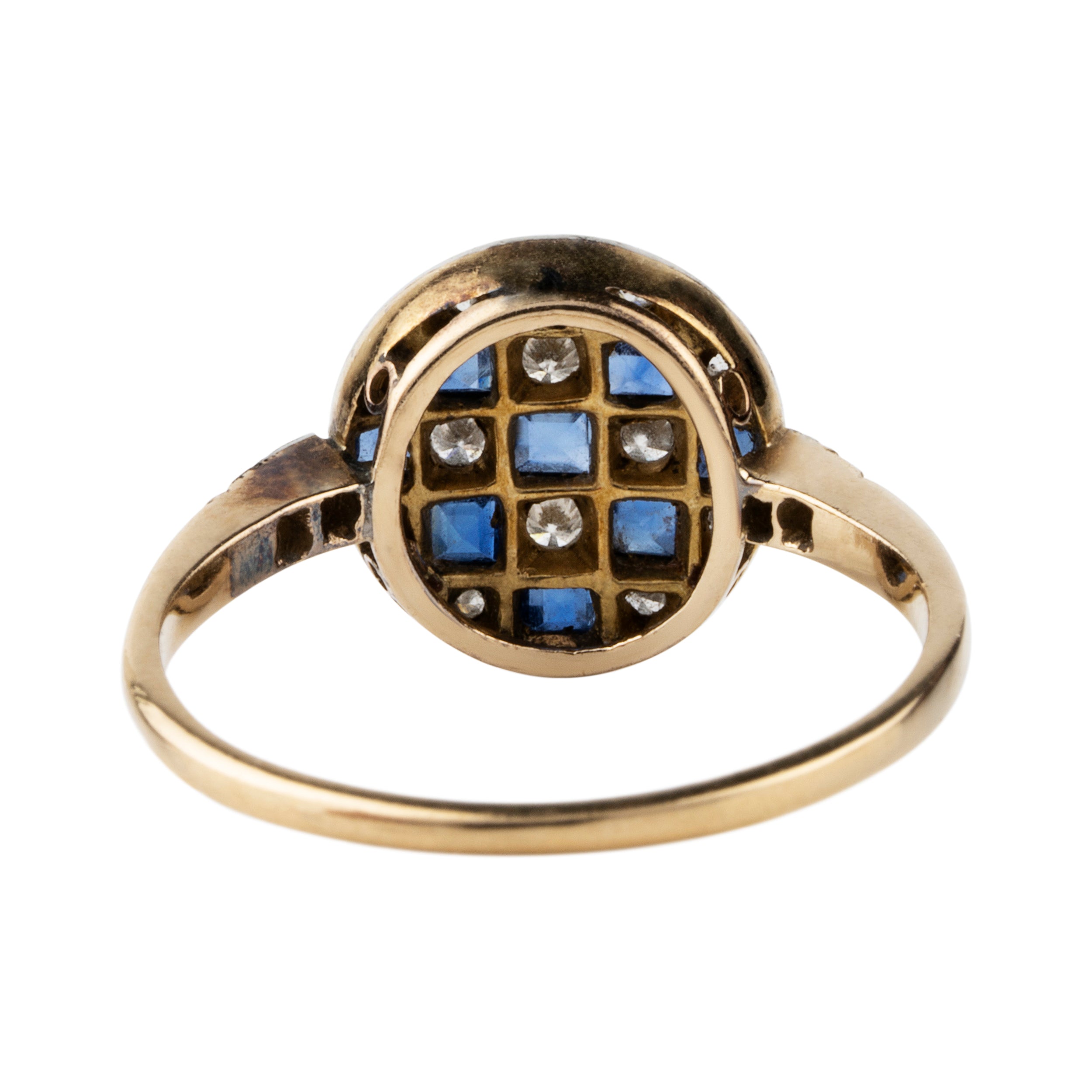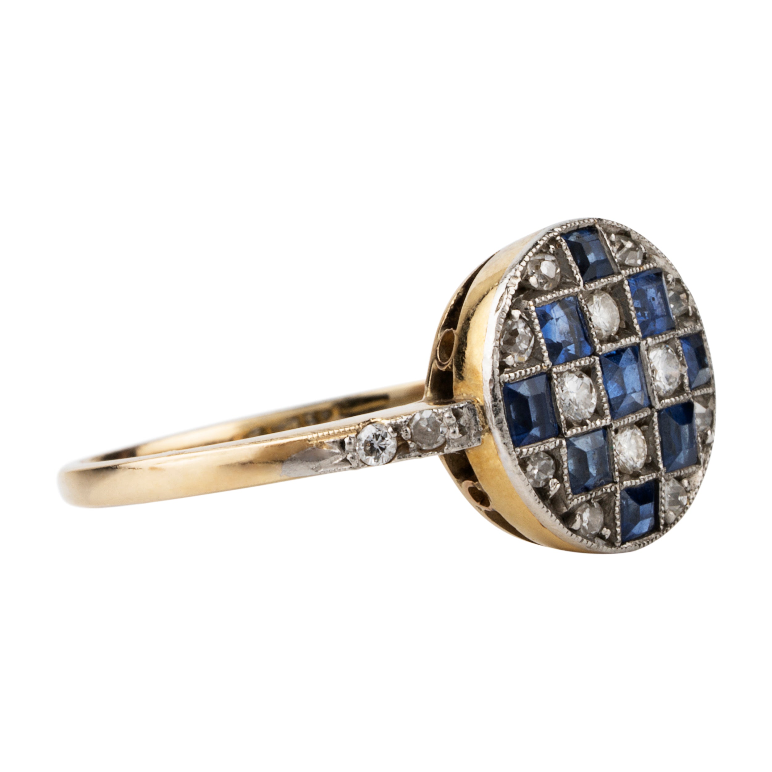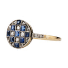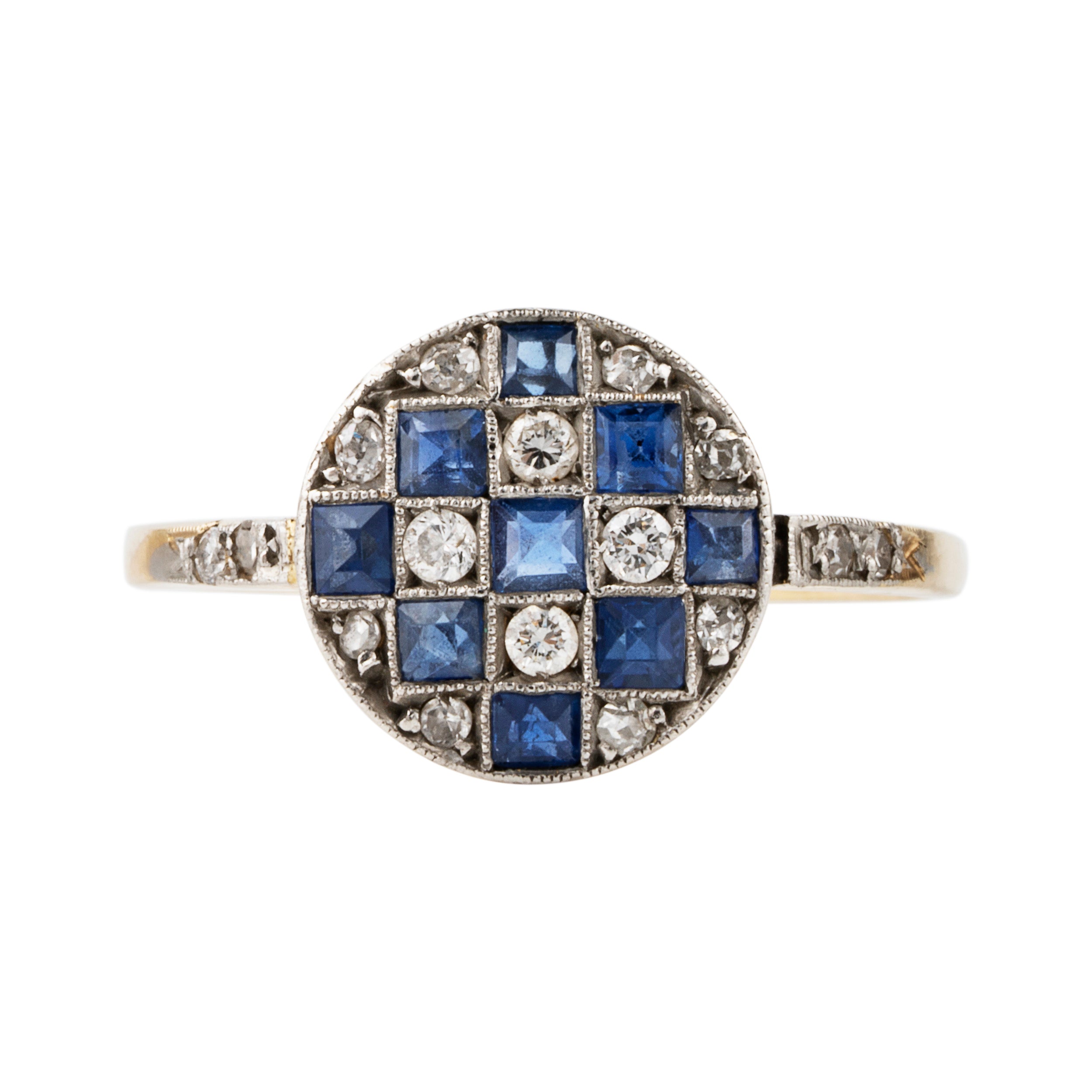 A patchwork of single-cut diamonds and sapphires set in platinum, topped with gold.