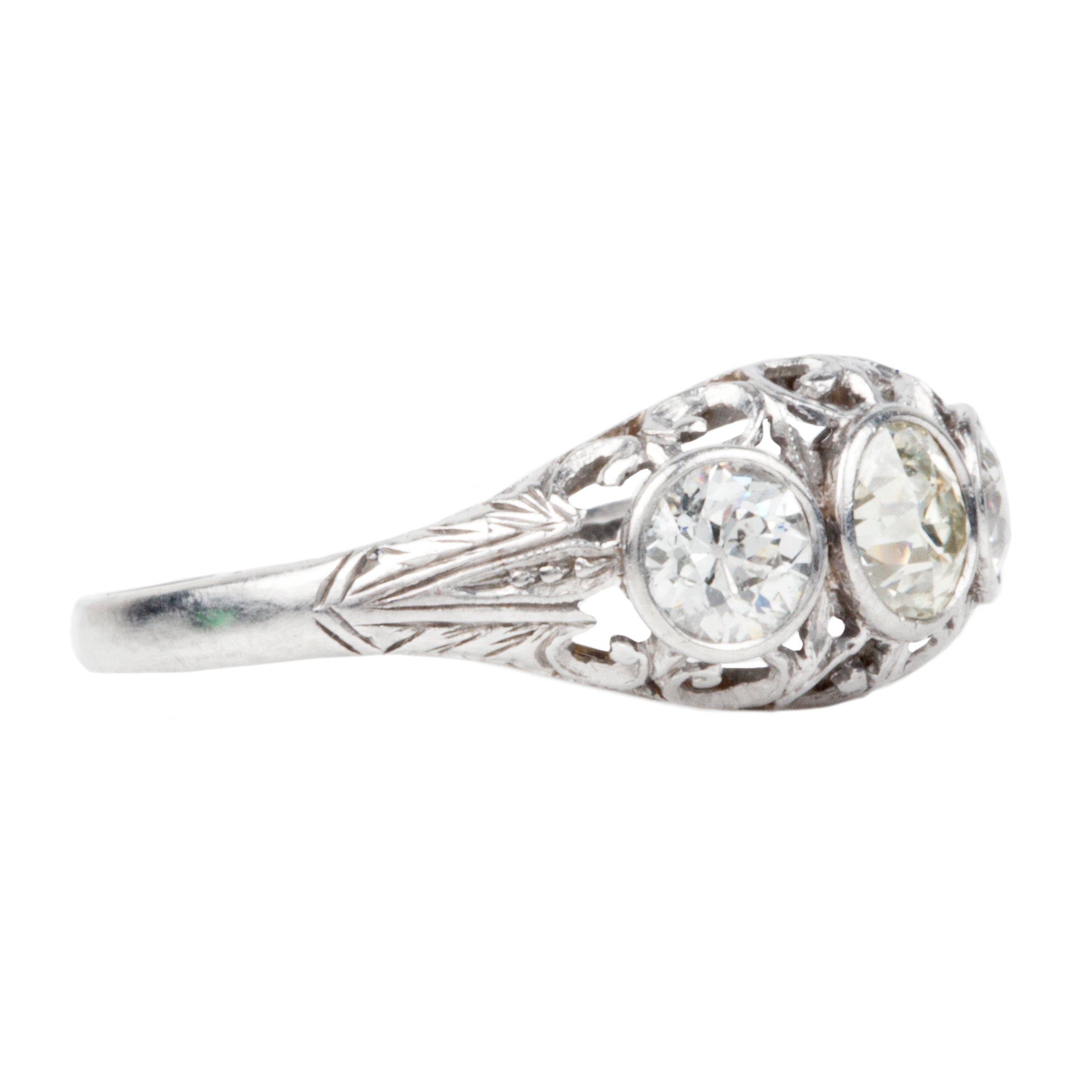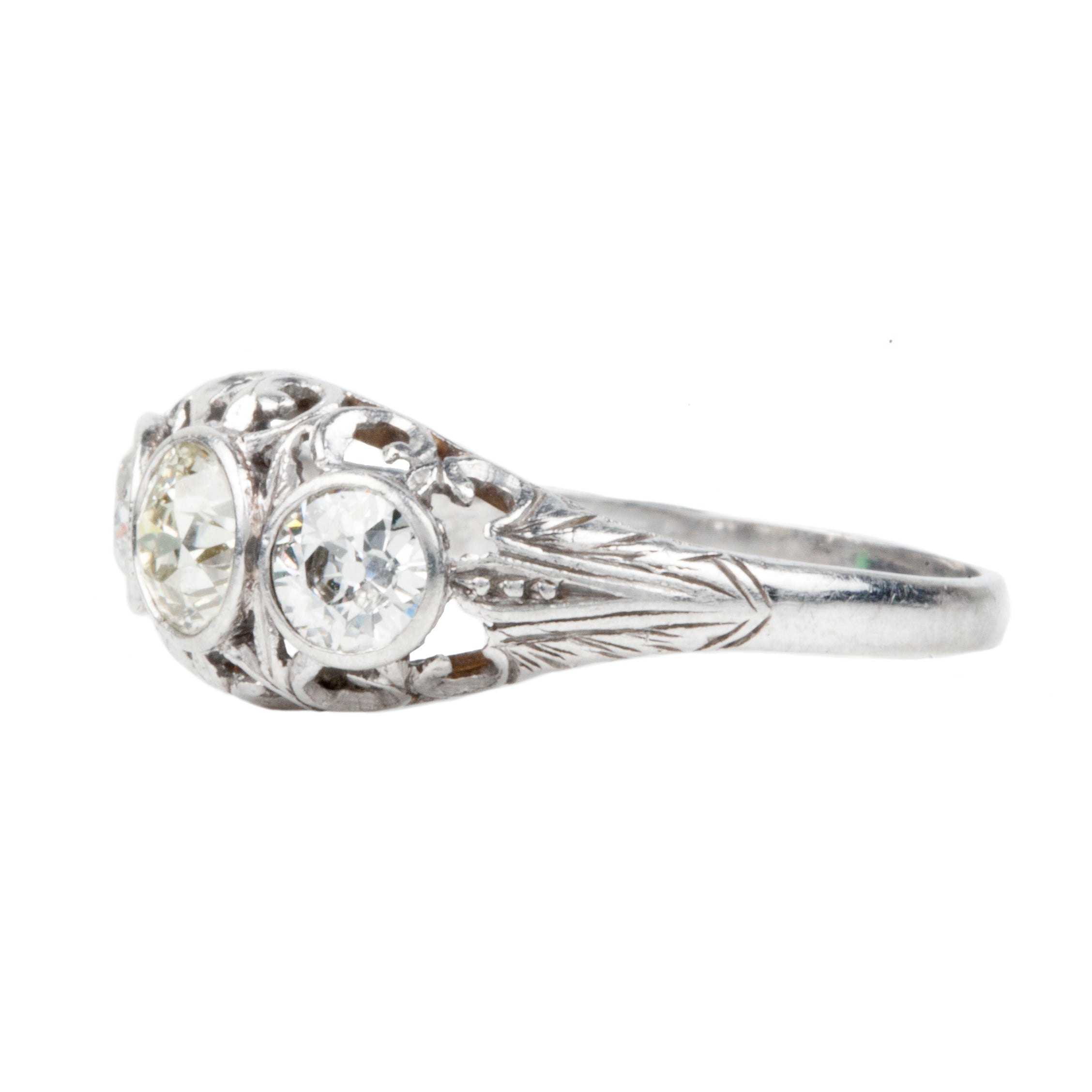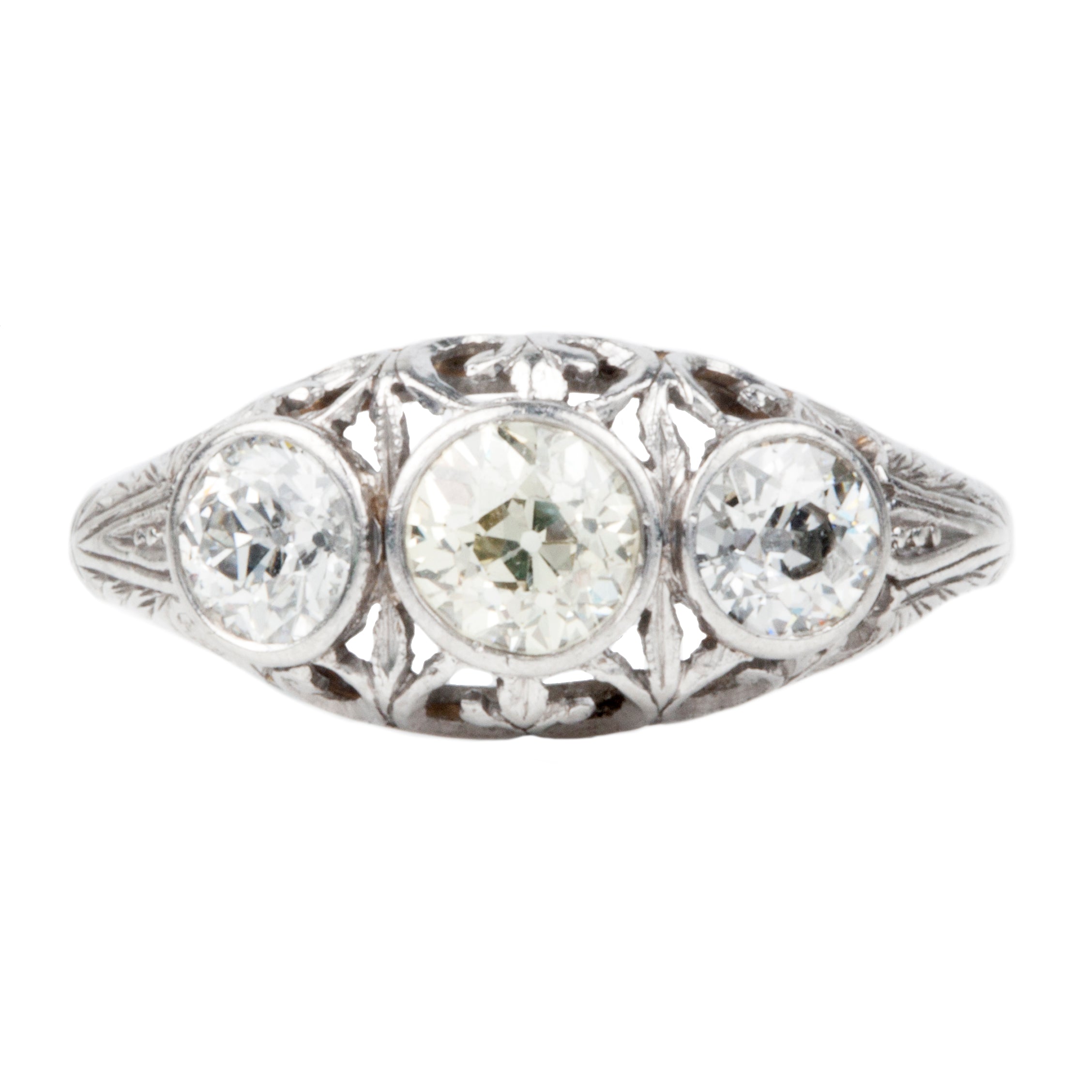 Edwardian Era three stone ring with three Old European Cut diamonds, in platinum setting. Beautiful pierced handmade platinum setting with fluer de lis details. The center stone is a warm light yellow (m-n color) flanked by two white diamonds.