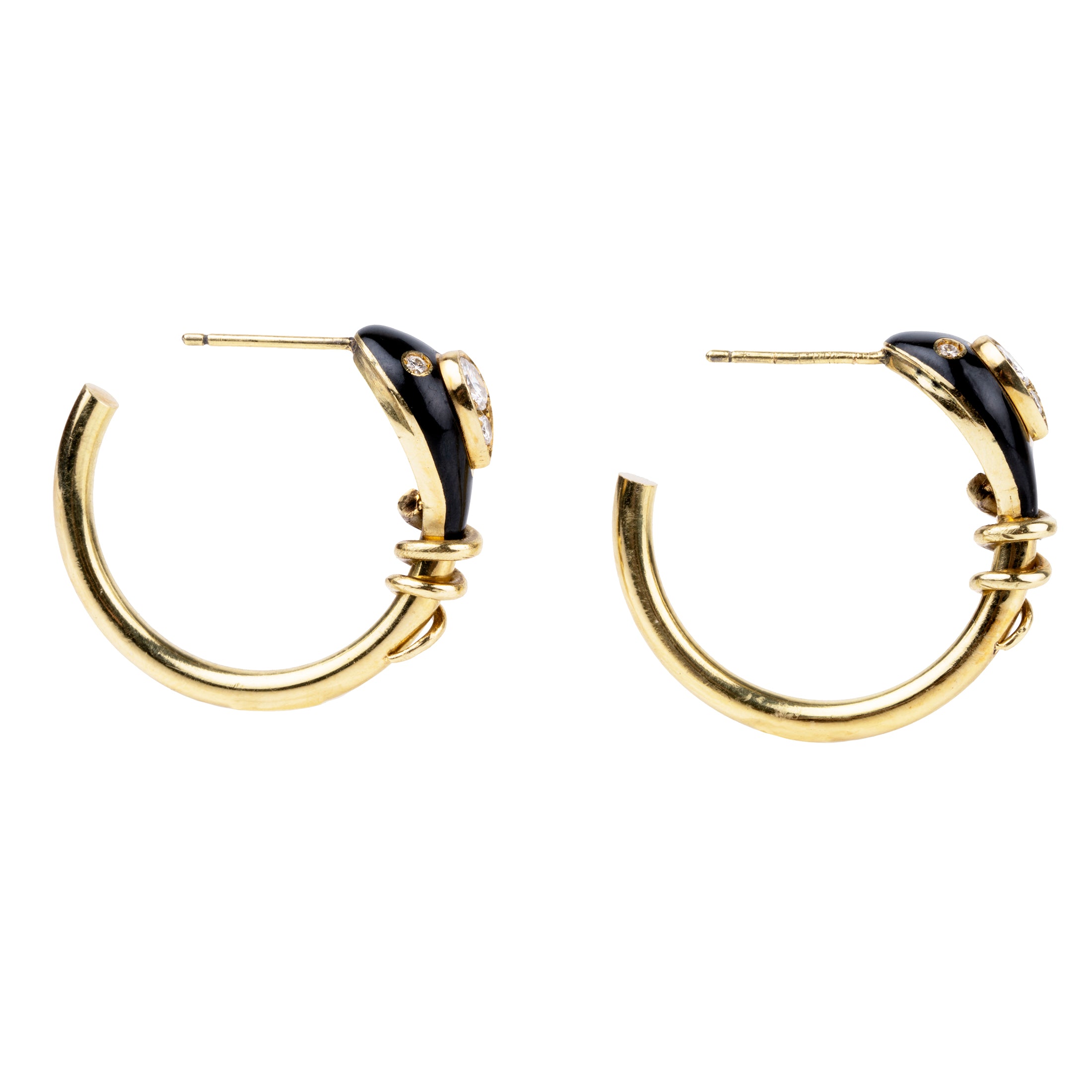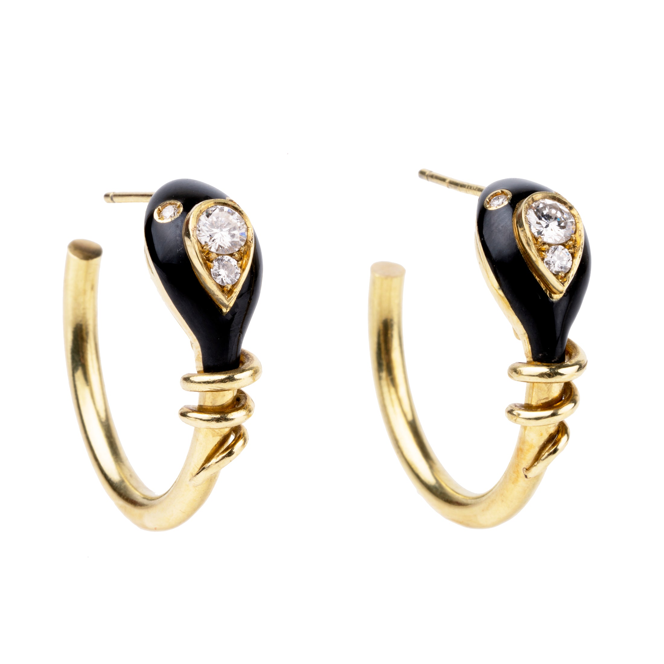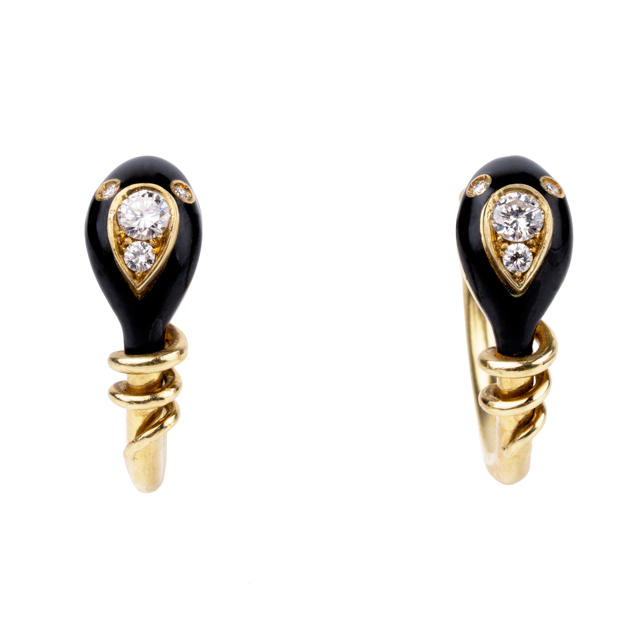 Bell and Bird Black Enamel and Diamond Snake Hoop Earrings