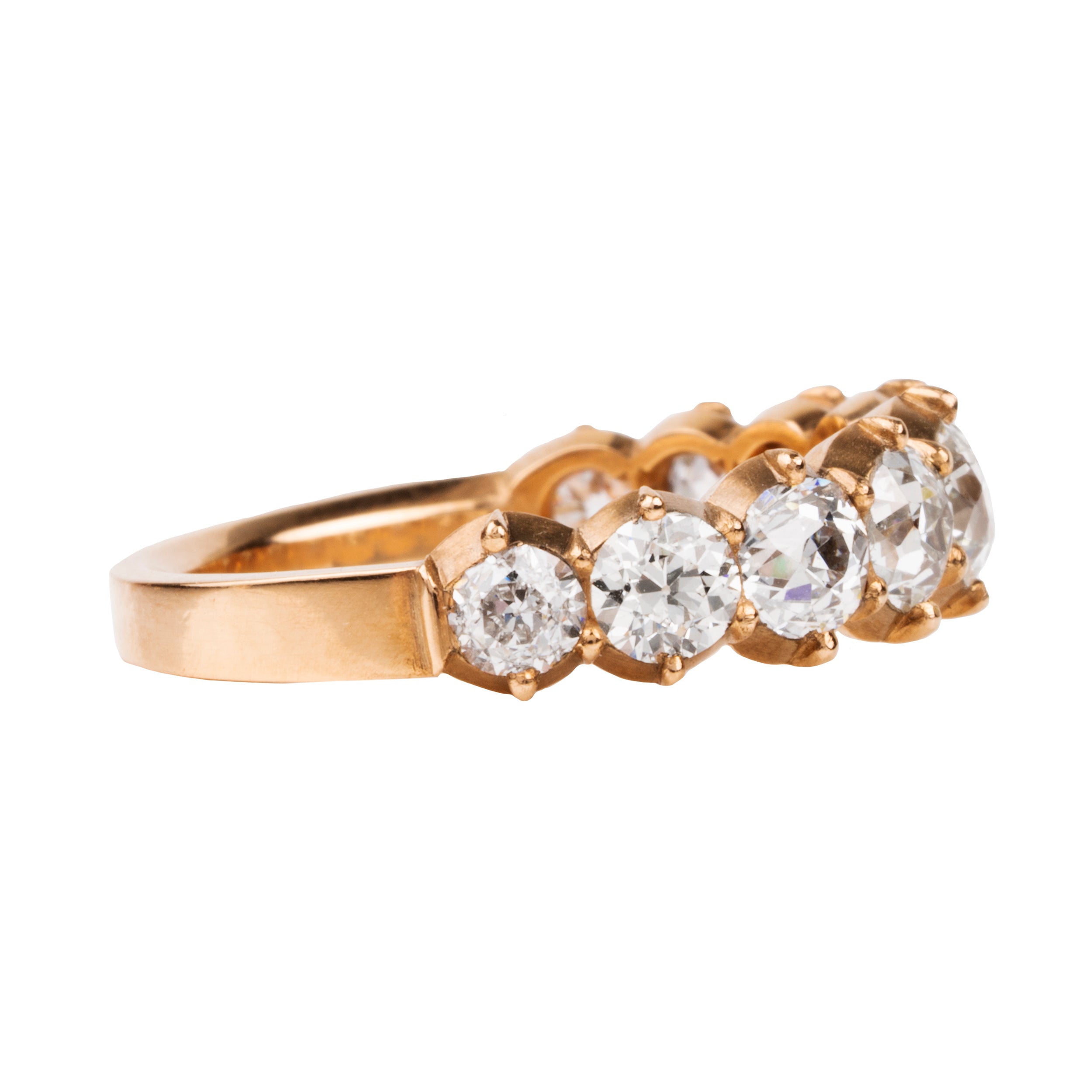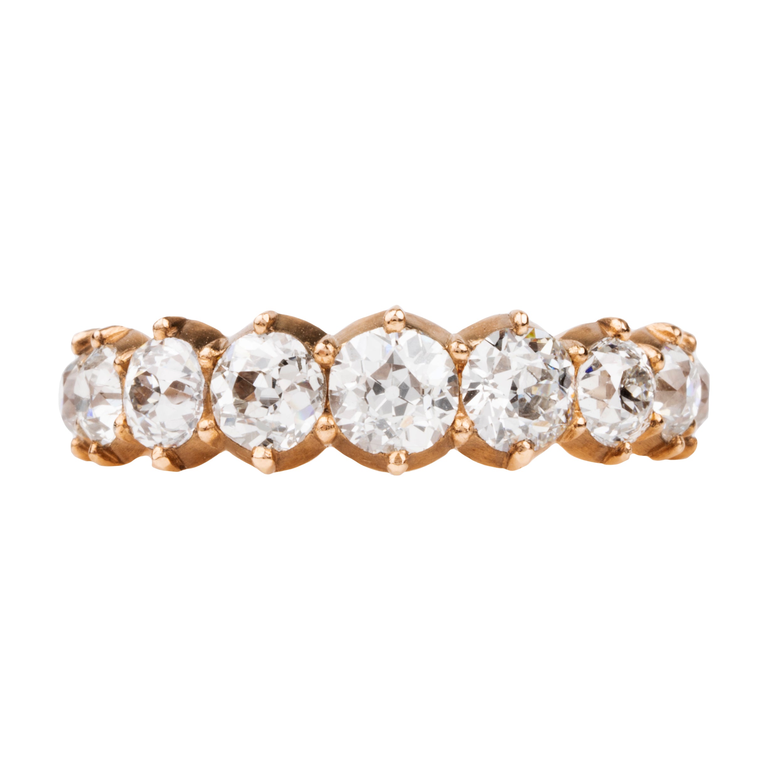 One of our signature designs. Each ring features a unique set of slightly graduated old European cut diamonds. It often takes months to collect a suite of stones in the correct size, color and clarity. This ring features nine 19th century old european cut diamonds, approximately 2.25 carats in total diamond weight, set in 18k gold.