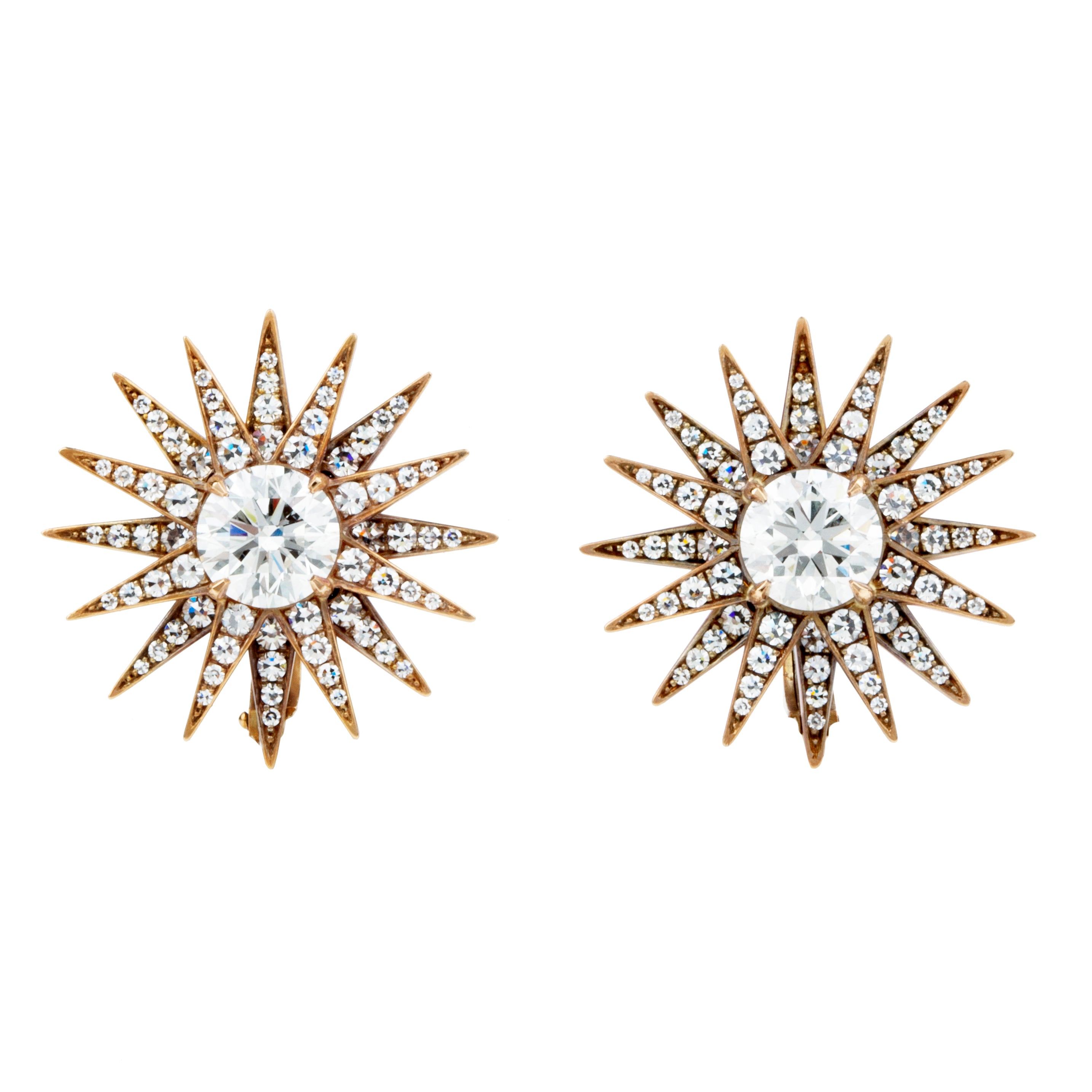 Inspired by the 19th century celestial jewels, our modern starburst earrings have over 2.4 carats in combined weight in the two principal diamonds. There are 160 additional single-cut diamonds set in oxidized 18k gold. Finished with handmade hinged backs of our own design. Central diamonds are certified I color, VS1 and VS2, ideal-cut diamond.