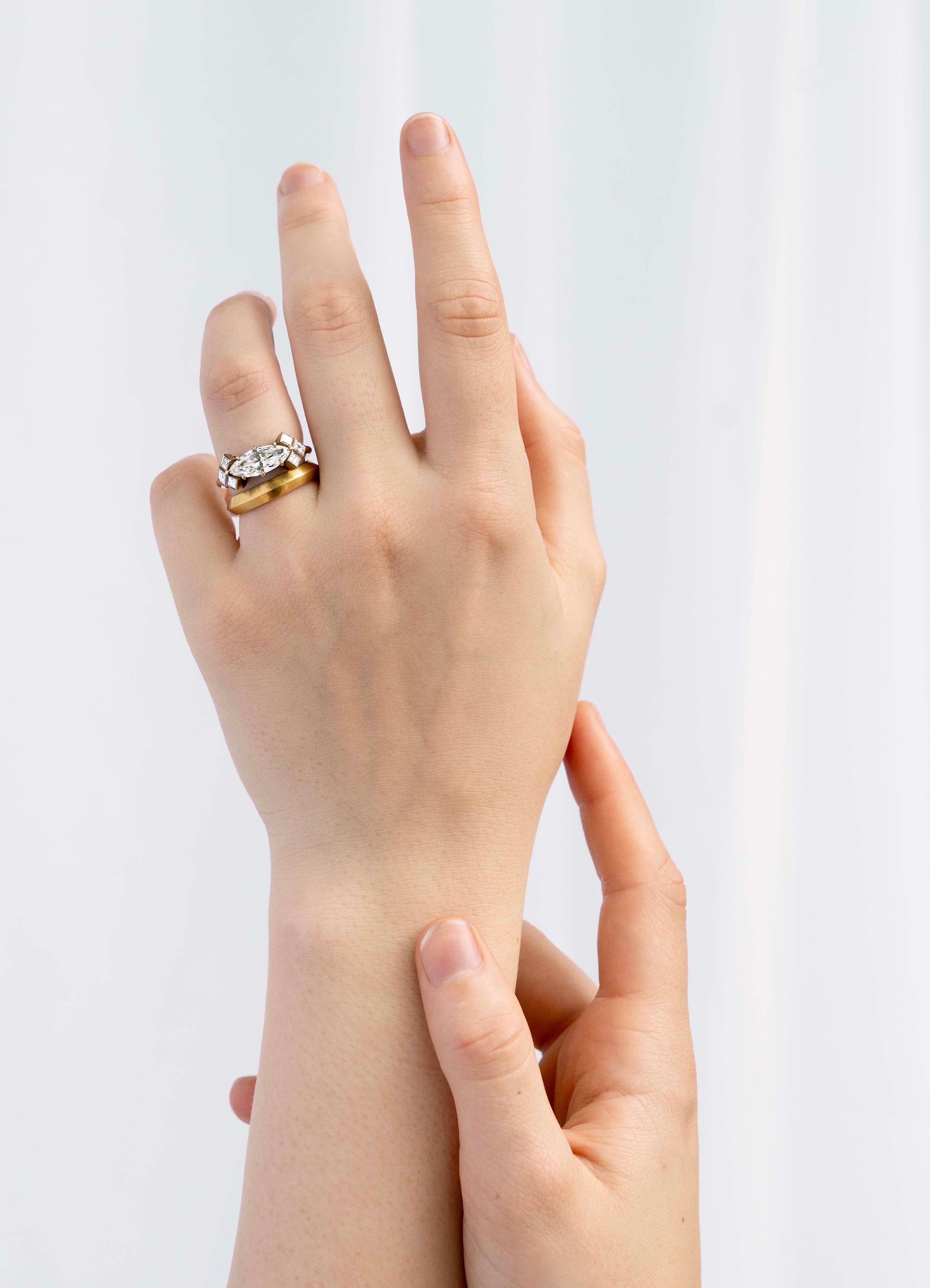 The density of pure gold is surprising. For thousands of years, humans have been drawn to gold; its magnetism is clear when you hold it in its pure form. Our pieces forged in 22k have a warmth and appeal hard to put into words. This rich color looks at home with antique and modern rings and will develop a beautiful softness with age.