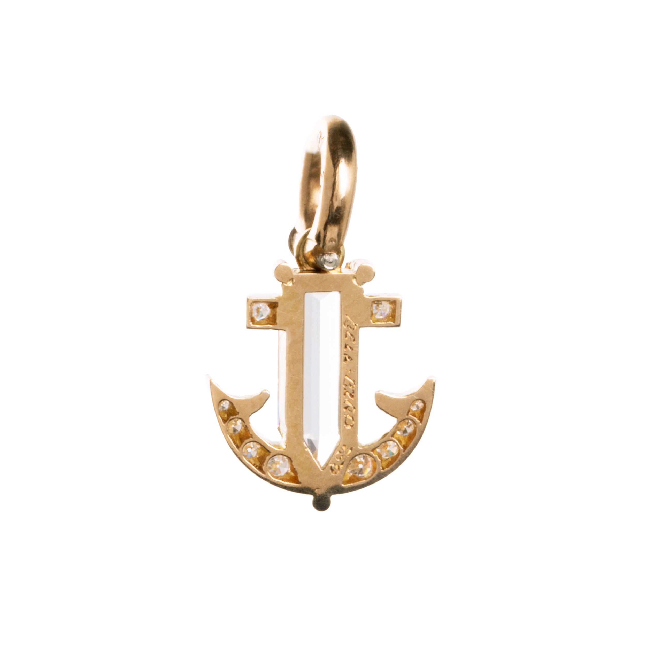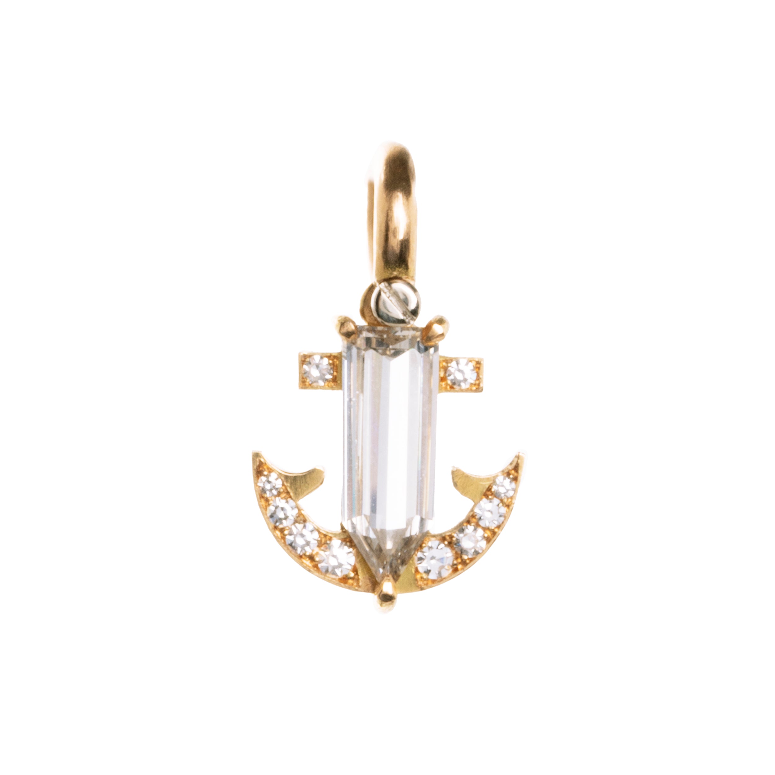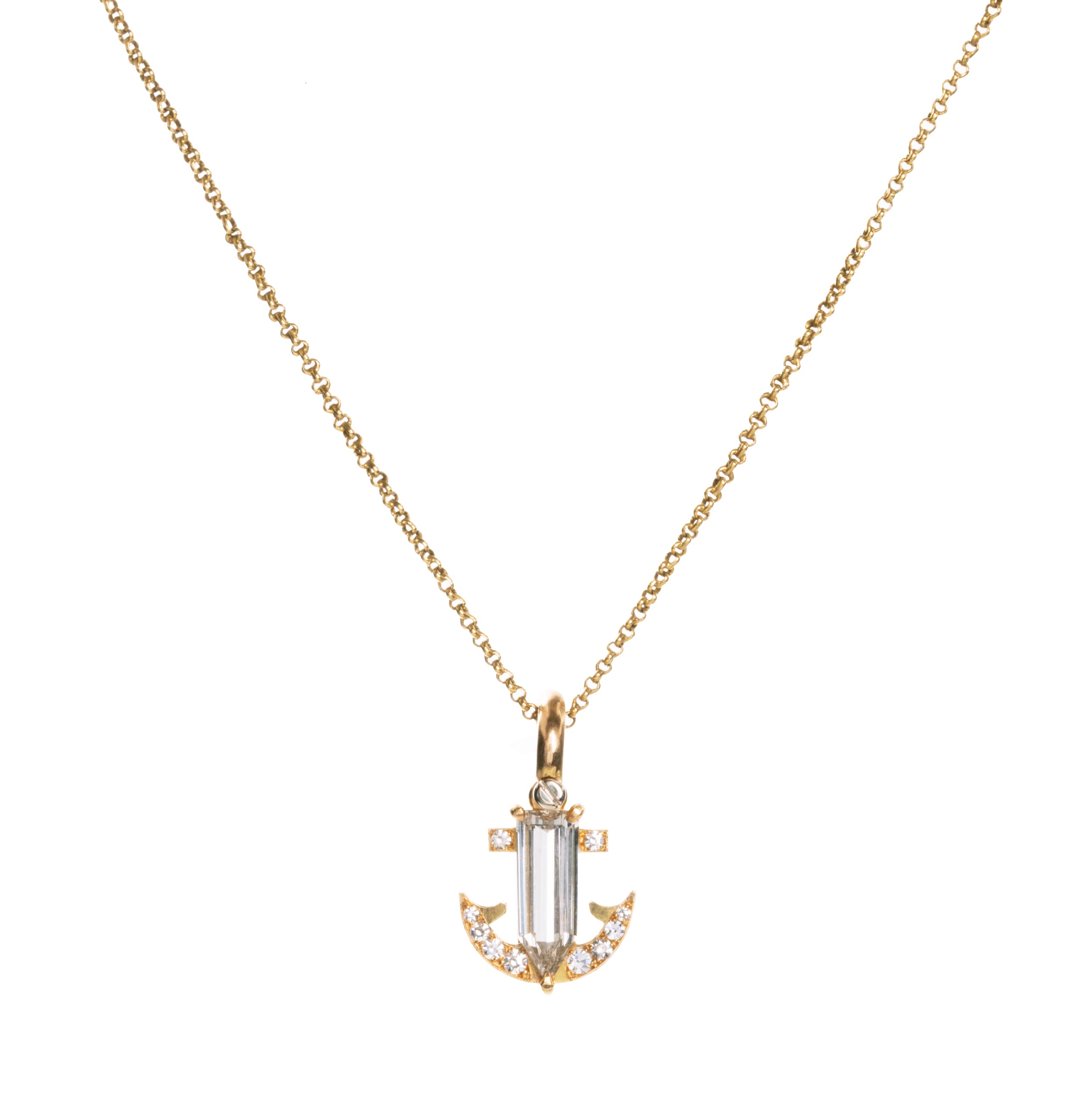 Hand-fabricated diamond anchor pendant in 18k old gold. This design is inspired by similar Victorian-era anchor jewelry pieces that we have encountered over the years. We have created a modern interpretation of this classic motif. The pendant is hand-fabricated from solid 18k old gold with a central 1.62 carat bullet-shaped diamond and 10 additional round single cut diamonds. Our jewelers have hand engraved our makers mark and metal content.