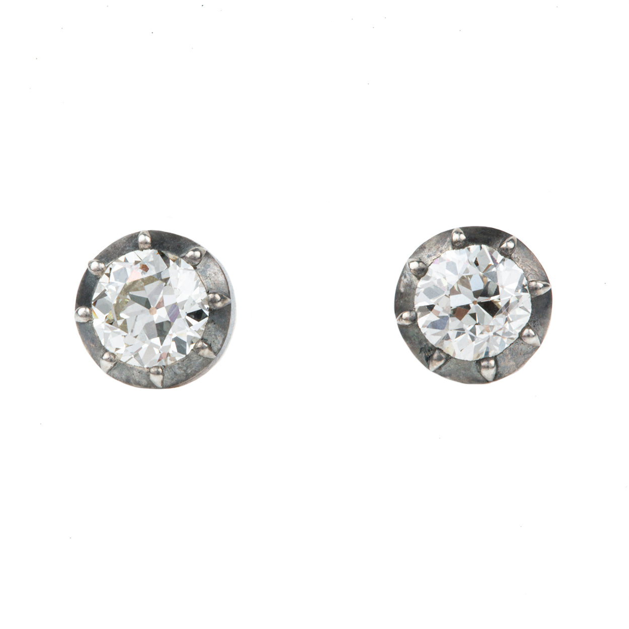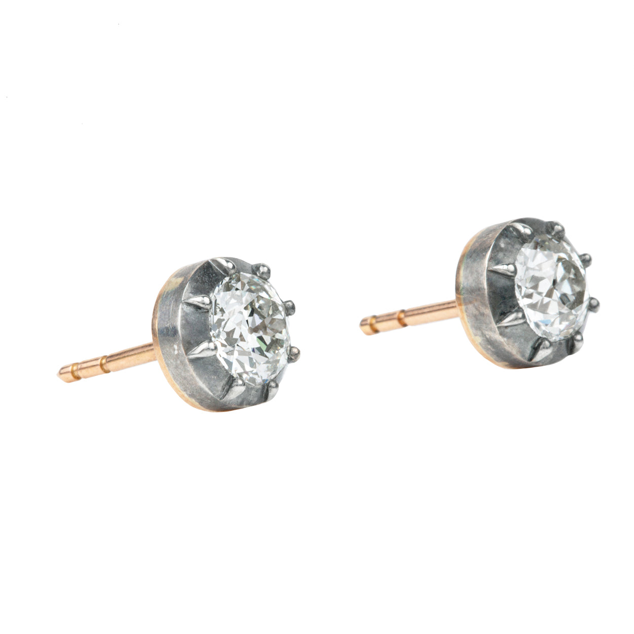 Our design for these earrings is inspired by Georgian and Victorian Era cutaway settings. Entirely hand fabricated they feature silver-topped gold, cutaway collet settings. This is a labor-intensive setting technique common in 18th and 19th century. The silver-on-gold technique is true to the rings that inspired this design and are rarely seen in modern jewelry. The earrings feature two old European cut diamonds, approximately 1.60 carats in total diamond weight, K/L color, and SI in clarity.