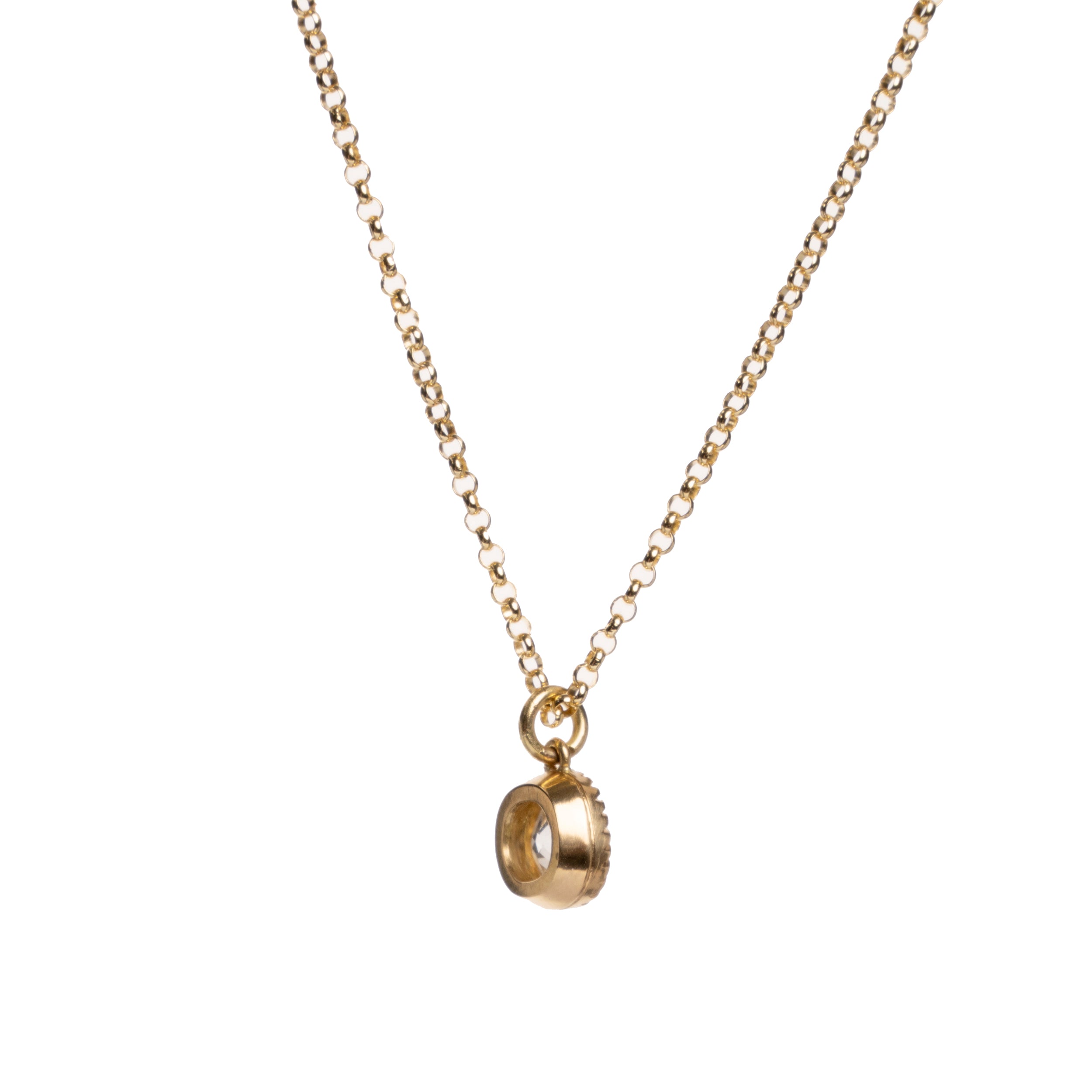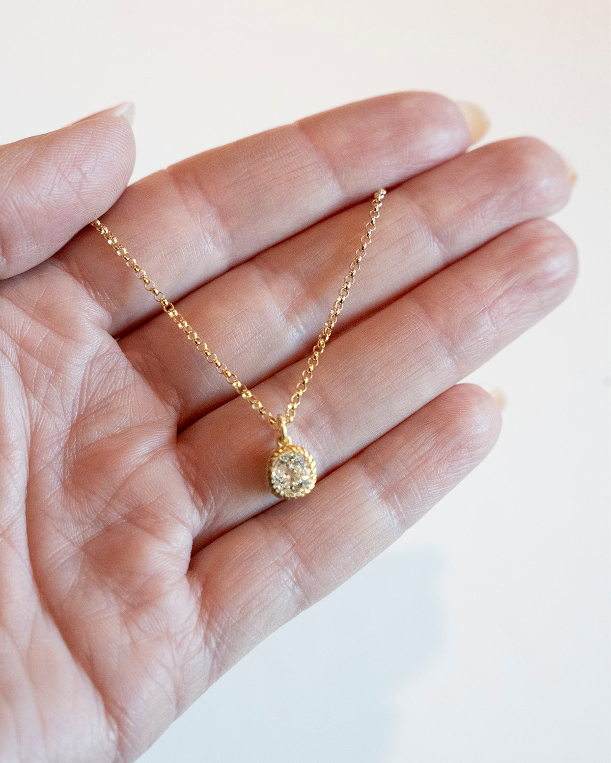 This diamond pendant features an old mine cut. The old mine cut weighs approximately .95 carats, K color, and SI1 clarity. Set in a delicate miligrain-edged setting that is hand-fabricated in our 18k old gold.
