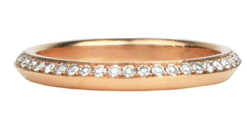 We designed our knife-edge band after an antique French alliance band we found in Paris. This version has a single knife-face pavé set with single-cut diamonds. Each ring is manufactured specifically for you in our workshop. The ring can be made in our signature 'old' gold or our 18k yellow gold. The 'old gold' is our custom blended rose gold. The color is unique to Bell and Bird and inspired by rings from the late 19th century. It looks great with antique rings as it has a darker tone than commercially available pink gold.