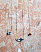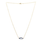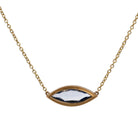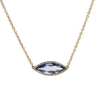 This solitaire sapphire pendant features a single marquise shaped sapphire. The stone is certified to be 2.37 carats, with no heat treatment. The stone was sourced in the Umba river valley in Tanzania. A lovely light steely blue in color it is surrounded by single cut diamonds. The setting is a hand made in silver topped 18k gold. Our jewelers have hand engraved our makers mark, serial number and metal content.