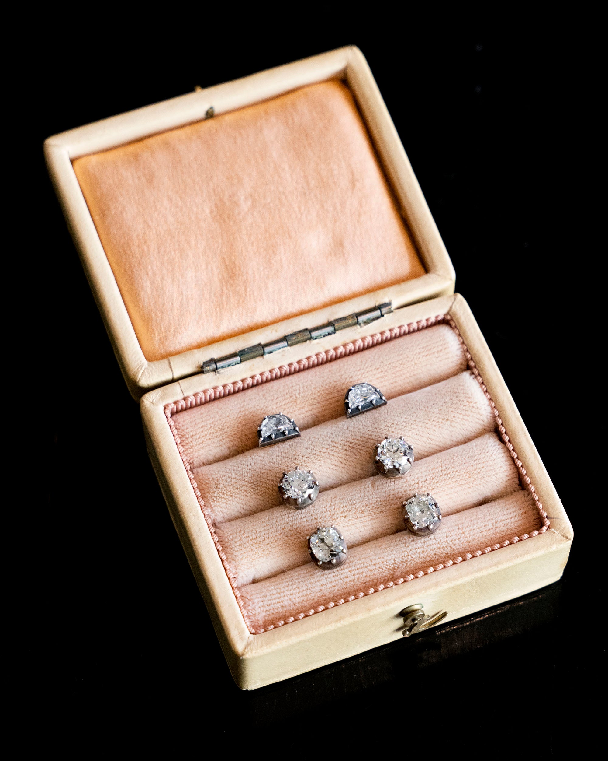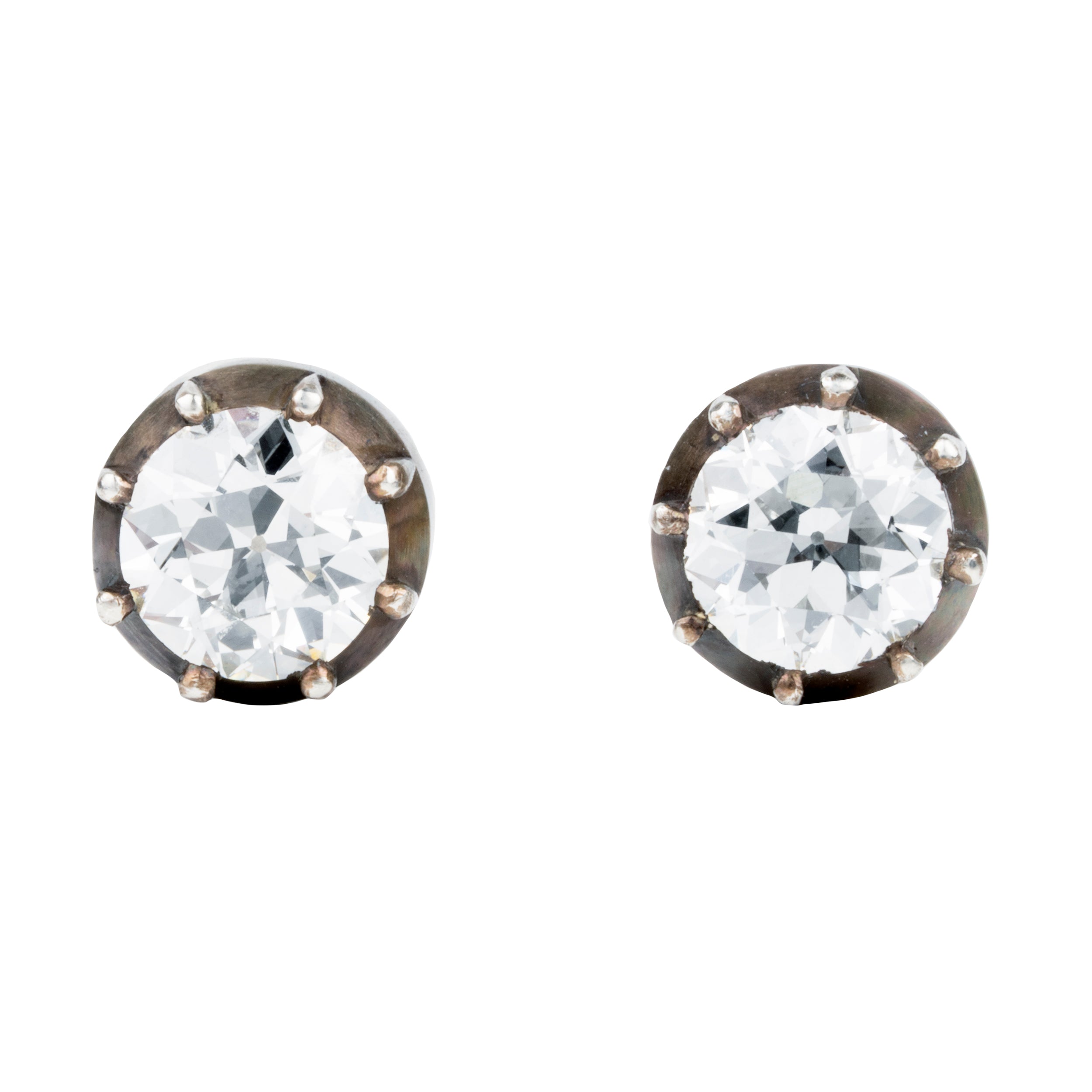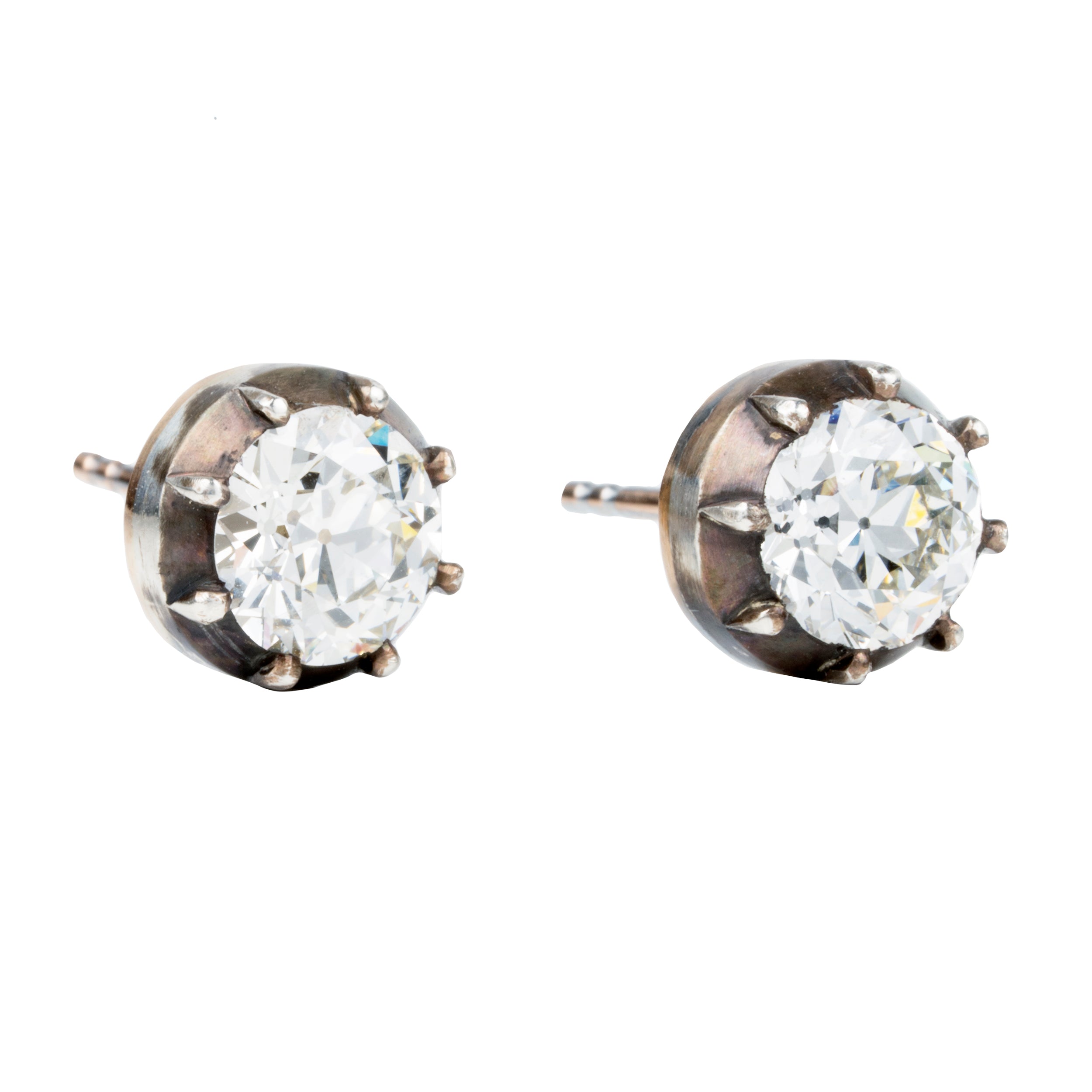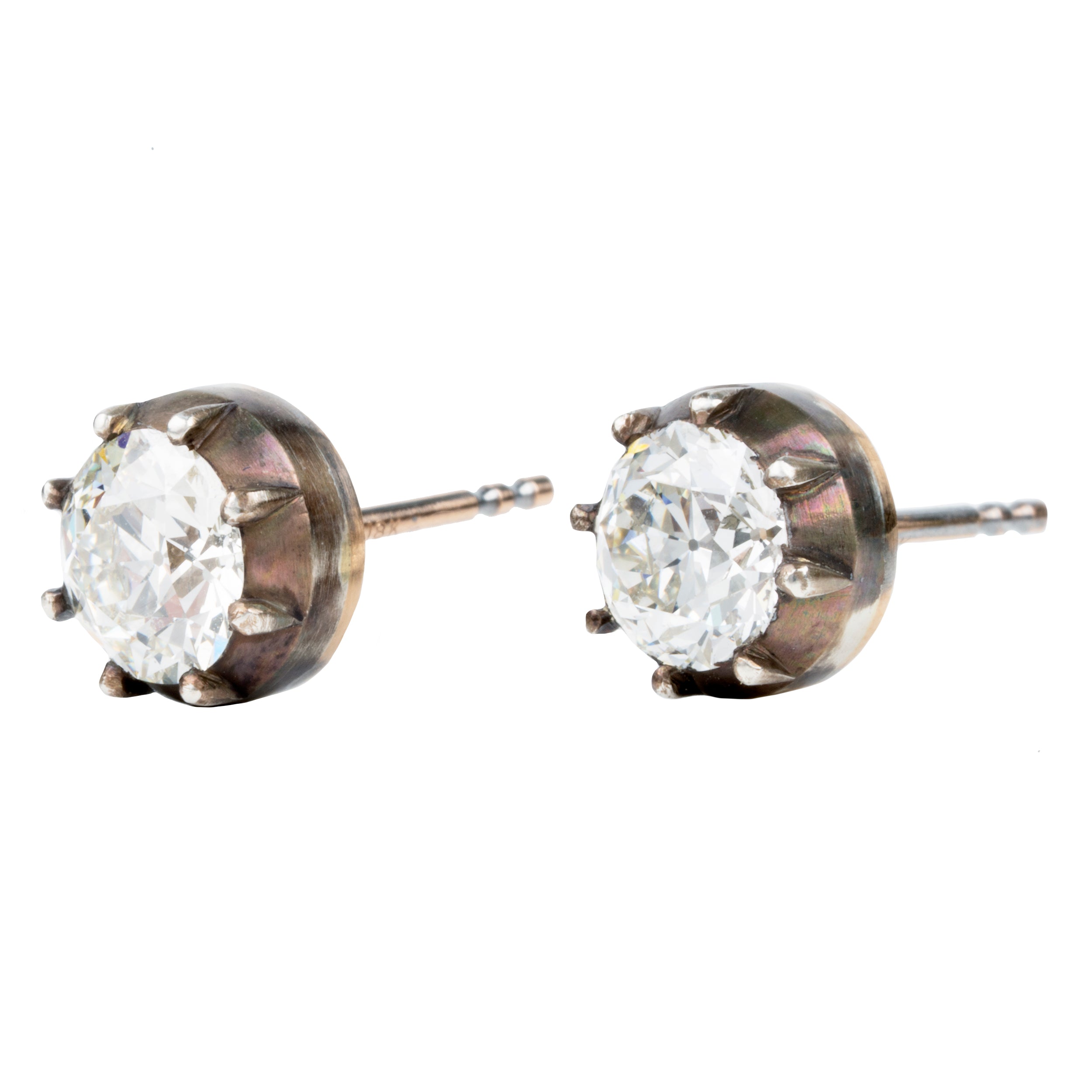 Our design for these earrings is inspired by Georgian and Victorian Era cutaway settings. Entirely hand fabricated they feature silver-topped gold, cutaway collet settings. This is a labor-intensive setting technique common in 18th and 19th century. The silver-on-gold technique is true to the rings that inspired this design and is rarely seen in modern jewelry. The earrings feature two GIA certified old European cut diamonds, 0.94 carats J color and VS1 clarity and 0.97 I color and VS2 clarity.