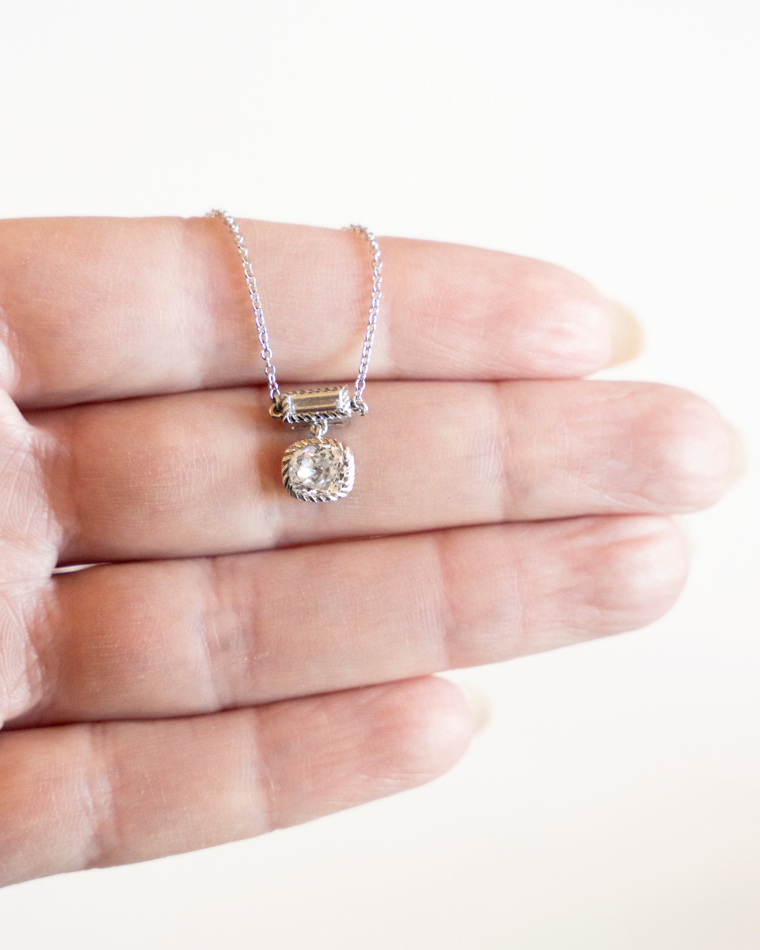 Measures .25" in length and .35" wide. Hanging on a 16" modern platinum chain.