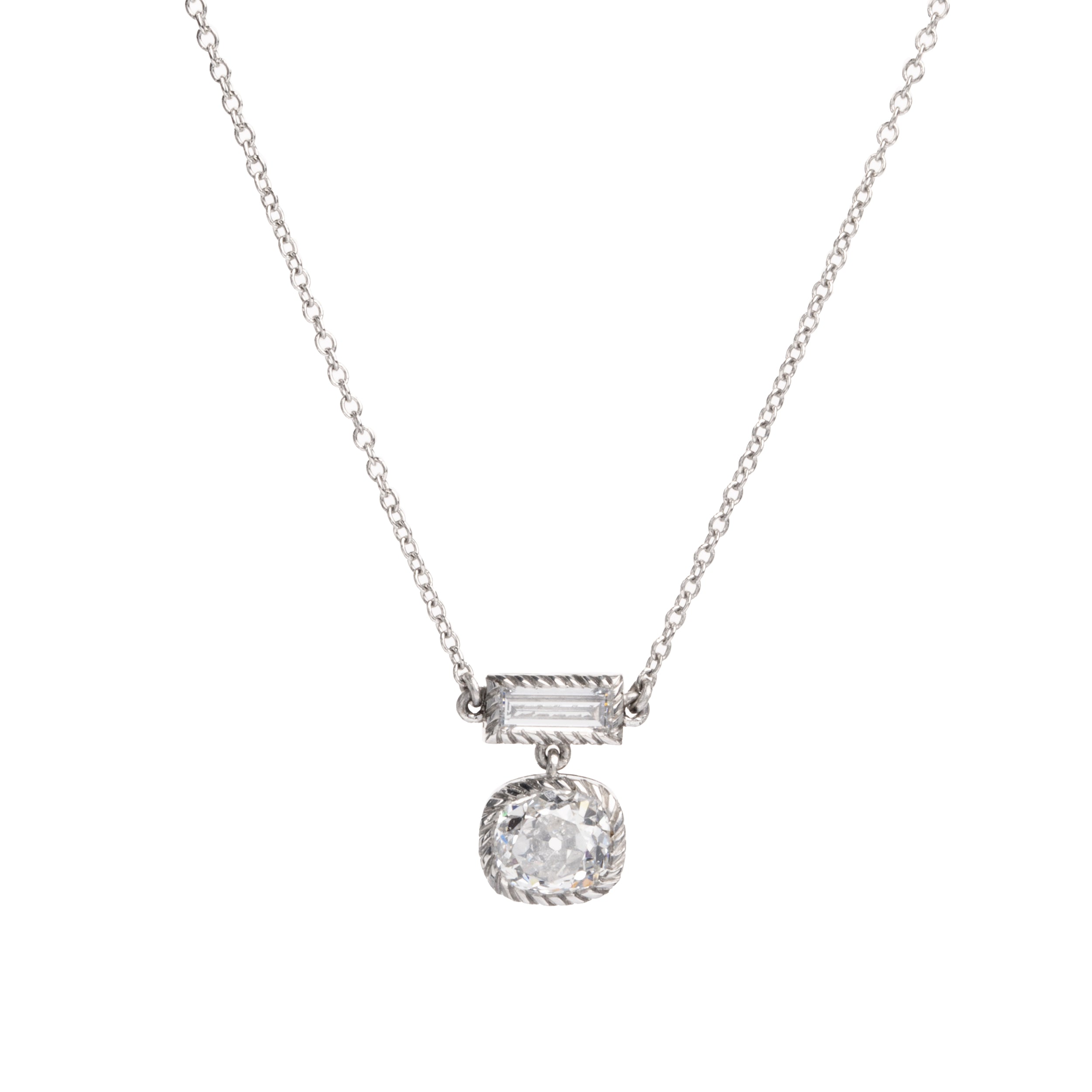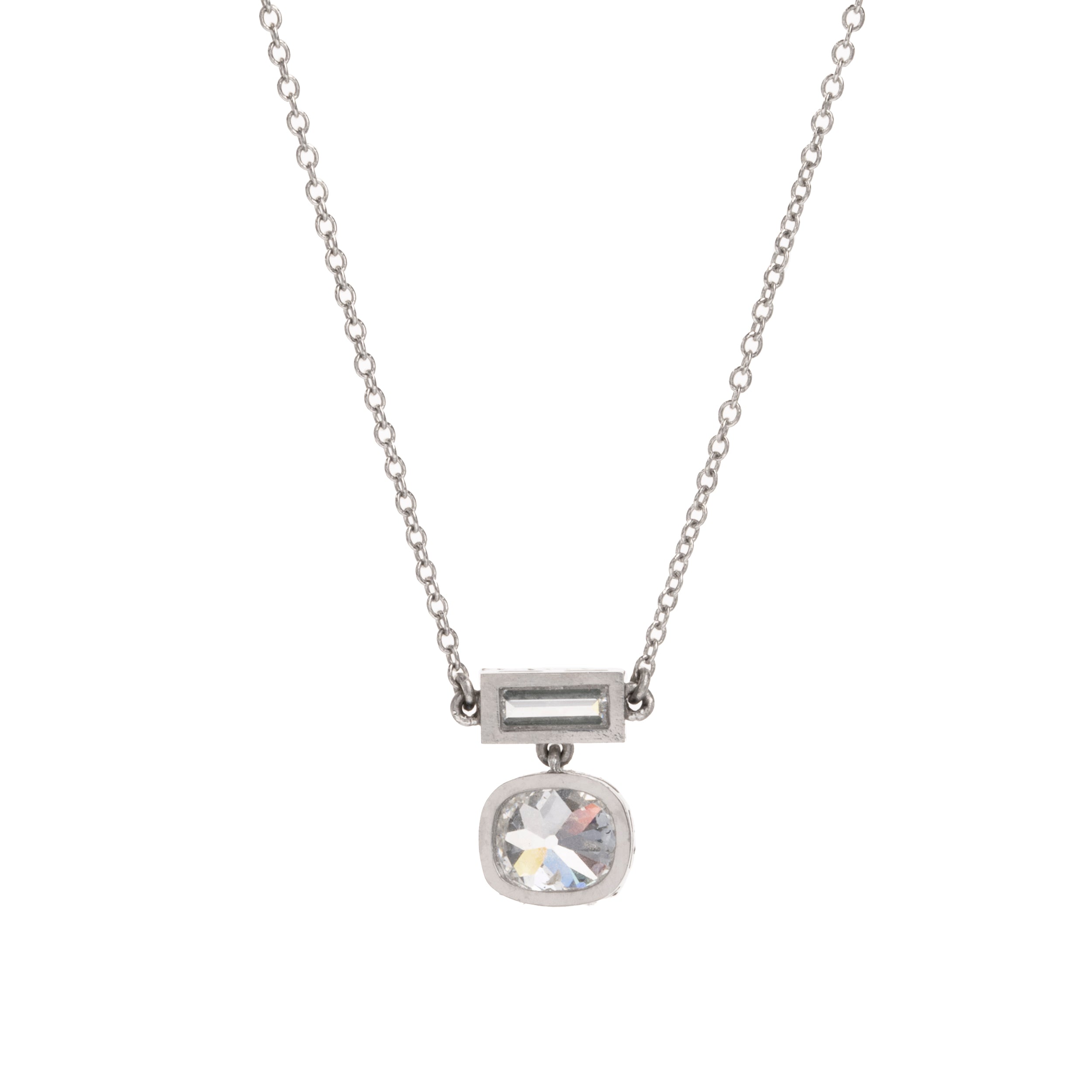 This diamond pendant features an old mine cut and baguette diamond. The old mine cut weighs approximately .89 carats, and the vintage baguette diamond weighs approximately .23 carats. Set in a delicate miligrain-edged setting that is hand-fabricated in platinum.