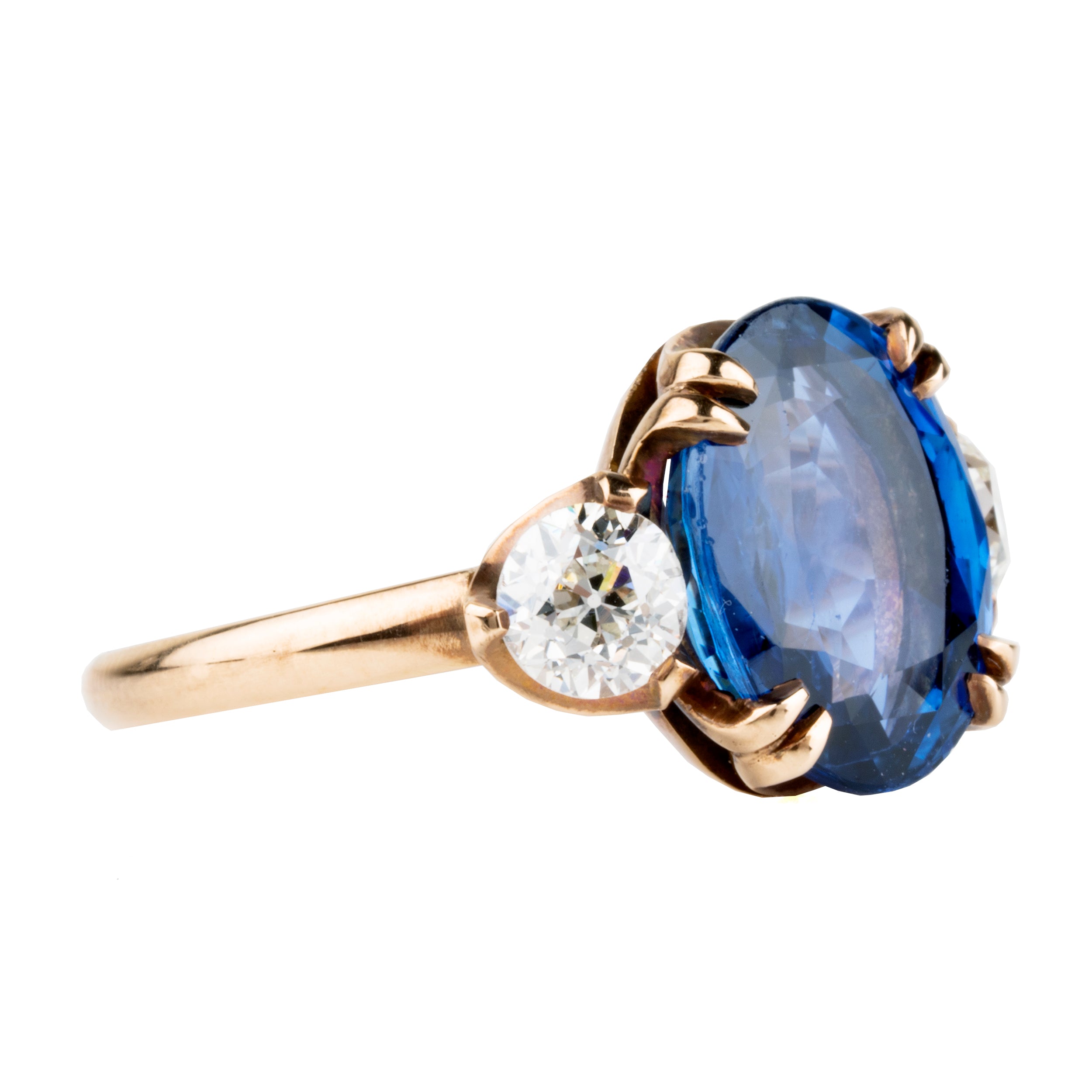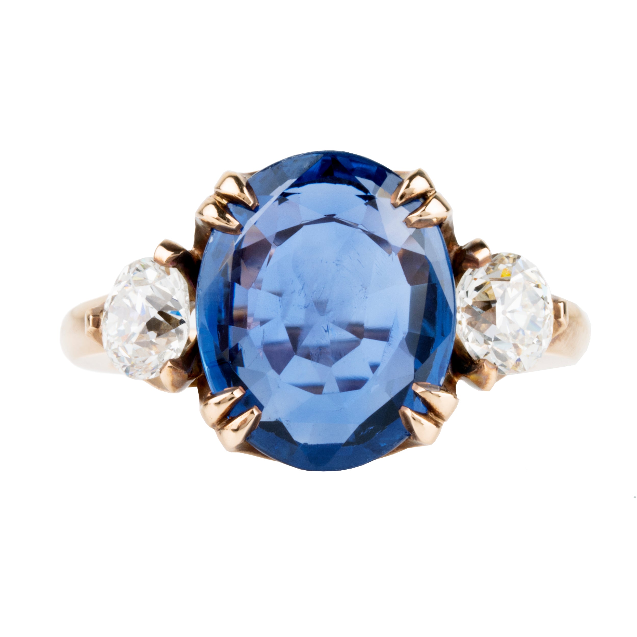 A classic three-stone arrangment, the primary stone is a 6.10-carat sapphire. The stone is certified to originate from Madagascar, with no treatment. Two antique old European cut diamonds flank the main stone, weighing .99 carats combined. The stones are estimated to be H color and VS clarity. In 18k old gold.