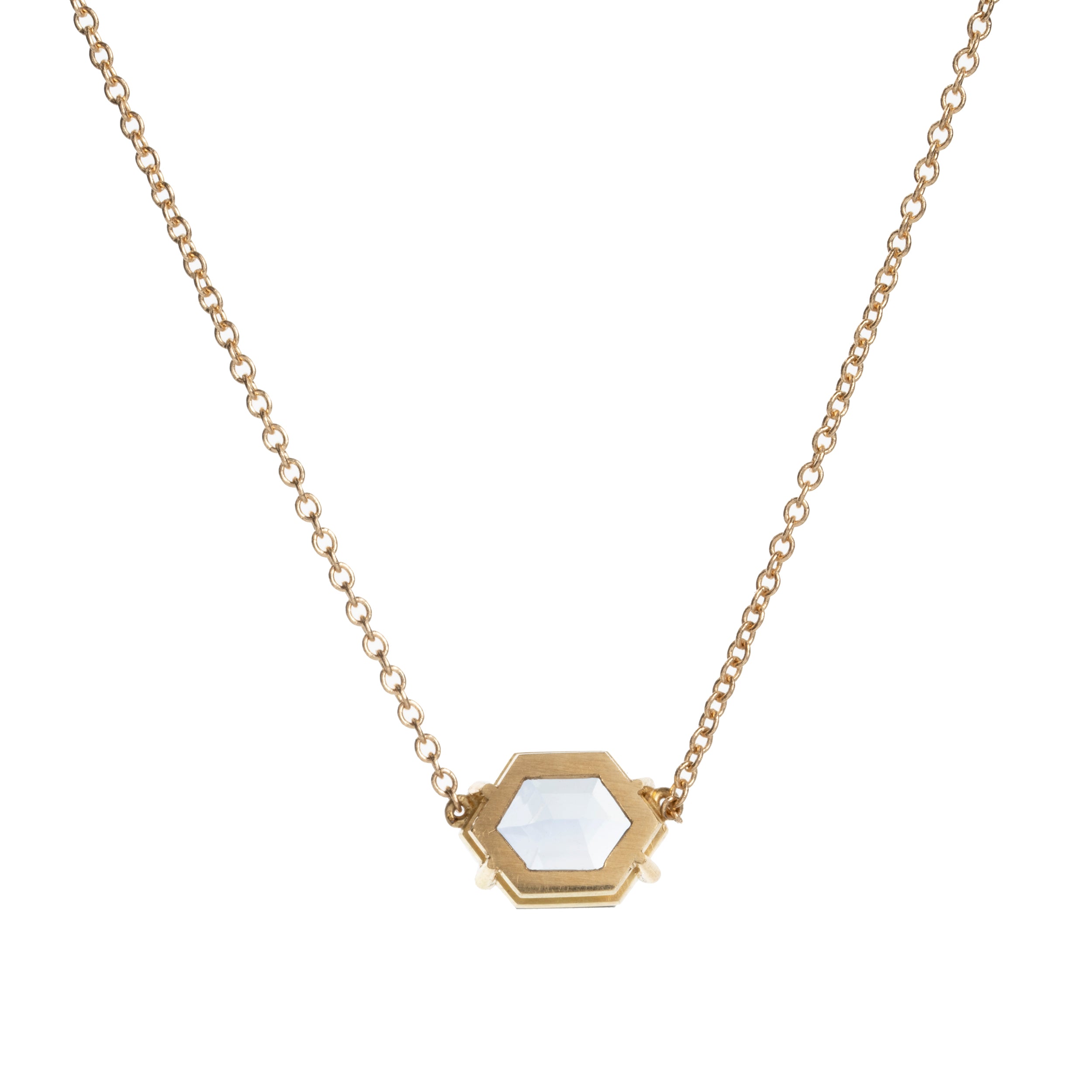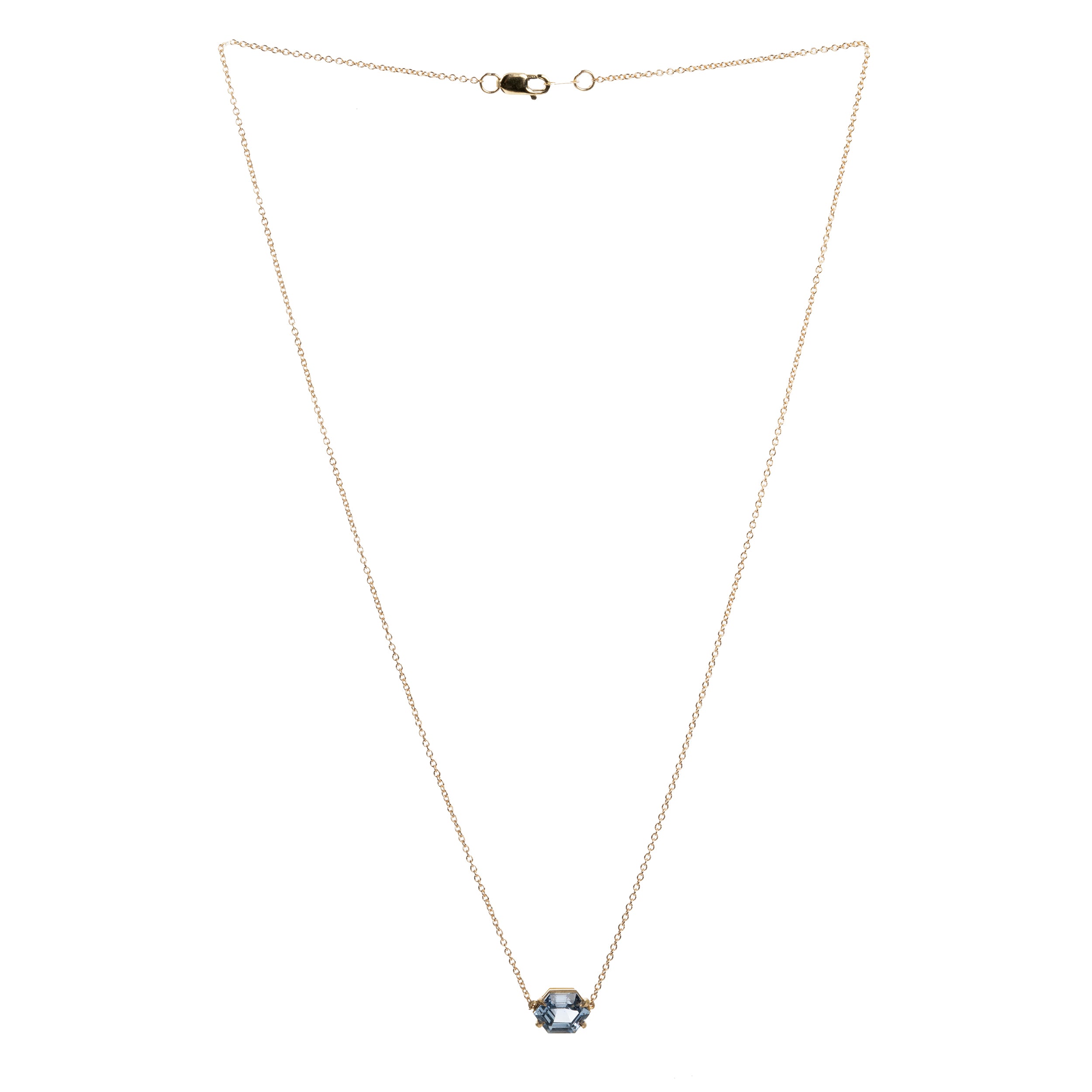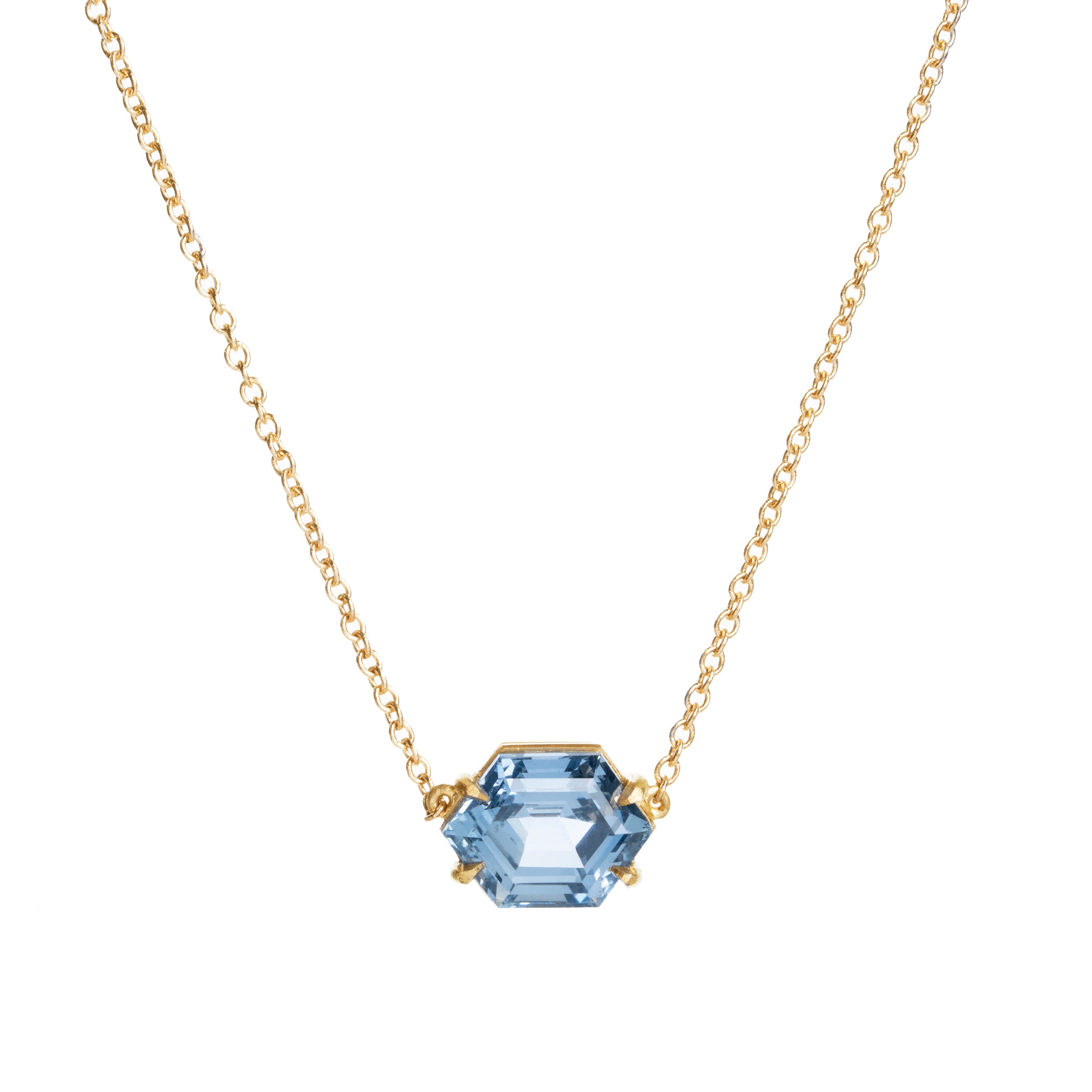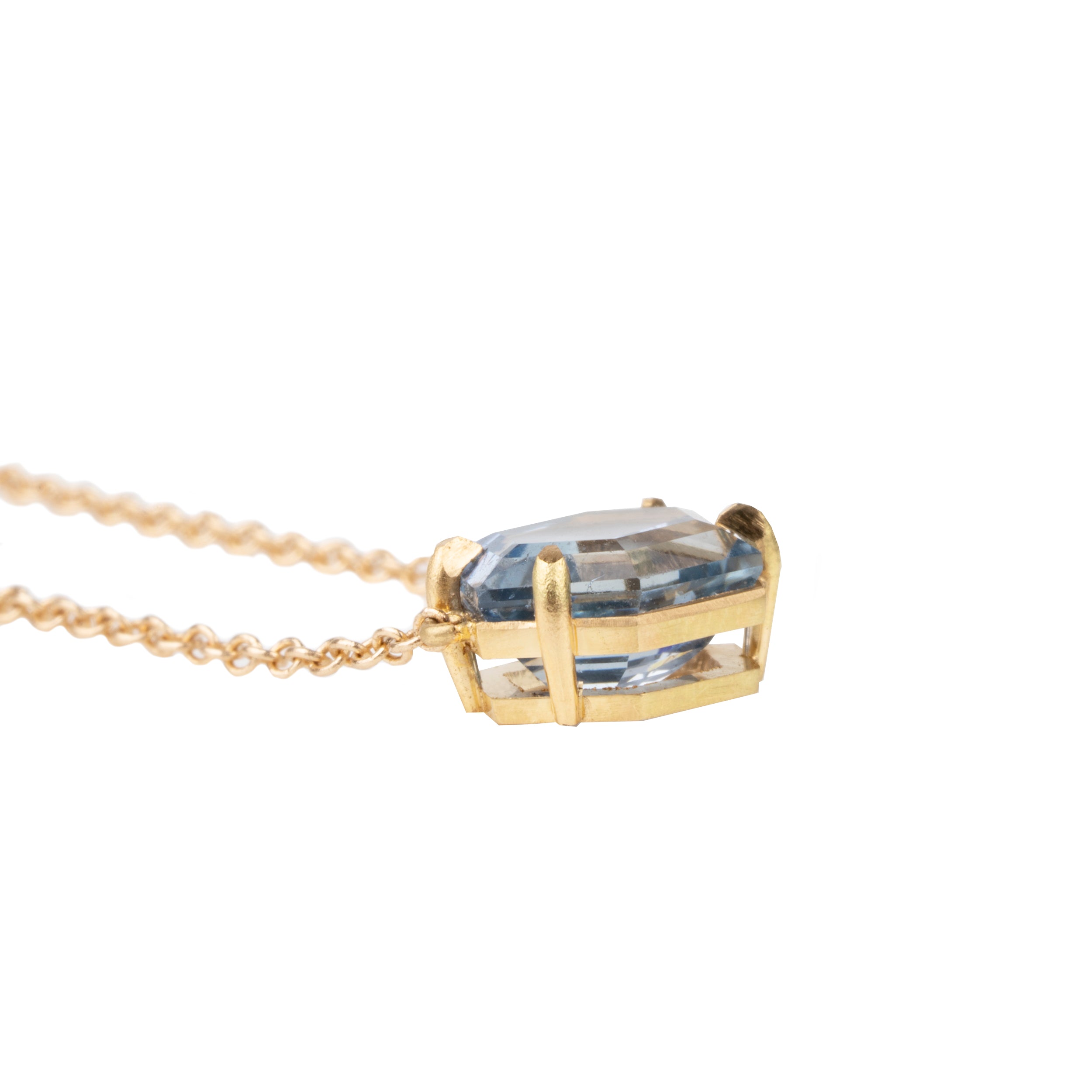 This solitaire sapphire pendant features a hexagon-shaped sapphire stone. The light blue stone weighs 2.11 carat and is certified to be Madagascan in origin, No treatment of any kind. Set in a delicate four prong setting that is hand-fabricated in solid 18k old gold.