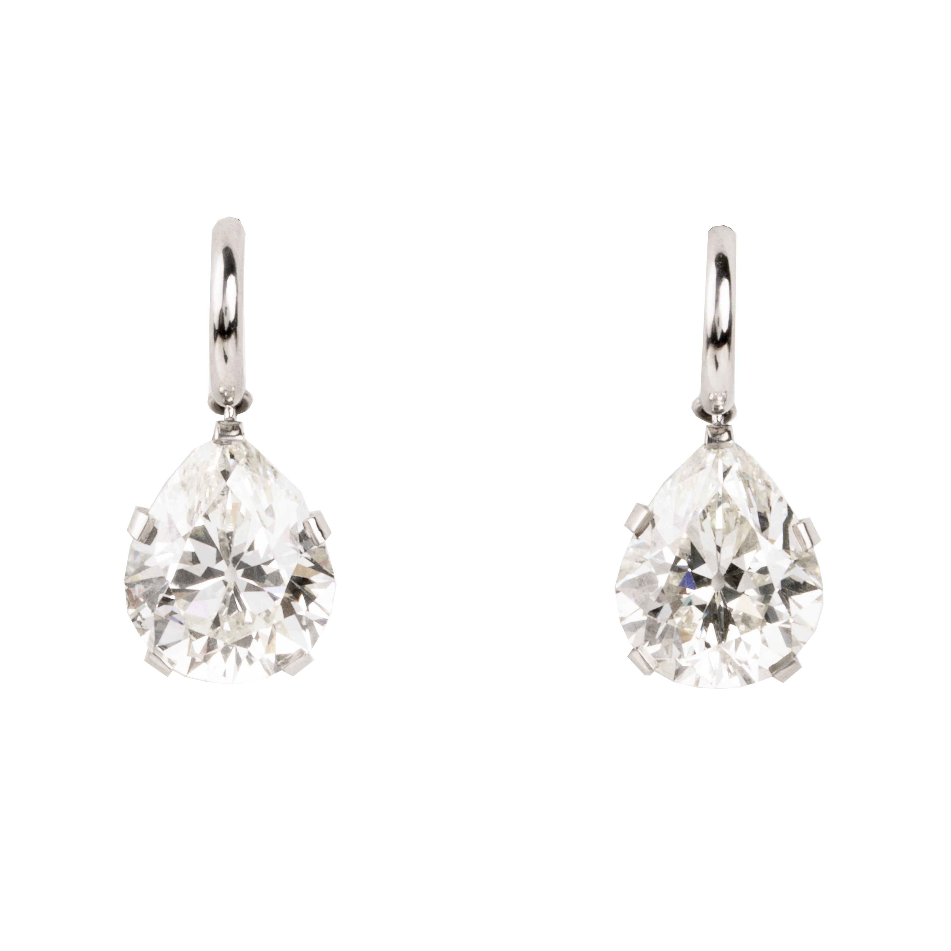 Twin Pear Shaped Diamonds have been set on simple platinum hoop earrings. Both diamonds are GIA certified to be 3.01 carats, J color, and Si1 clarity.