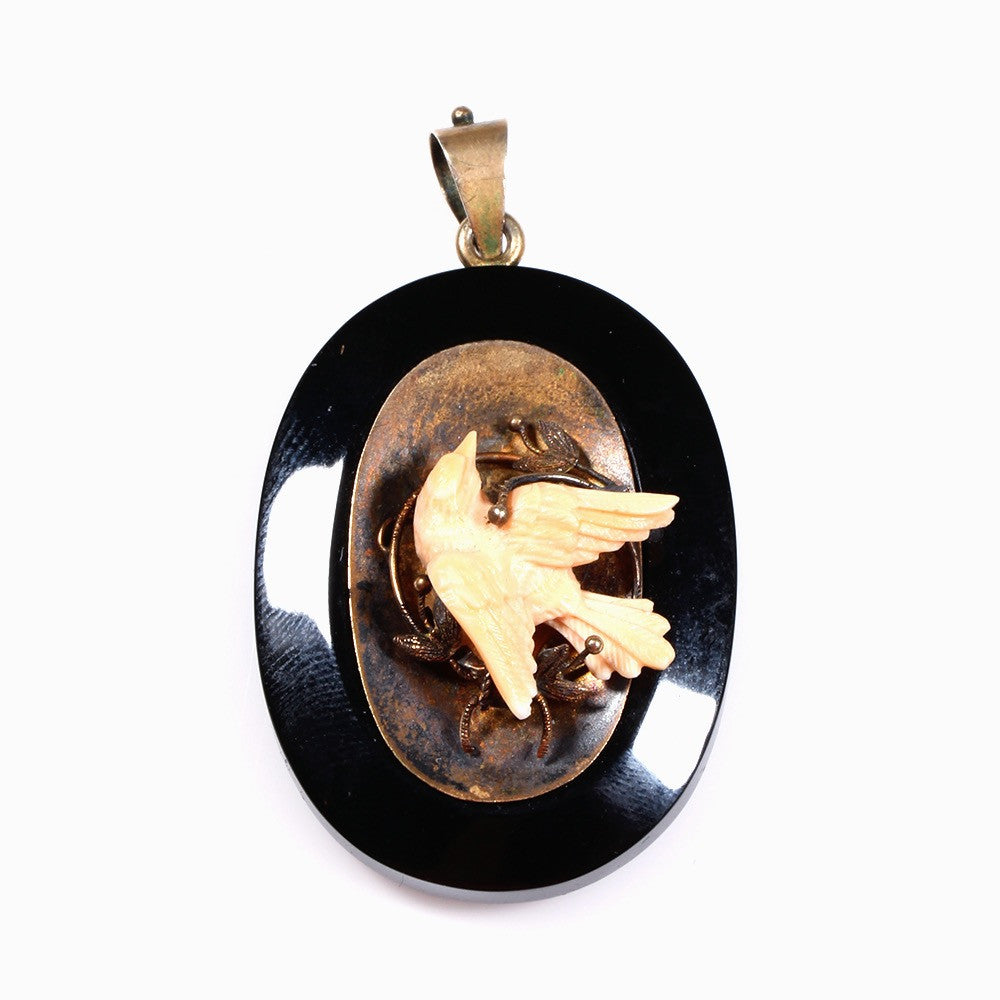 Black Onyx Locket with carved Angel skin Coral Bird in 14k Gold, circa 1870.