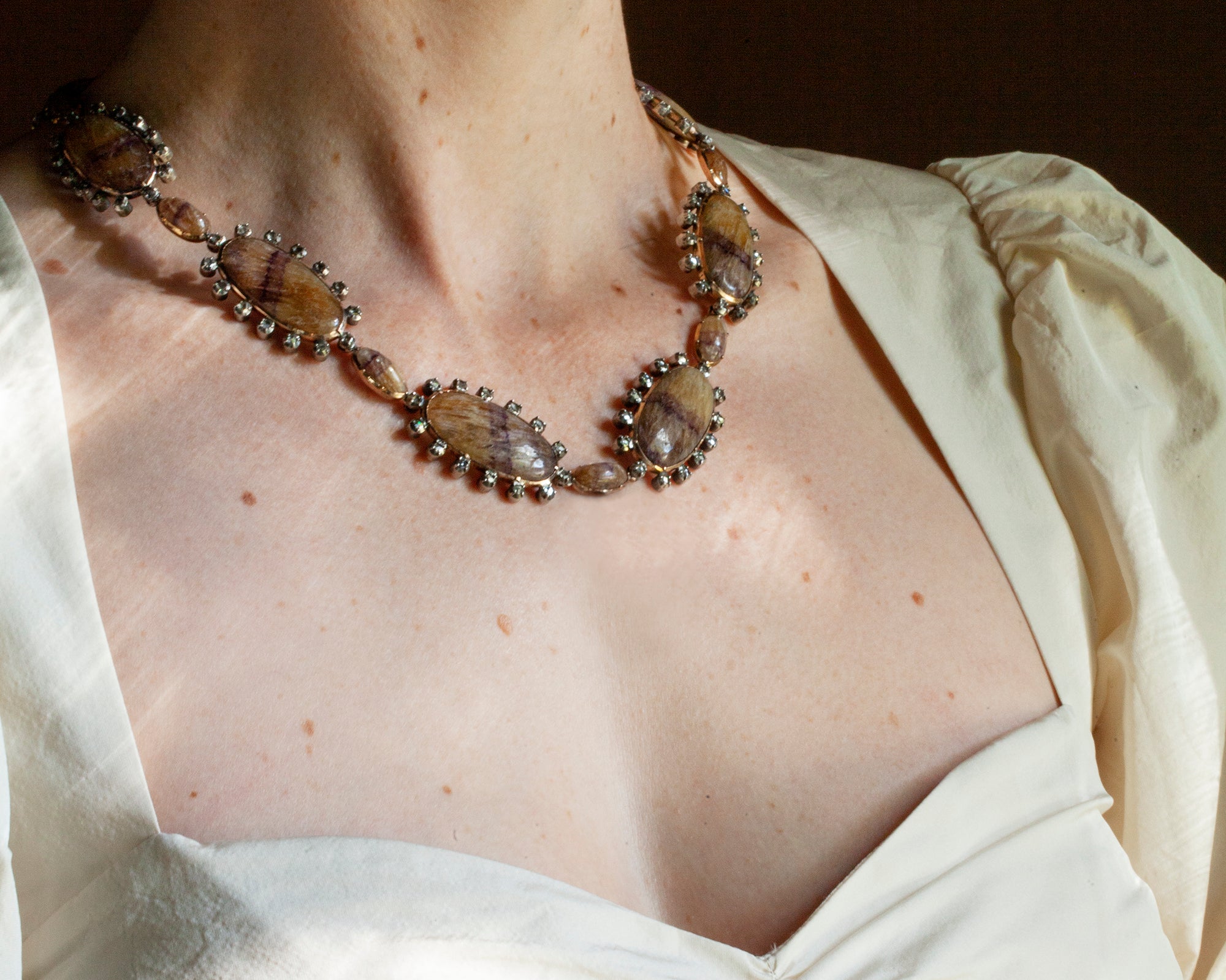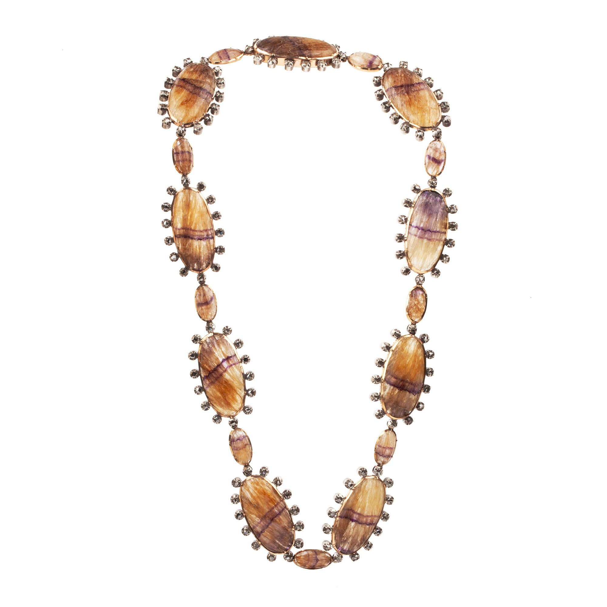 Rare Blue John stone necklace with rose cut diamonds set in silver and gold. A uniquely colored variety of fluorite, Blue John is the rarest gemstone found in Britain. In all the world it is found in one single location, a legendary cave in Derbyshire, England. The stone has been prized for its beauty since Roman times. For centuries the stone has been exported to continental Europe for jewelry and decorative art design. Hallmarks indicate this necklace is Portuguese in origin.